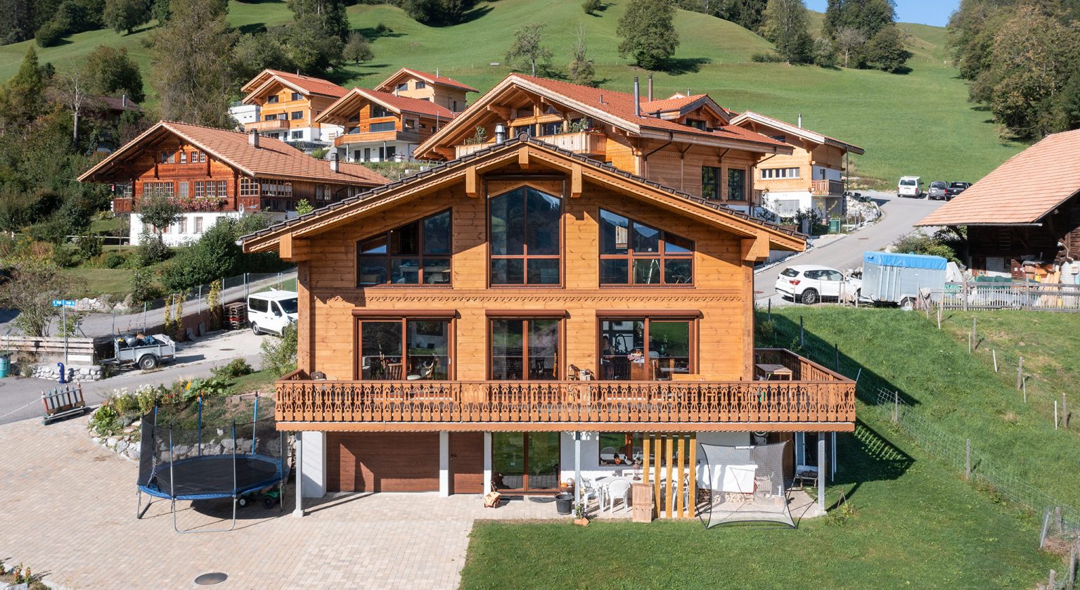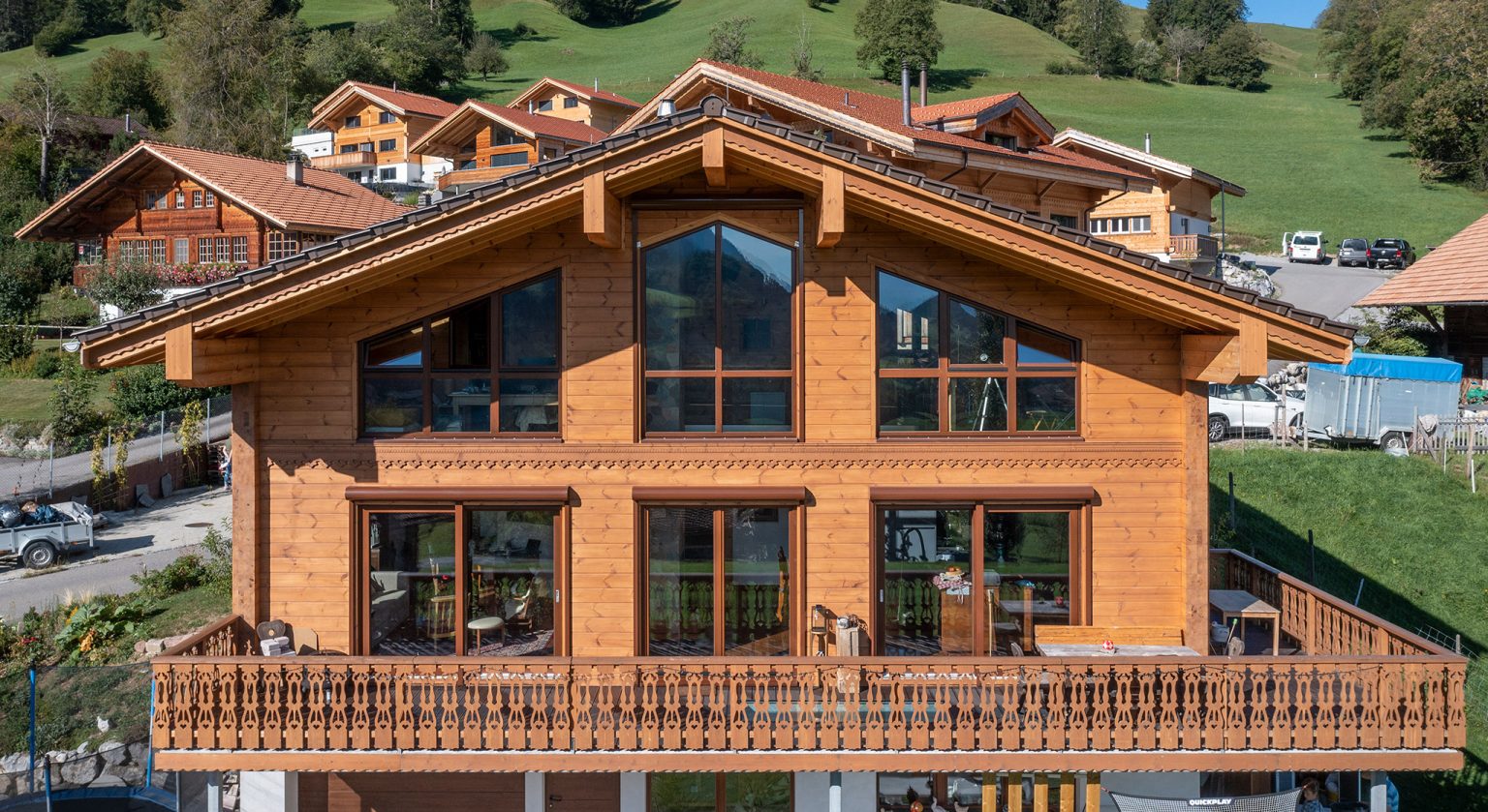 Optisch entspricht Holzhaus „Diemtigtal“ ganz der strengen, lokalen Bauvorschrift und passt sich ins Bebauungs- und Landschaftsbild ein. Vermutlich ist es das unauffälligste Fullwood Wohnblockhaus von allen Kundenhäusern, da in der Nachbarschaft ausschließlich Chalet-Häuser im gleichen Stil stehen. Dennoch identifiziert man es auf Grund seiner speziellen Blockwände sofort als Fullwood Wohnblockhaus. Die großen Fensterflächen am verglasten Giebel Richtung Tal und die traditionellen Holzverzierungen unter den Fenstern des Dachgeschosses und am Balkongeländer machen das schöne Chalet zu einem unverwechselbaren Highlight unter den anderen schönen Chalet-Häusern im Dorf.