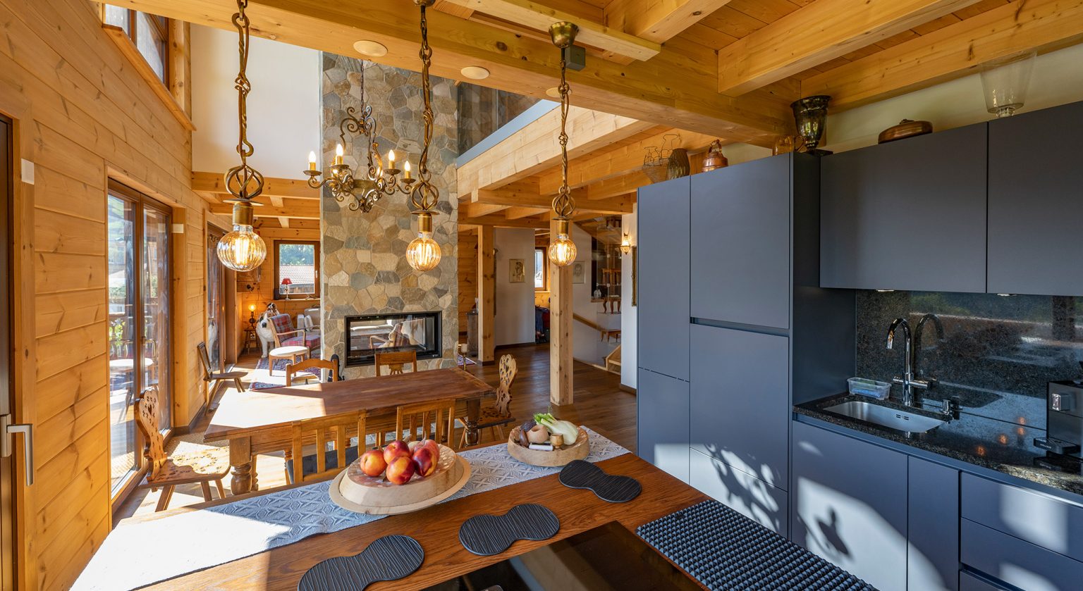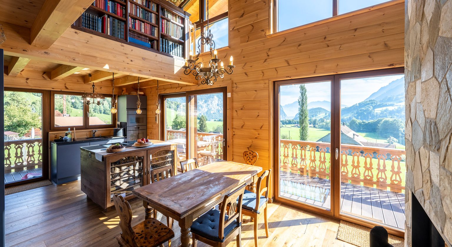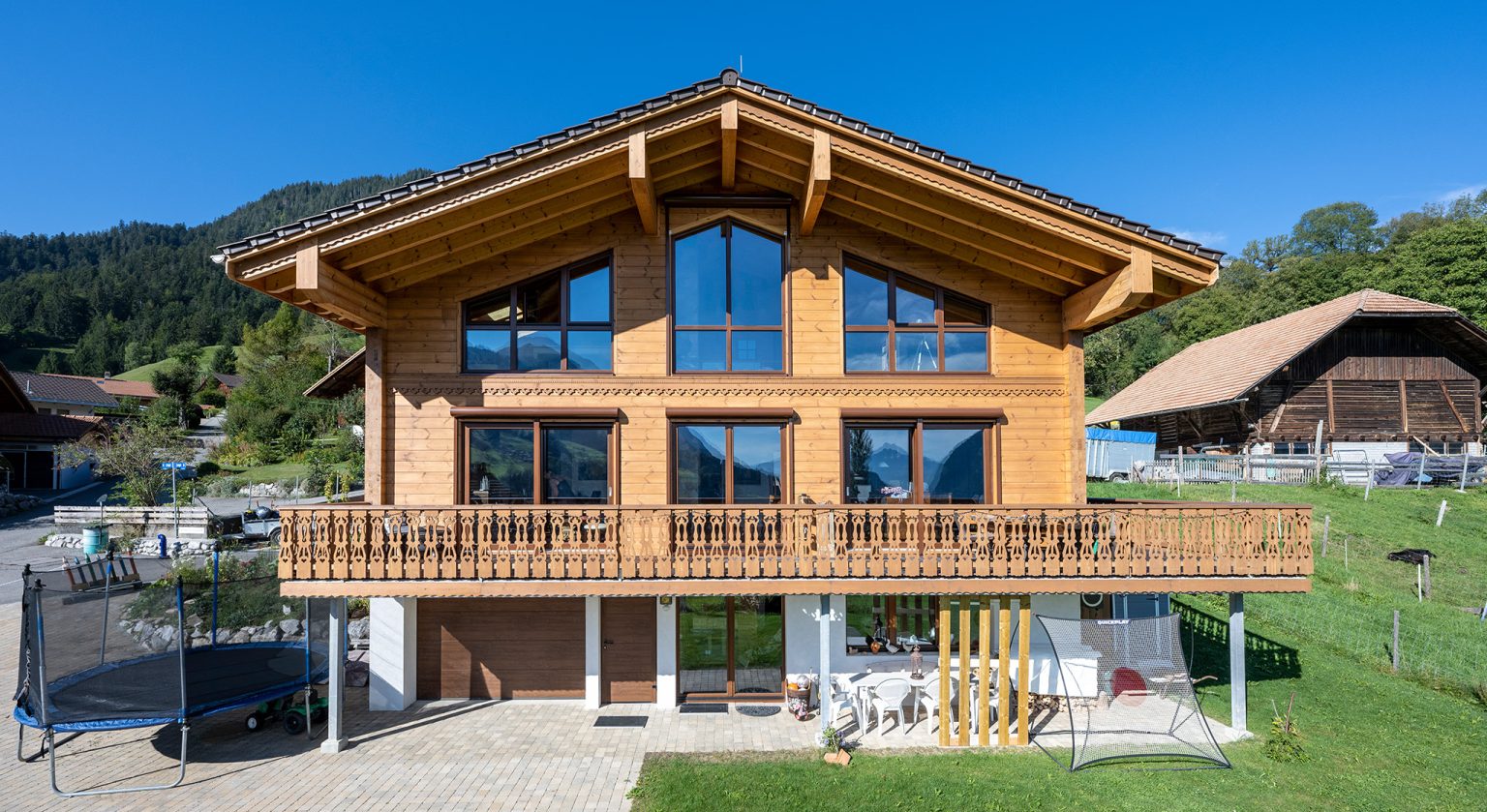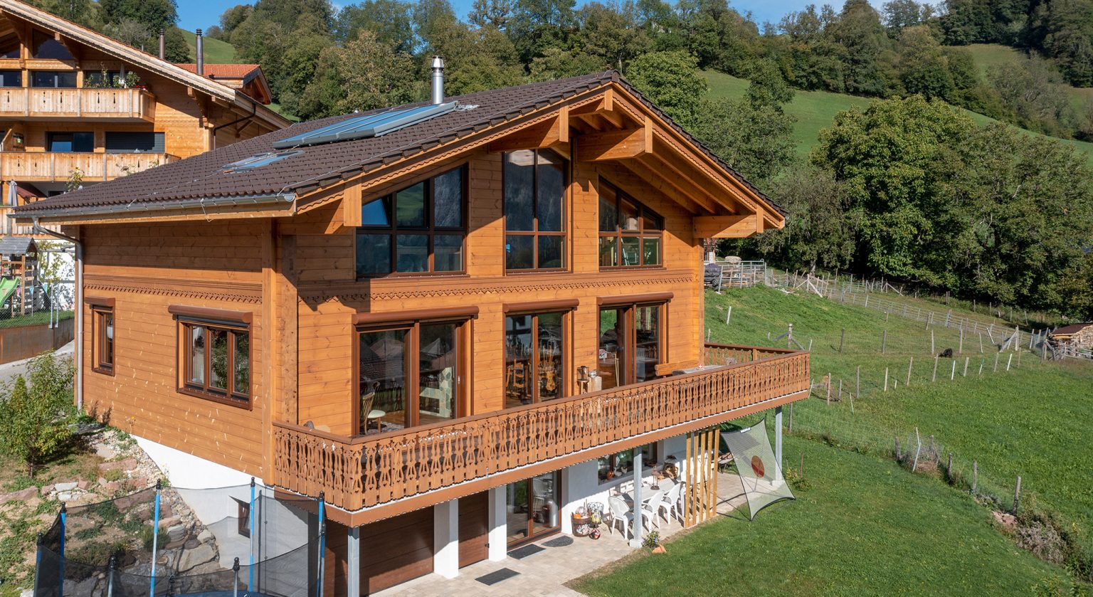 Nicht nur genaue Vorstellungen in Bezug auf den Hausbau hatte die Eigentümerfamilie von Holzhaus „Diemtigtal“, auch der Ort, wo gebaut werden sollte, musste einige Kriterien erfüllen. „Wir kannten die Gegend hier nicht, wollten aber unbedingt ein Chalet in den Bergen. Nicht zu abgelegen, aber inmitten einer Bergkulisse. Einen Hauskauf mit Rennovation haben wir sehr schnell wegen potenzieller versteckter Kosten ausgeschlossen und uns auf Grundstückssuche begeben. Maximal eine Autostunde von Bern sollte sich der Bauort befinden, erreichbar ohne zu kurvige Straßen, denn einigen Familienmitgliedern wird es sonst im Auto schlecht und außerdem mit öffentlichen Verkehrsmitteln zu erreichen. Der Blick ins Grüne und ins Tal war natürlich besonders ausschlaggebend.“, zählt die Hauseigentümerin auf. Von vornherein setzte man auf einen natürlichen und erneuerbaren Baustoff, deshalb kam nur ein echtes Holzhaus in nachhaltiger Bauweise in Frage. „Die Holzhäuser von Fullwood Wohnblockhaus haben wir dann in einer Hauszeitschrift entdeckt und waren gleich angetan. Also haben wir eins der Musterhäuser besucht und danach keine Minute mehr gezögert.“, so die Bauherrin.