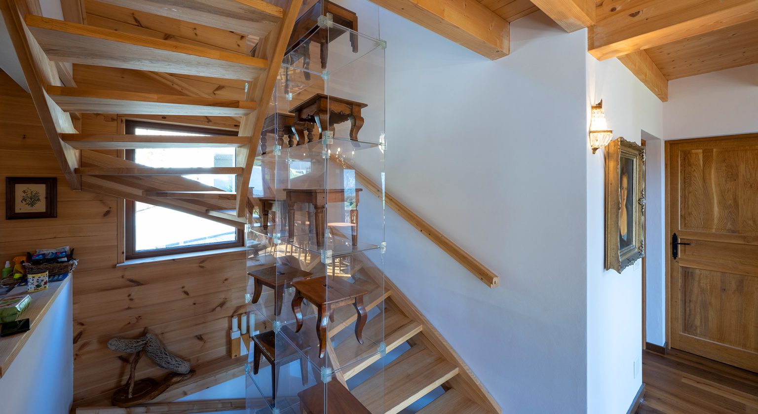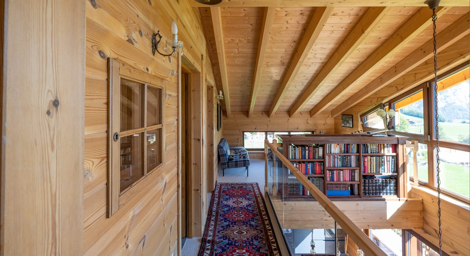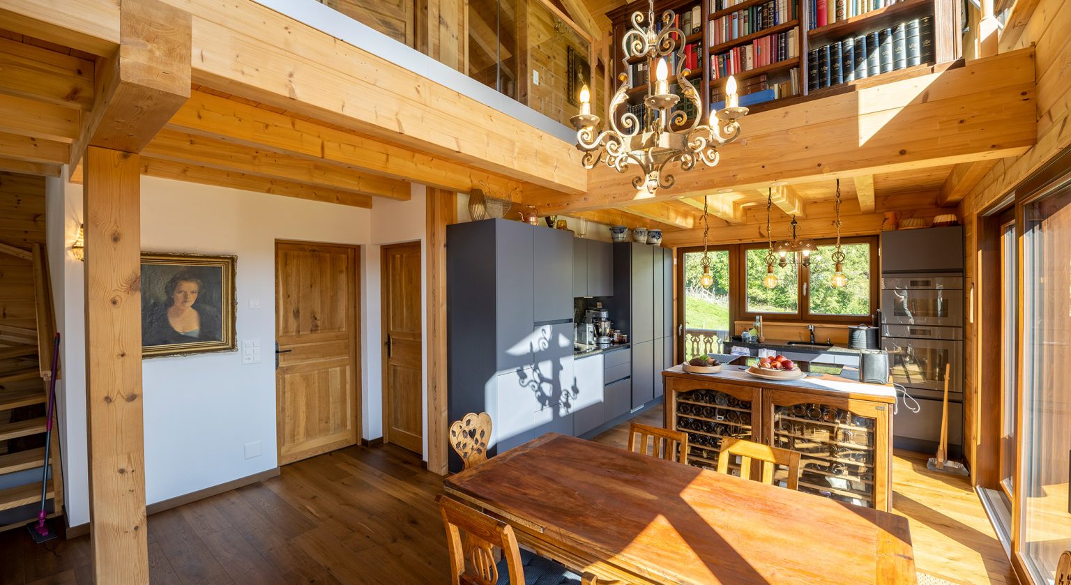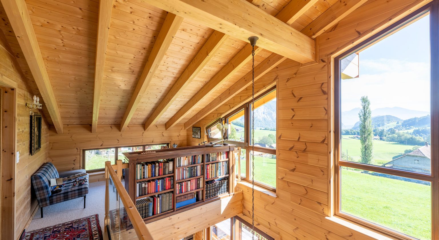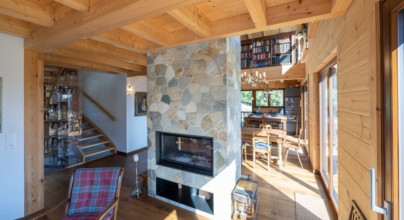 Hinsichtlich seiner schlichten, geradlinigen Architektur entspricht Holzhaus „Diemtigtal“ ganz den örtlichen Vorgaben. Die Raumaufteilung im Haus ist jedoch ganz frei und individuell gewählt. Dabei ist die Kombination von Offenheit und Privatsphäre perfekt geglückt. Das Erdgeschoss betritt man von der Rückseite des Hauses und gelangt in ein halb separiertes Entrée, das in den großzügigen Wohn-/Ess-/Kochbereich übergeht. Über dem Esszimmer erstreckt sich bis zur Firstpfette ein hoher Luftraum, welcher den imposanten Sichtdachstuhl in Szene setzt. Zwischen Wohnzimmer und Küche/Esszimmer befindet sich ein Firsthohes Tunnel-Cheminée, welches die genannten Bereiche auf exklusive und optisch sehr ansprechende Weise voneinander trennt. Die warmen Holzwände werden von weiß tapezierten Trennwänden ergänzt, die ein Plus an Helligkeit und Leichtigkeit ins Haus bringen. Ein Schlafzimmer und ein Badezimmer komplettieren das Raumprogramm im Erdgeschoss. Über eine offene Holztreppe geht man hinauf ins Dachgeschoss. Dort verbindet eine großflächige Galerie die einzelnen Privaträume der Hausbewohner miteinander. Das sind: drei Schlafzimmer, eins davon mit angeschlossener Ankleide; ein großes Badezimmer mit Wanne und ein Gäste-WC. Des Weiteren befindet sich eine kleine Bibliothek mit gemütlichem Lesebereich auf der Galerie. Von unten ist die Galerie einsehbar, da dort ein Geländer aus durchsichtigen Glasscheiben mit Holzhandlauf montiert wurde. Dies sorgt für noch mehr Transparenz und Offenheit im Haus.