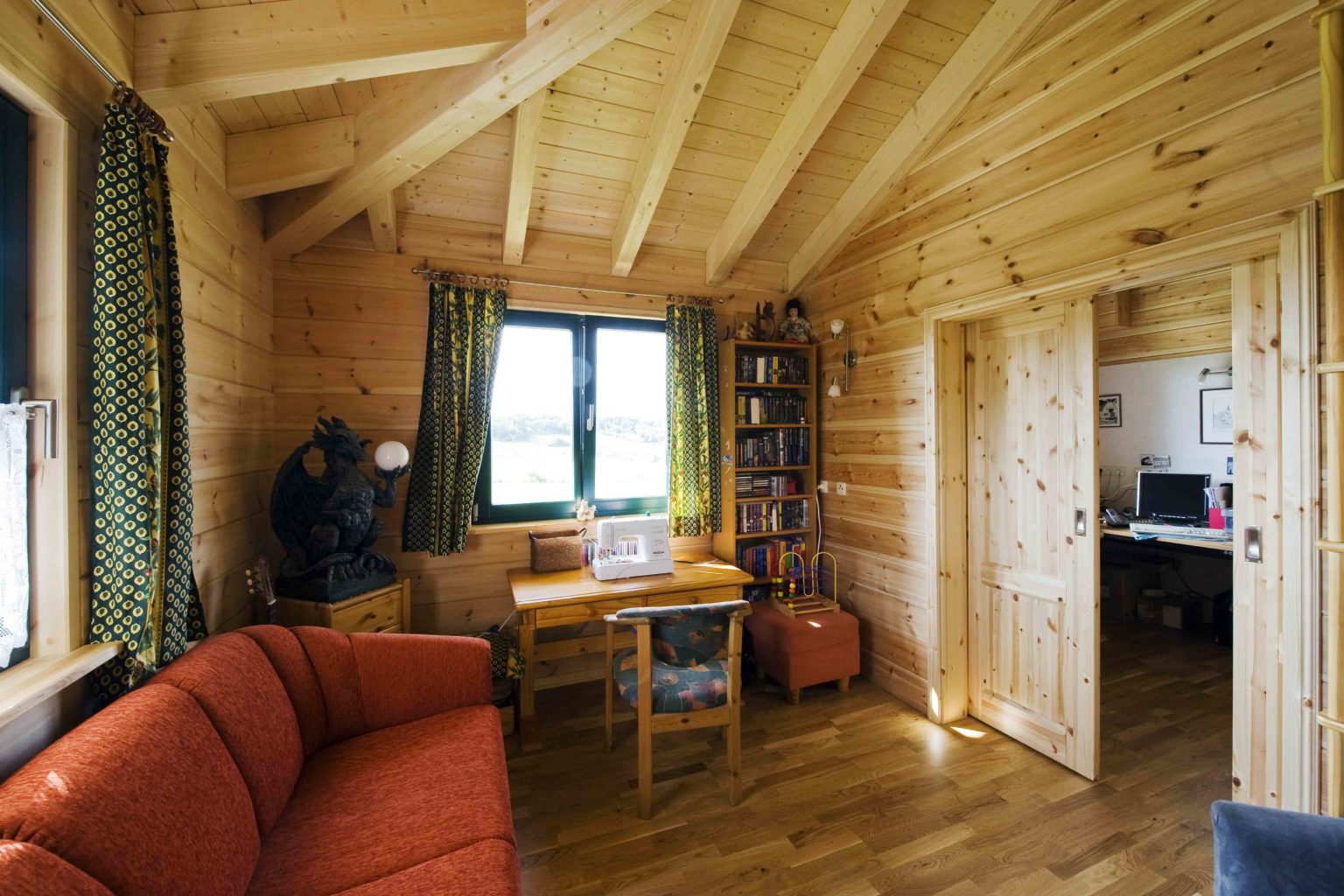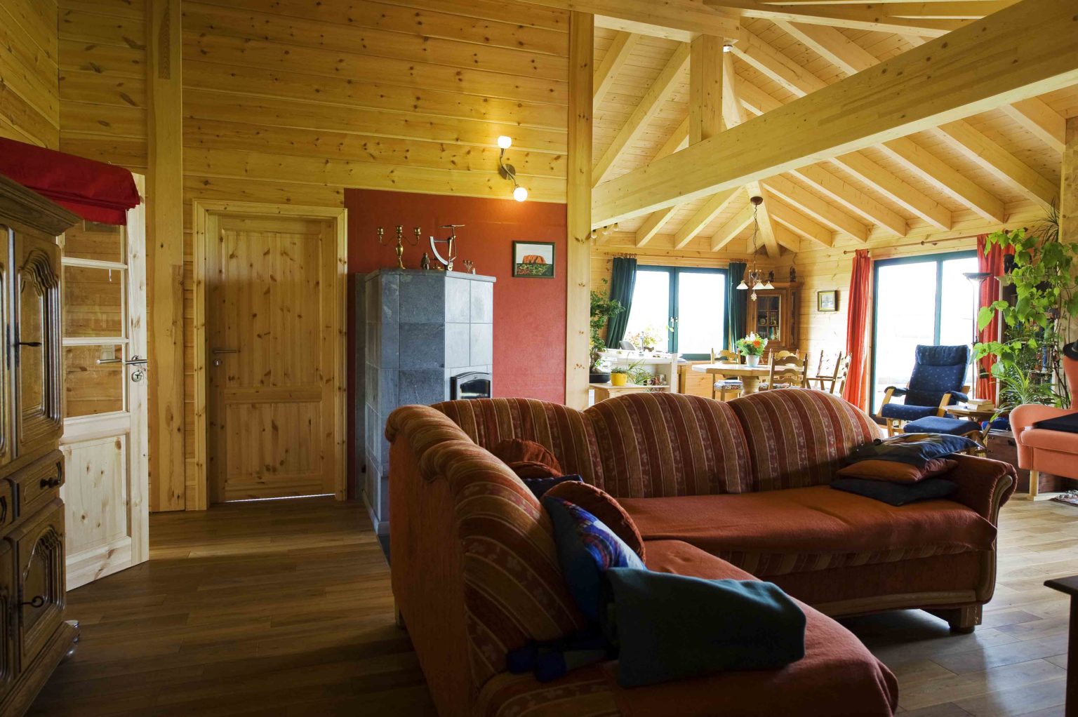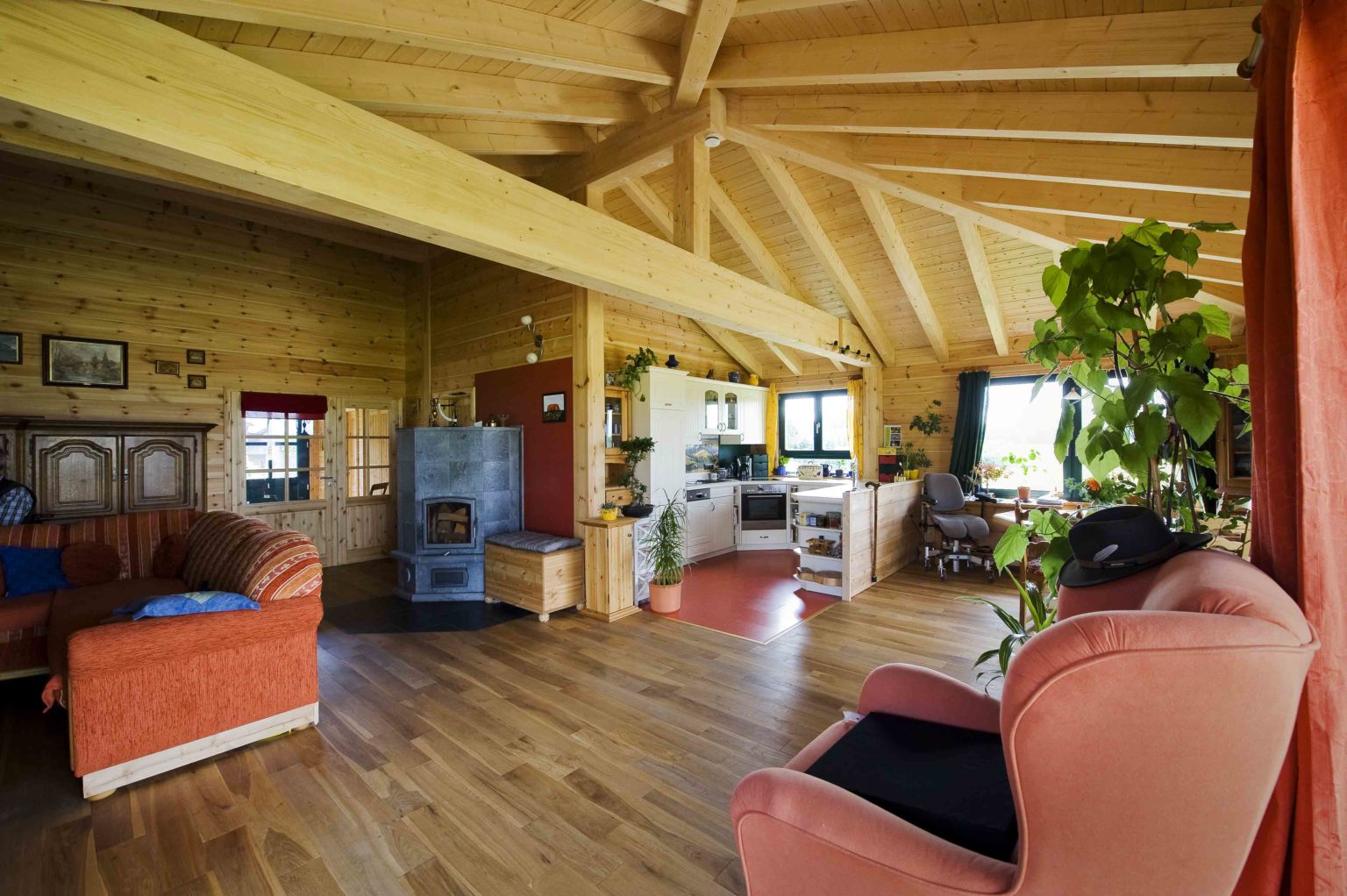 Während sie sich mit Nordischen Kiefern umgeben, fiel die Wahl bei den Bodenbelägen hauptsächlich auf widerstandsfähige Natur geölte Deutsche Eiche, die auch besonderen Belastungen hervorragend standhält. Außerdem wollte sich das Paar nicht von den lieb gewonnenen Eichenmöbeln trennen, die nach der Heirat als Anschaffung fürs Leben getätigt worden waren. Das Maß für die Länge der Wohnzimmerwand zum Hauswirtschaftsraum gab deshalb der vorhandene Schrank vor. Die zum Wohnraum offene Küche wurde mit Linoleum ausgelegt, das durch seine rote Farbe optisch einen eigenen Bereich markiert. Im, natürlich Rollstuhl gerechten, Badezimmer schmeichelt warmes Korkparkett den Füßen. Der Dielenboden erhielt fast schwarze Feinsteinfliesen. Beheizt wird das gesamte Holzhaus mit dem sich in der Hausmitte befindenden, großen Specksteinofen im offenen Wohnbereich. Zwar verfügt das Holzhaus über eine Fußbodenheizung, die theoretisch durch einen mit dem Ofen verbundenen Wärmetauscher gespeist werden könnte, doch war dies bislang nicht notwendig. Die Strahlungswärme des Ofens gibt genug wohlige Wärme ab.