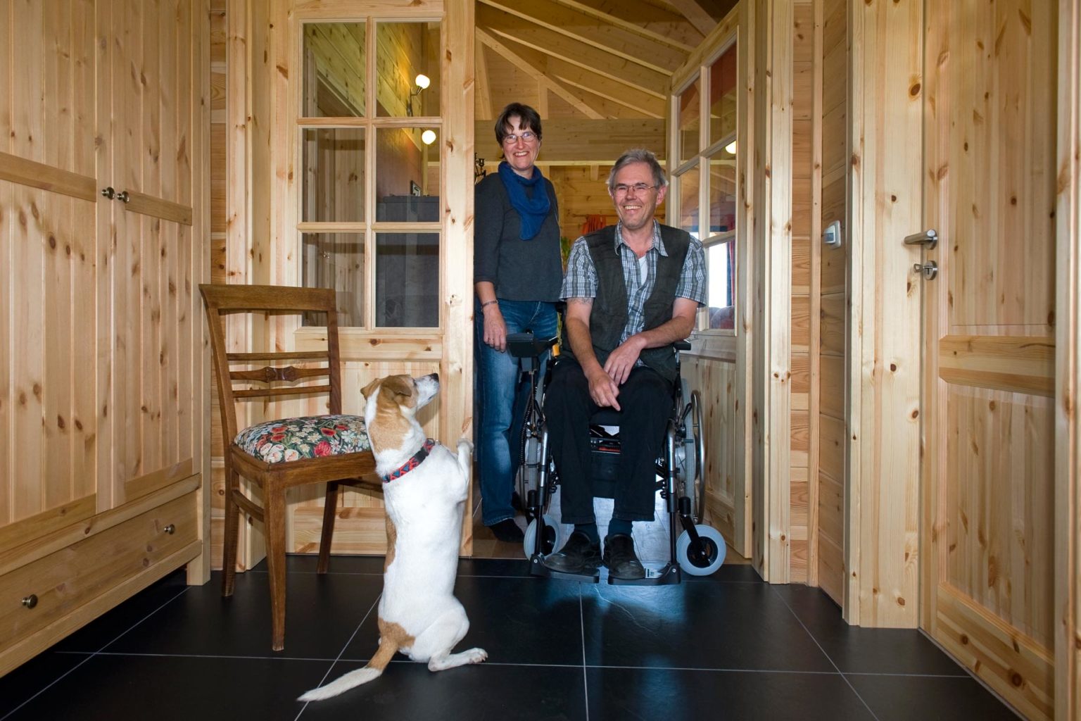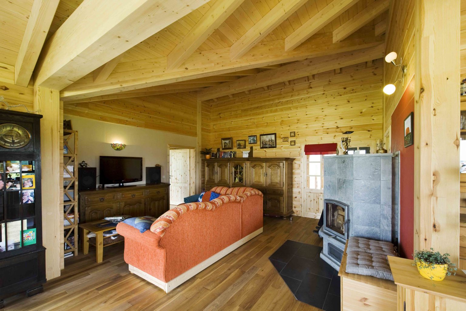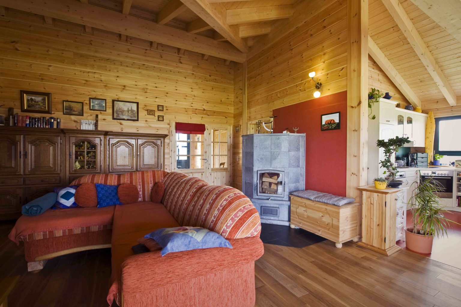 Während sie sich mit Nordischen Kiefern umgeben, fiel die Wahl bei den Bodenbelägen hauptsächlich auf widerstandsfähige Natur geölte Deutsche Eiche, die auch besonderen Belastungen hervorragend standhält. Außerdem wollte sich das Paar nicht von den lieb gewonnenen Eichenmöbeln trennen, die nach der Heirat als Anschaffung fürs Leben getätigt worden waren. Das Maß für die Länge der Wohnzimmerwand zum Hauswirtschaftsraum gab deshalb der vorhandene Schrank vor. Die zum Wohnraum offene Küche wurde mit Linoleum ausgelegt, das durch seine rote Farbe optisch einen eigenen Bereich markiert. Im, natürlich Rollstuhl gerechten, Badezimmer schmeichelt warmes Korkparkett den Füßen. Der Dielenboden erhielt fast schwarze Feinsteinfliesen. Beheizt wird das gesamte Holzhaus mit dem sich in der Hausmitte befindenden, großen Specksteinofen im offenen Wohnbereich. Zwar verfügt das Holzhaus über eine Fußbodenheizung, die theoretisch durch einen mit dem Ofen verbundenen Wärmetauscher gespeist werden könnte, doch war dies bislang nicht notwendig. Die Strahlungswärme des Ofens gibt genug wohlige Wärme ab.