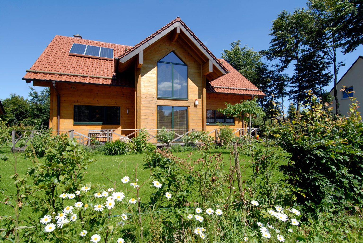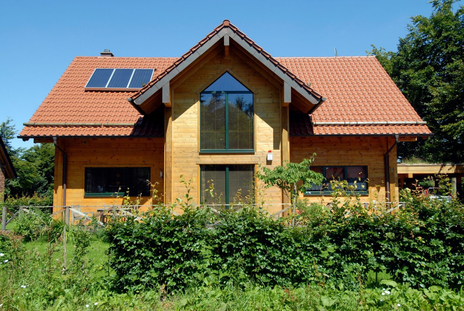 Symmetrie und Geradlinigkeit ergeben ein harmonisches Holzhaus