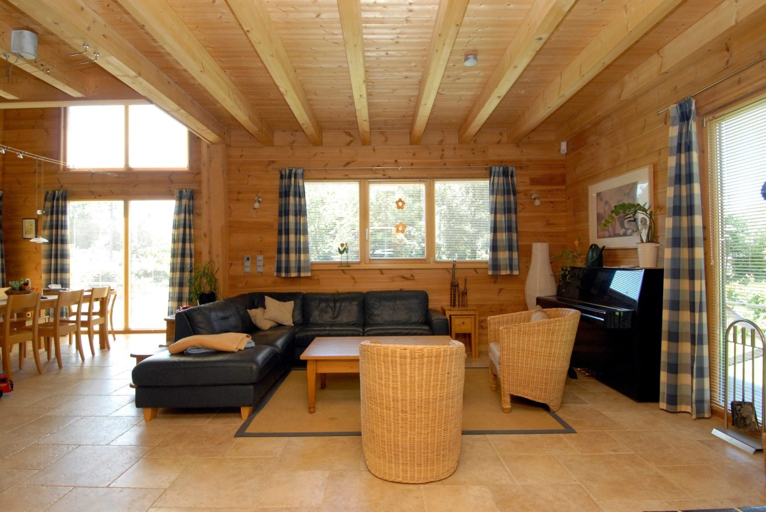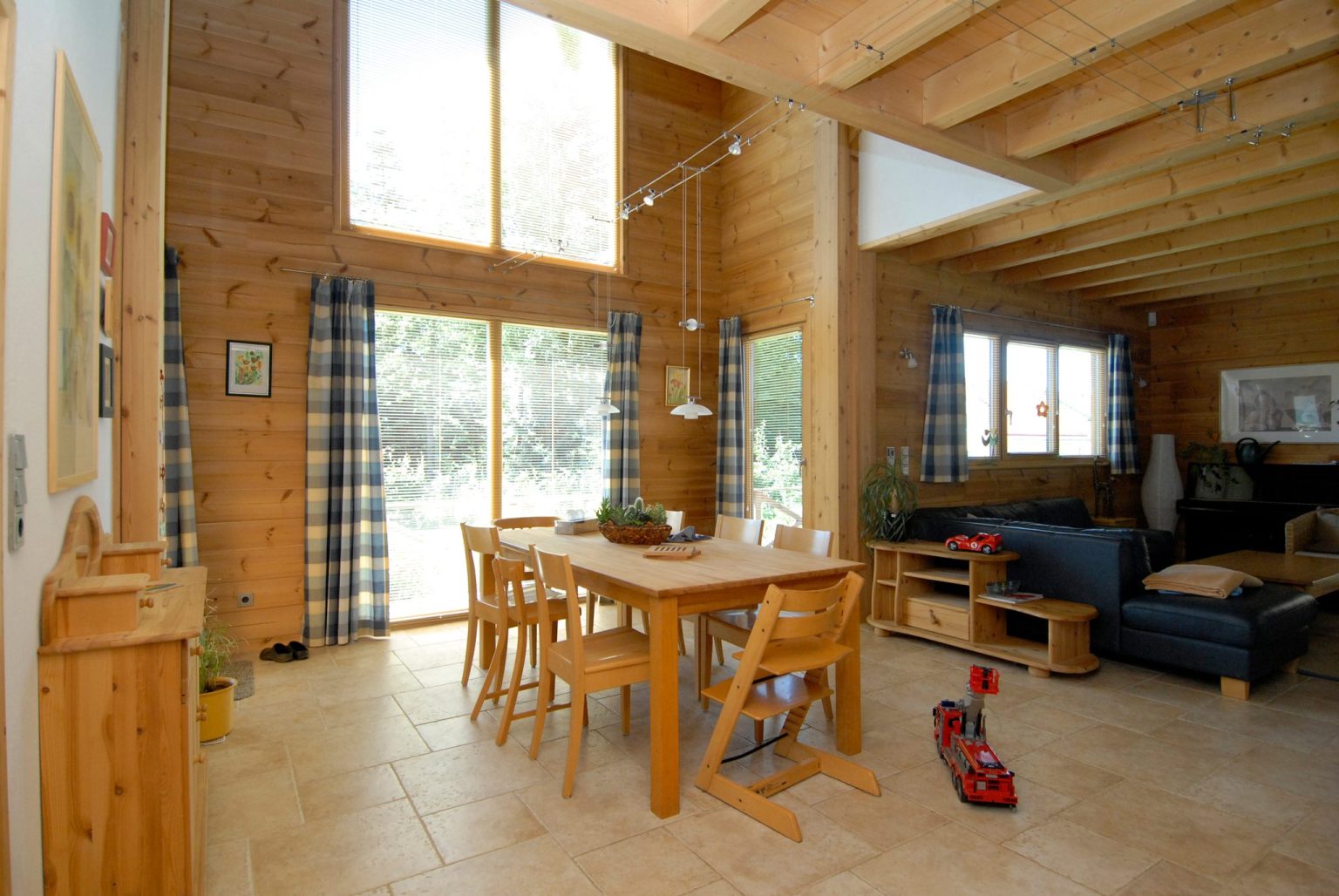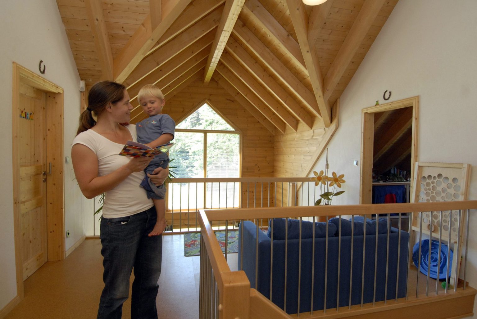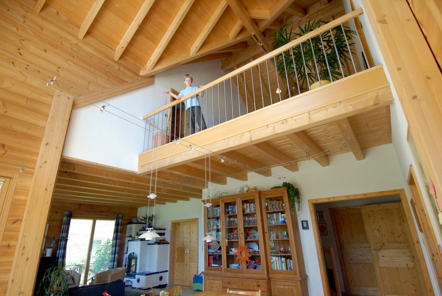 Im Holzhaus beeindruckt eine offene Dachstuhlkonstruktion
