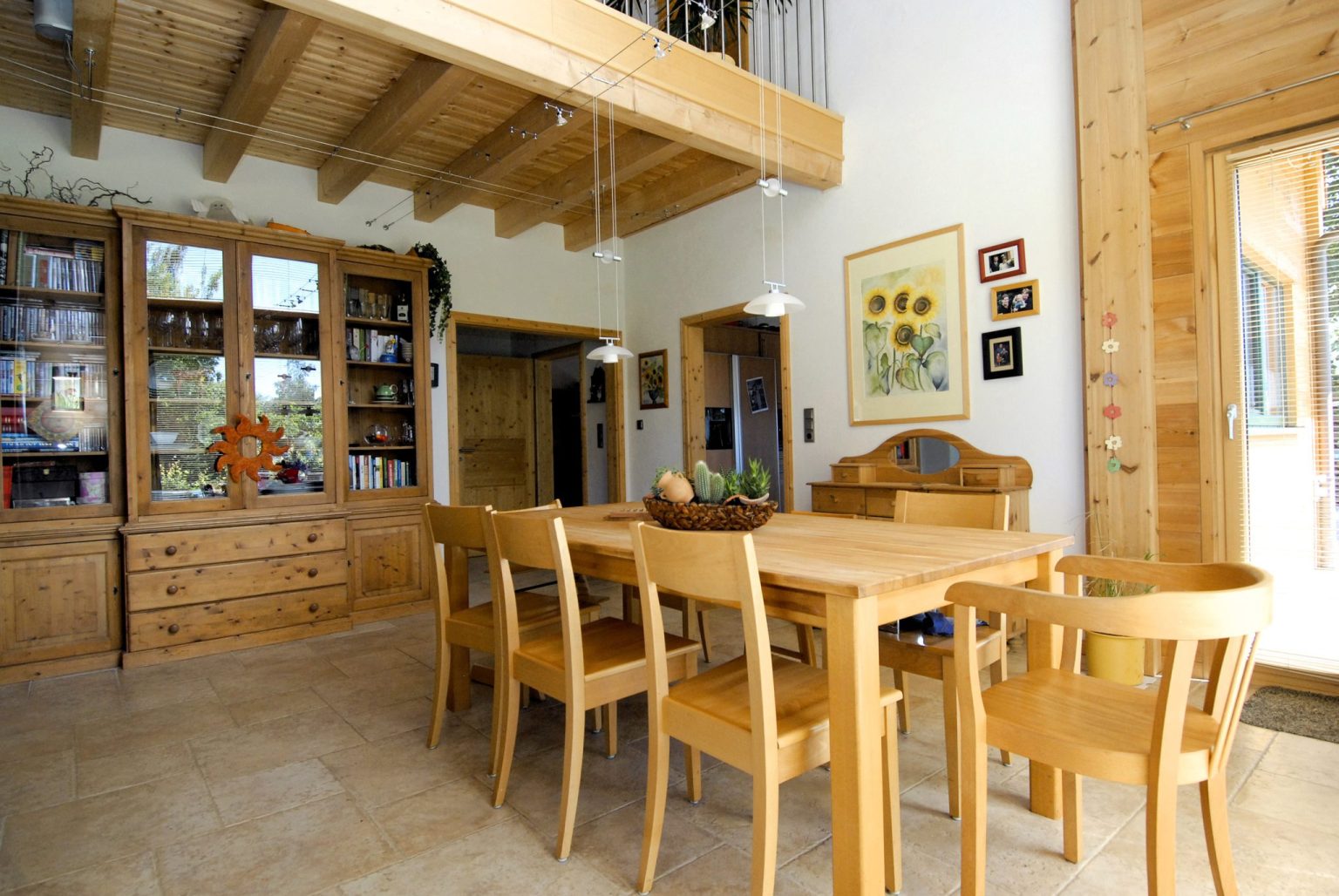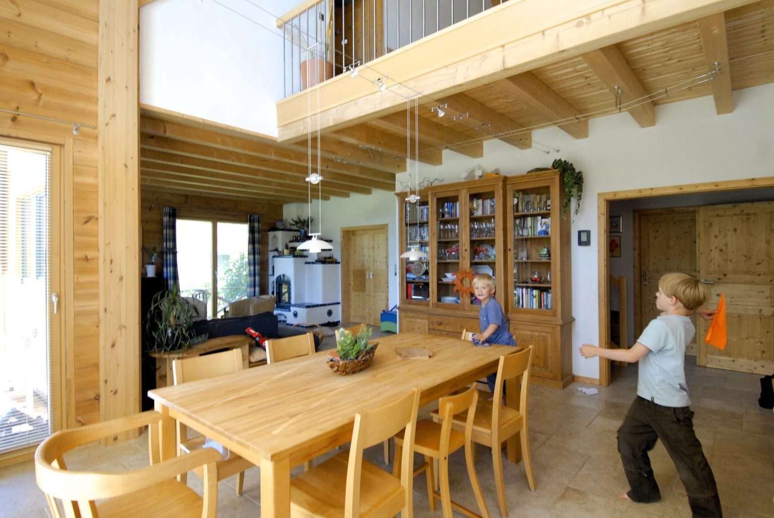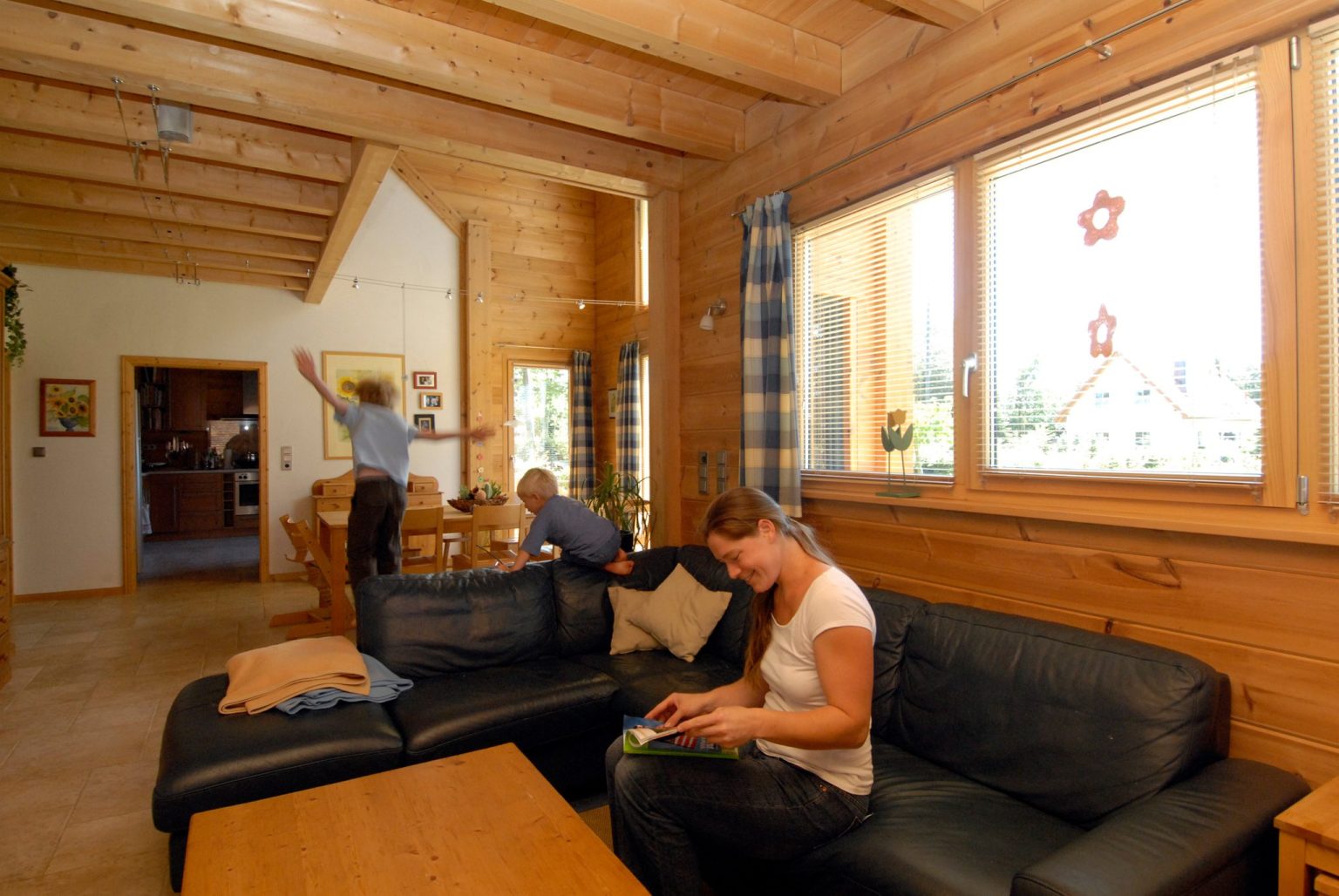 Im Holzhaus beeindruckt eine offene Dachstuhlkonstruktion