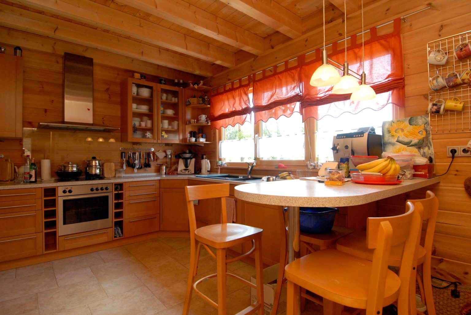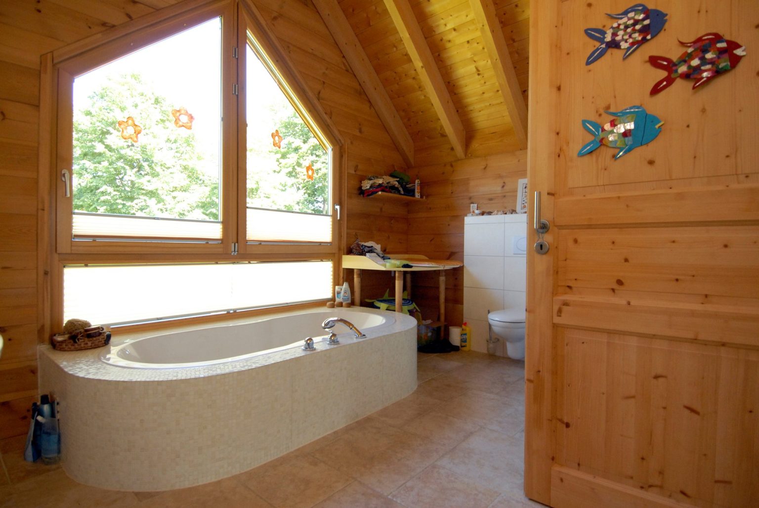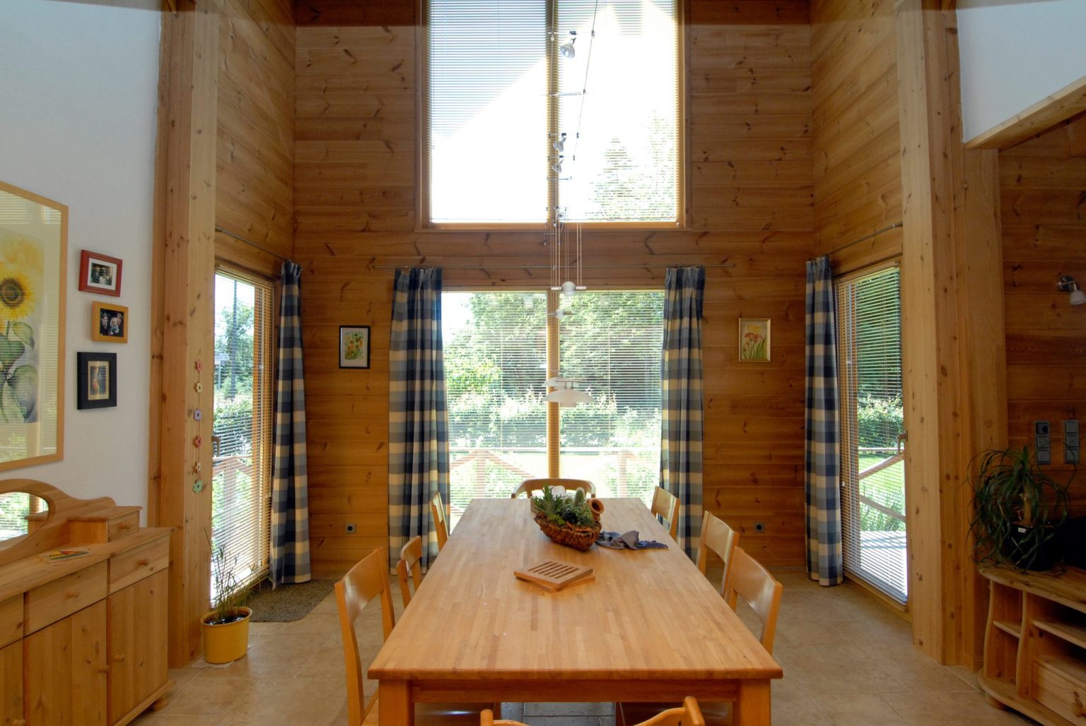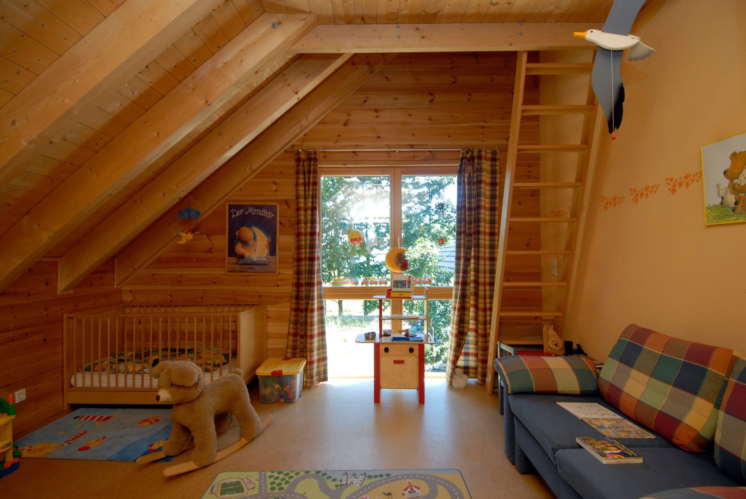 Im Holzhaus beeindruckt eine offene Dachstuhlkonstruktion