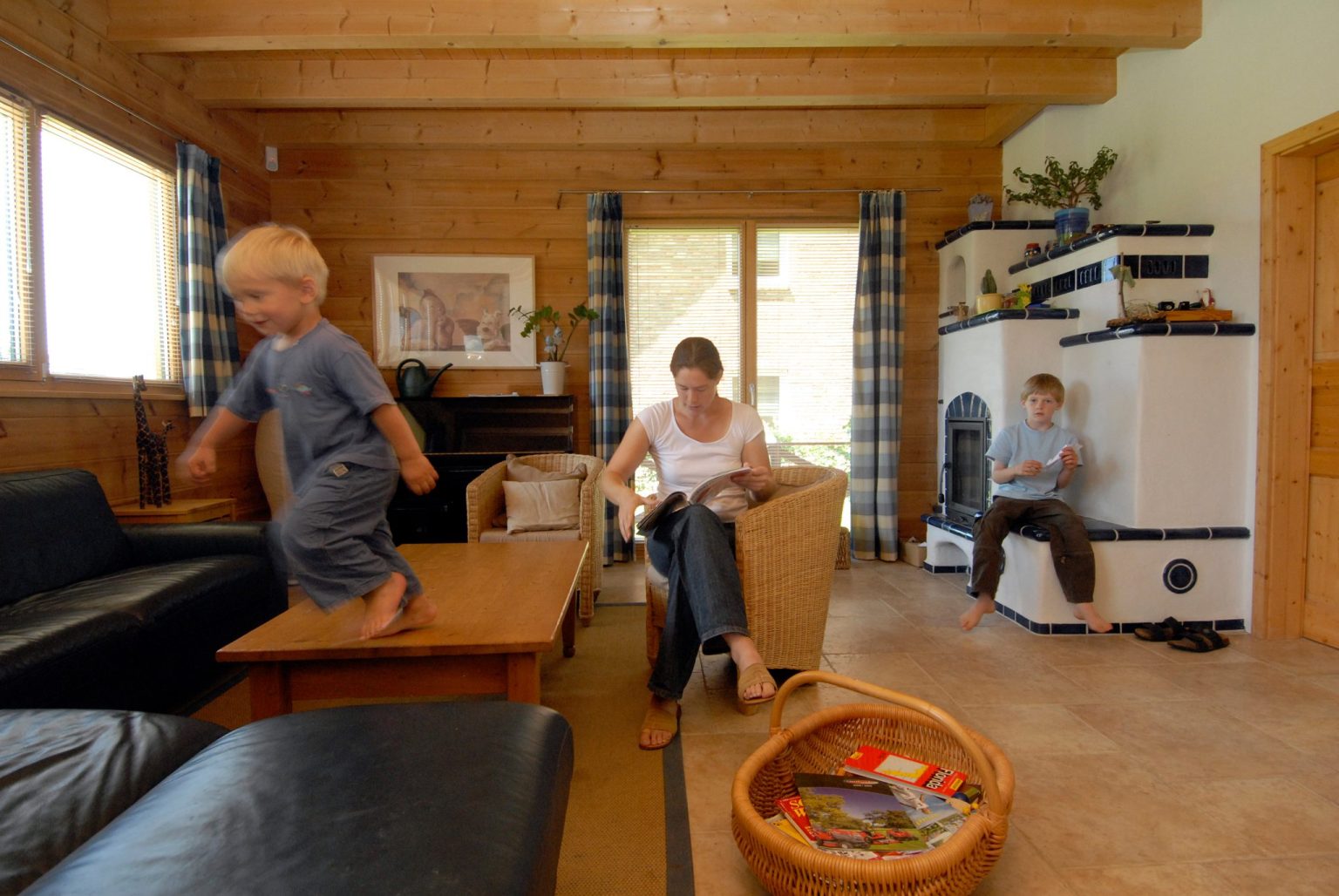 Beheizt wird Holzhaus „Eifelschatz“ (Baujahr 2004) mit Gas und einem wasserführenden Kachelofen und wird mit solarer Warmwasserbereitung ergänzt.