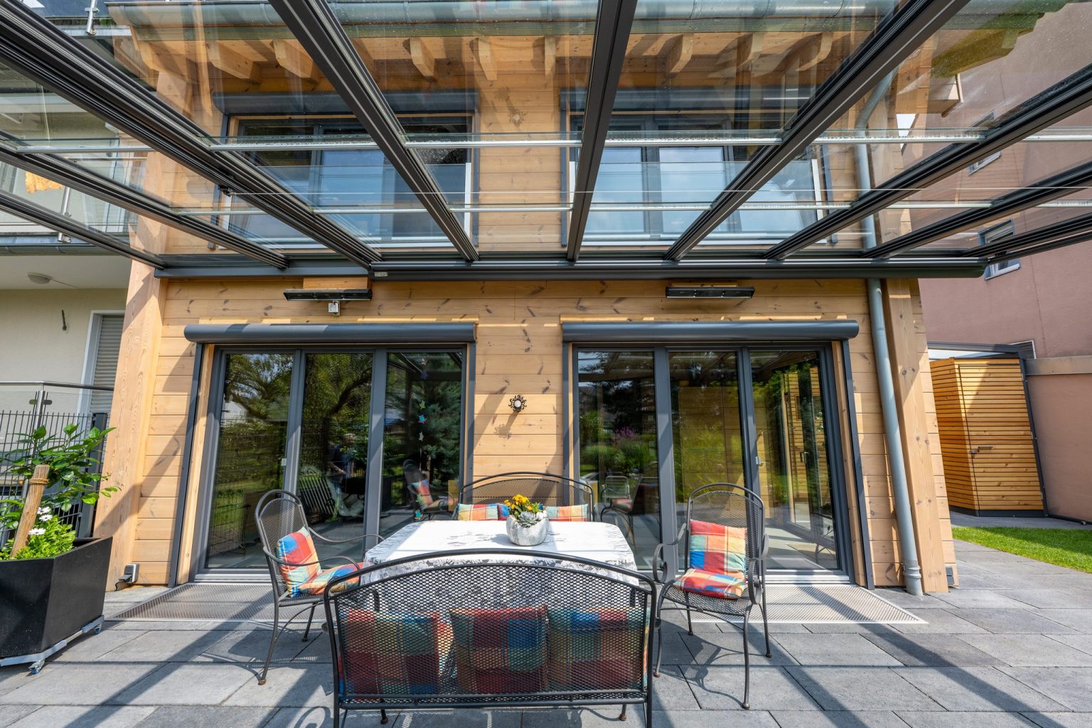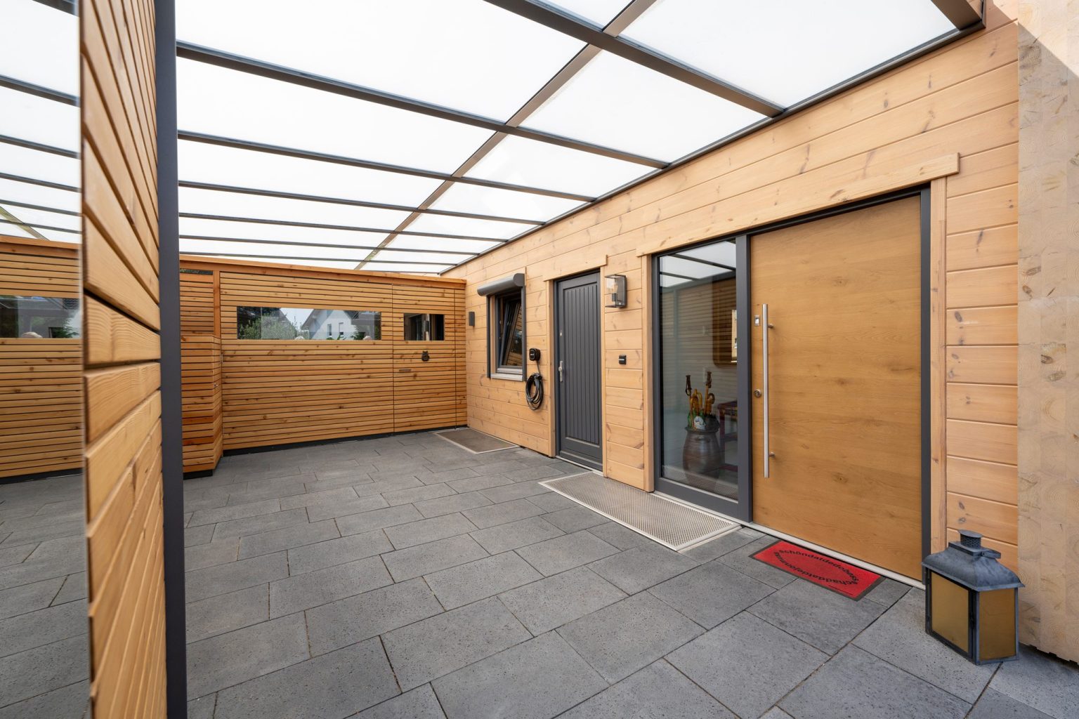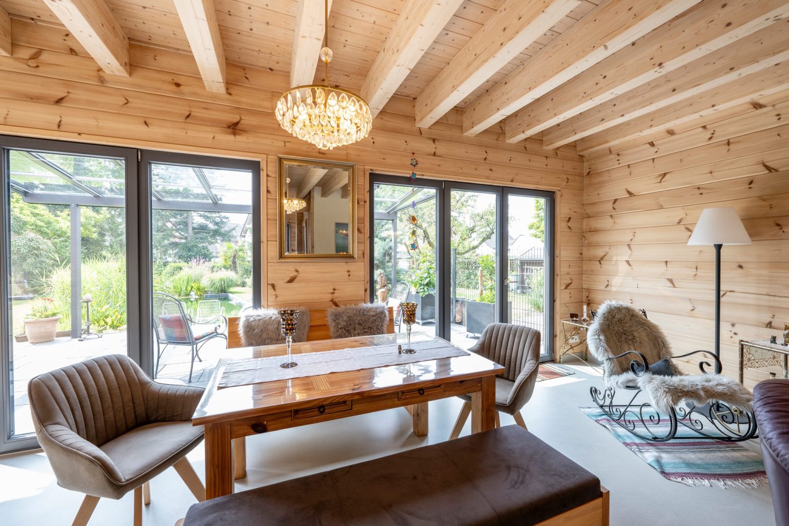 „Wir hatten dieses Grundstück, aber durften darauf nicht genau nach unseren Vorstellungen bauen. Vorgeschrieben war der direkte Anschluss ans Nachbargebäude in einheitlicher Linie zur Straße. Eigentlich wollten wir eher im hinteren Teil des Grundstücks bauen mit großem Vorgarten. Außerdem mussten wir das Haus höher bauen, als ursprünglich geplant. Zum Glück hat Fullwood Wohnblockhaus uns nicht auch noch Vorschriften gemacht und konnte alle unsere Wünsche sowie die Vorgaben des Bauamtes umsetzen. Wir durften sogar in der Bauphase noch spontane Ideen verwirklichen.“, sagt Wolfgang Geller und ist begeistert über die Flexibilität seines Hausherstellers. Er und seine Frau hatten Holzhaus „Eikamp“ zuerst selbst entworfen, dann mit Fullwood bis ins Detail geplant und zuletzt als Vollmontage bauen lassen. Im Anschluss übernahmen externe Handwerksfirmen den Ausbau. „Die Blockwände für unser Haus wurden im Werk passgenau vorgefertigt, dabei haben wir sogar zeitweise zugesehen. Im September erfolgte die Hausmontage auf den Keller und schon im April zogen wir in unser neues, komplett fertiges Zuhause ein!“, ergänzt die Hausherrin. Sogar der Carport und die gesamte Außenanlage inklusive Terrasse, weitläufigem Gartenparadies und Schwimmteich waren da schon fertig. Draußen ist alles ebenerdig und die Schwellen der Terrassentüren sind sehr niedrig, sodass diese bei Bedarf auch mit einem Rollator überwindbar sind. Die Zimmertüren sind breiter als üblich, damit auch ein Rollstuhl hindurchpasst und öffnen nach außen aufschlagend. Die Geschosstreppe ist ebenfalls besonders breit, nicht so steil und besitzt ein großes Podest, sodass der Einbau eines Treppenliftes im Bedarfsfall möglich ist. Die Tritte sind beleuchtet, um in der Dämmerung sicher steigen zu können. Notwendige Anschlüsse sind in allen Geschossen vorhanden, auch im Keller, sodass, bei Versetzen der Trennwand im Flur, bis zu drei Wohneinheiten verwirklicht werden könnten. „Besonders praktisch ist schon jetzt, dass vom regengeschützten Carport ein Nebeneingang in unseren Vorratsraum führt, welcher wiederum der Küche angeschlossen ist. So tragen wir Einkäufe auf kurzem Weg in die Speisekammer oder zum Kühlschrank.“, sagt der Hausherr. Zum Garten ist der Carport geschlossen, besitzt aber auch hier eine Tür. „Wir wussten ganz genau, was wir wollten und nicht wollten, sodass unser Holzhaus wirklich perfekt für unsere Bedürfnisse ist.“, betont er. Und das ohne Aufpreis für die individuelle Planung!
