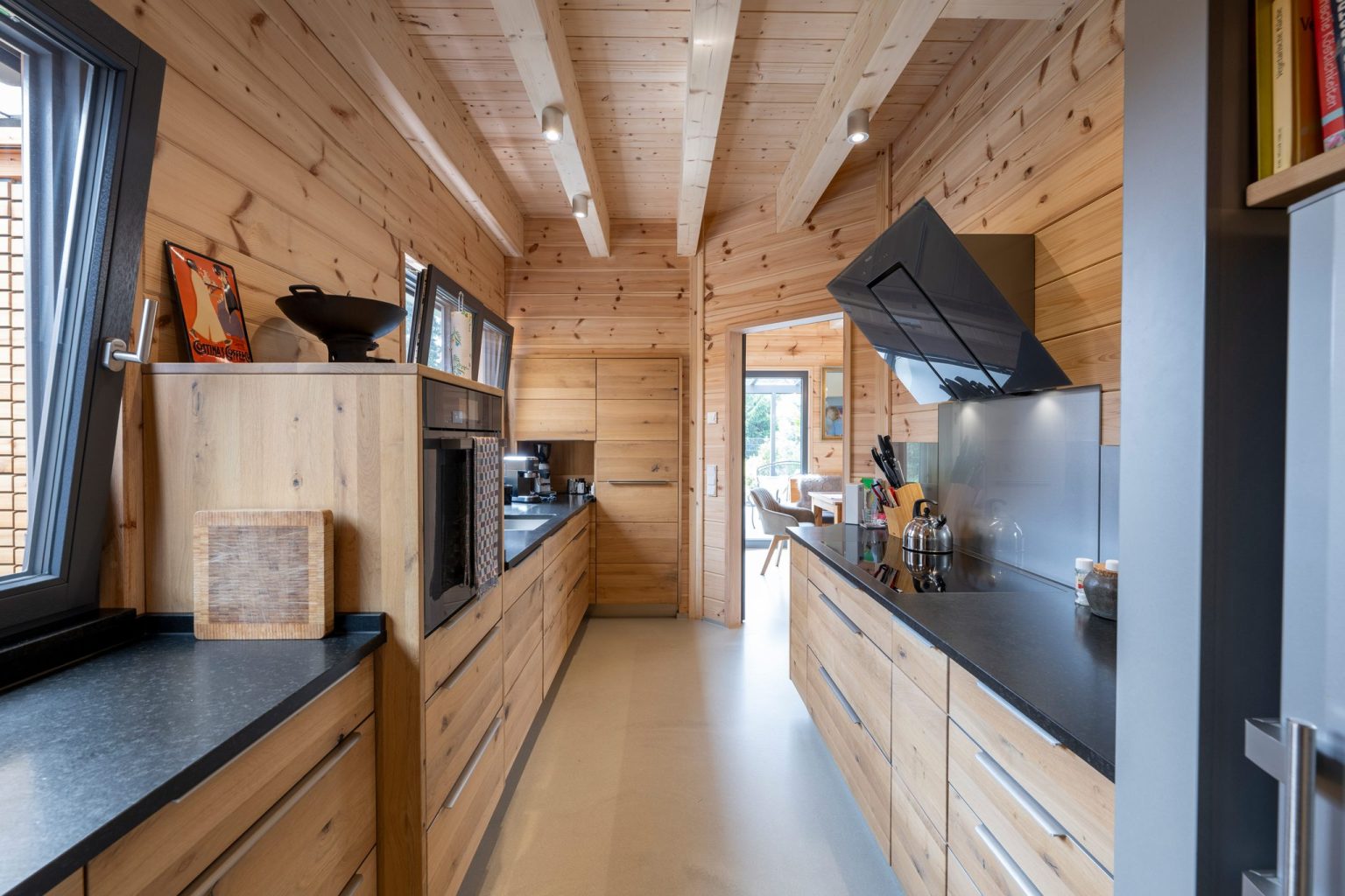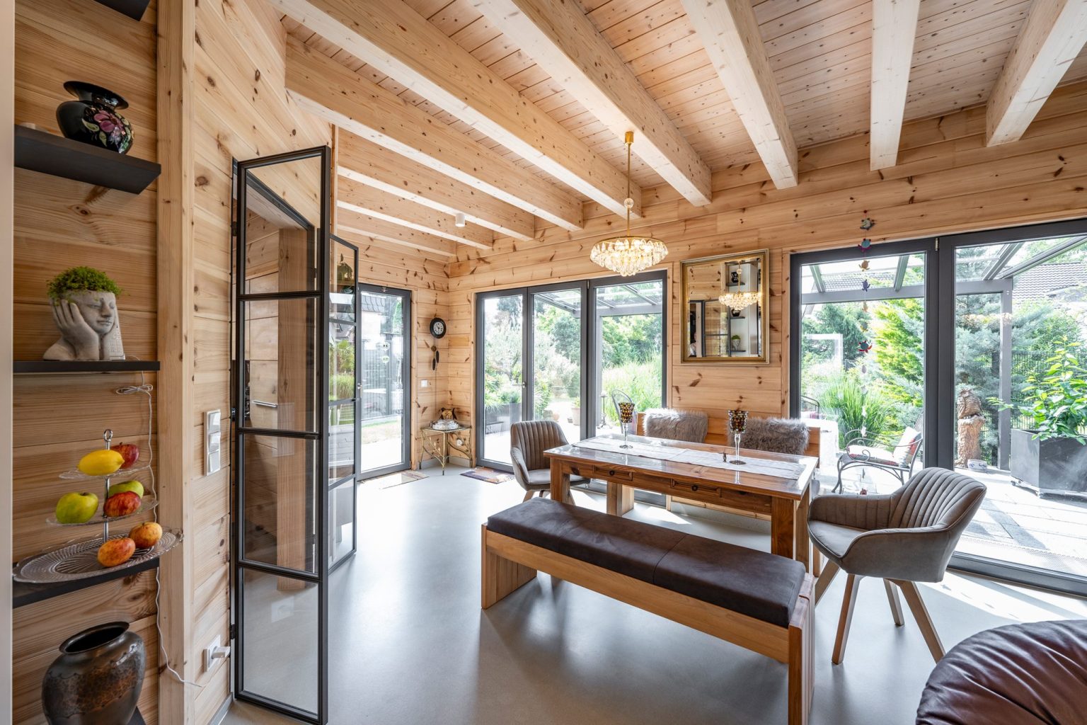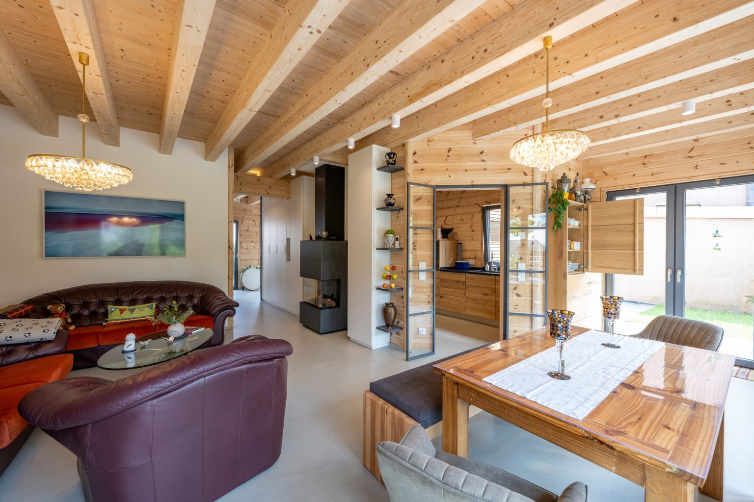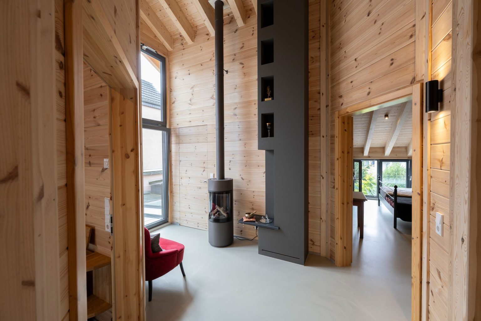 Holzhaus „Eikamp“ ist tagsüber dank großflächiger Fenster an den drei offenen Hausseiten lichtdurchflutet. Die Kiefernwände wurden mit UV-Schutzlasur am Nachdunkeln gehindert und bleiben dauerhaft naturhell. Einige Trennwände im Holzhaus wurden mit weiß gestrichenen Rigipsplatten verkleidet, was die Räume zusätzlich aufhellt und einen modernen Gesamteindruck hinterlässt. Während die weißen Wände das natürliche Licht reflektieren, erstrahlen die Massivholzwände und Balkendecken in ganzer Pracht – ganz ohne chemische Ausdünstungen! „Wegen der zur Straße vorgeschriebenen Dachhöhe entschieden wir uns für ein versetztes Pultdach. Zur Straße hin ist es höher und steiler als zur Gartenseite. Unser Obergeschoss besitzt eine enorme Lichte, da wir einen offenen Sichtdachstuhl wollten. Also entschieden wir uns zum Ausgleich im Erdgeschoss für eine Balkenlage mehr als üblich, sonst wäre der Luftraum im Dachgeschoss noch höher.“, erklärt Ute Müller-Geller. Während der Hausmontage kam dem Richtmeister die Idee, einen offenen Dachboden auf der höheren Hausseite einzuziehen. Der Bauherrschaft gefiel der Gedanke und heute befindet sich dort das eigene kleine Reich ihres Enkelsohnes, der über eine feste, stabile Metalleiter dort hinaufgelangt. Oben schütz ein fest installiertes Metallgeländer vor dem Absturz. Viele kreative Ideen, Besonderheiten und ökologische Materialien gibt es in Holzhaus „Eikamp“ zu entdecken. Beispielsweise wurde im ganzen Haus ein recycelbarer Fußboden aus Gießharz auf Rapsölbasis in einem hellen Grau verlegt, das hervorragend zu den anthrazitfarbenen Fenstern, Treppen- und Glastürelementen passt. So setzt sich das moderne, geradlinige Erscheinungsbild von außen konsequent nach drinnen fort. Eine Glas-Metall-Schiebetüre im Industrielook, die sich in der Wand zwischen Eingangsbereich und Wohnbereich versteckt, überrascht den Besucher, wenn sie hervorgezogen wird. Eine Flügeltüre im gleichen Design trennt die Küche vom Wohnbereich. Hier befindet sich auch eine als Schrank genutzte Durchreiche, die sowohl von der Küche als auch vom Esszimmer aus zu öffnen ist. „Von der Spülmaschine in der Küche kann ich das Geschirr dort einräumen und von der Esszimmerseite, wo sich außerdem ein Zugang zur Terrasse anschließt, das Geschirr zum Tischdecken entnehmen.“, freut sich die Hausherrin über ihre geniale Idee. Unsichtbar ist auch die Badezimmertüre im Obergeschoss, welche sich wie ein Chamäleon der Holzwandstruktur anpasst und lediglich durch eine Türklinke verraten wird. Neben der Transparenz, der Helligkeit und dem ökologischen Gedanken ist auch das Ressourcen-schonende Energiekonzept im Sinne der Hauseigentümer. Mittels Fußbodenheizung wird die von einer 12 Meter tiefen Grundwasserpumpe gespeiste Wärme im Holzhaus verbreitet. Sämtlichen Strom, u.a. auch für den Betrieb dieser Wasser-Wasser-Wärmepumpe, erzeugen zwei großflächige PV-Anlagen auf dem Hausdach solar. Eine E-Ladestation am Carport ist ebenfalls vorhanden. Abgesehen von dem Gasanschluss in der Küche ist Holzhaus „Eikamp“ energieautark. Zum Spaß haben sich Wolfgang und Ute zwei Gaskamine im Haus gegönnt. „Unsere einschaligen Blockwände dämmen sehr gut, sodass wir sehr sparsam heizen können. Die Wärmeschutzfenster und die gute Aufdachdämmung tragen zum geringen Heizenergieverbrauch bei.“, sagt er.