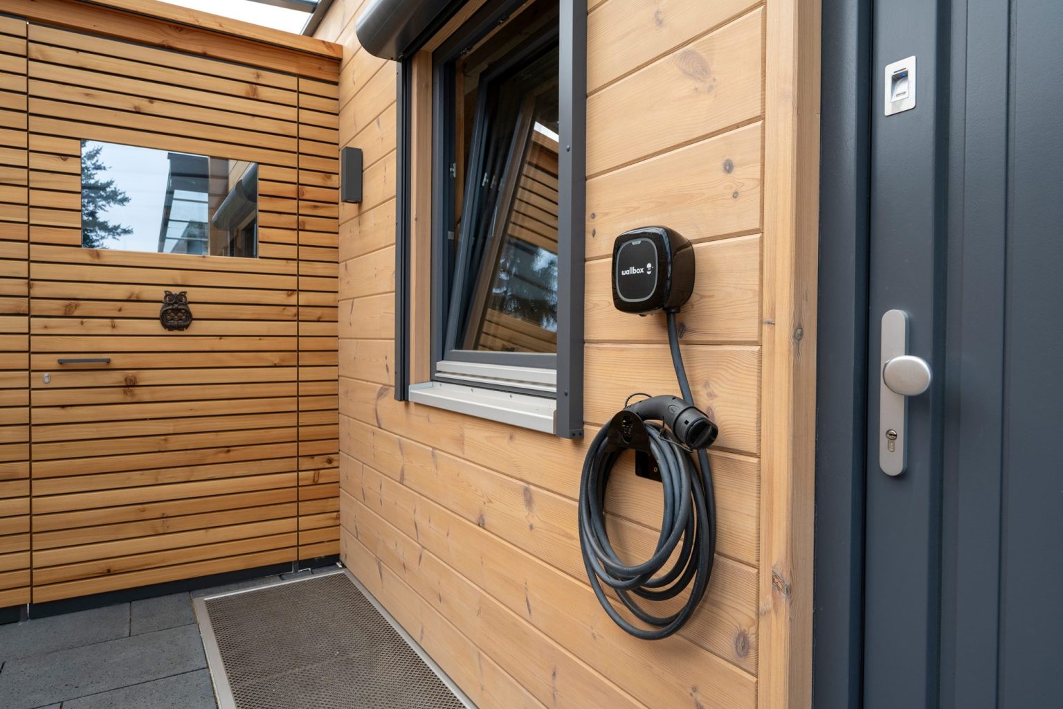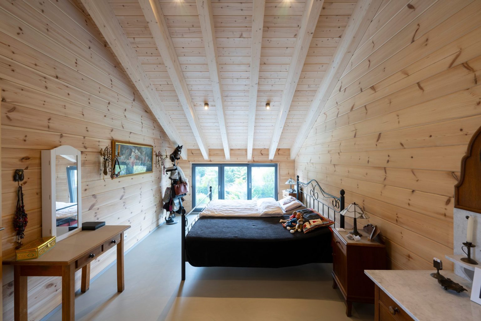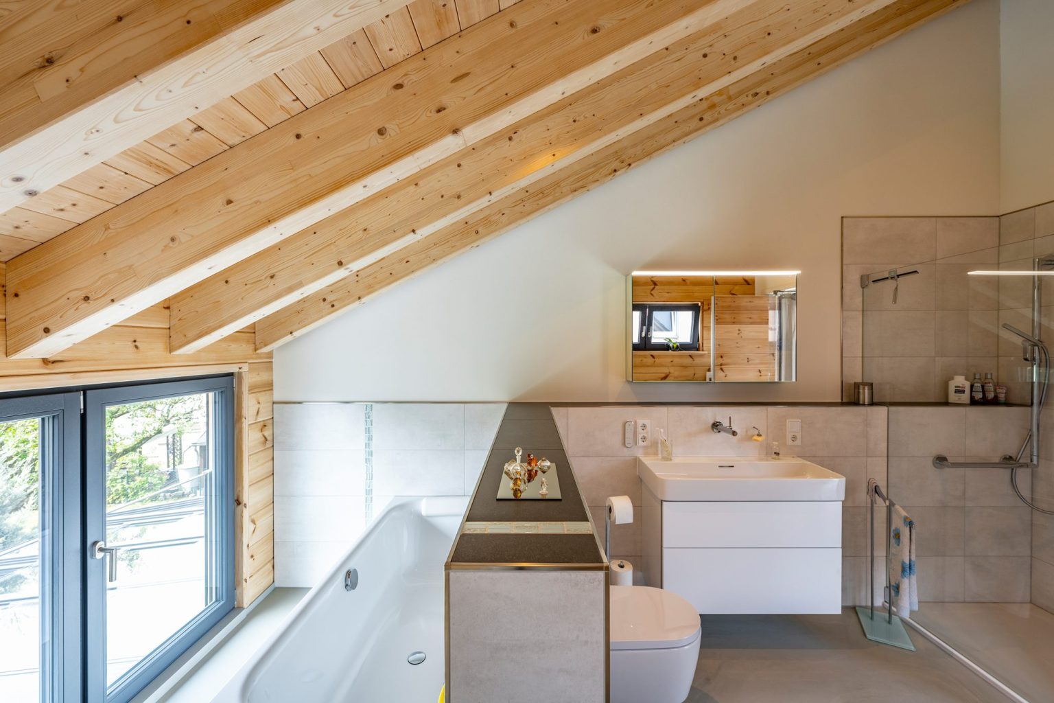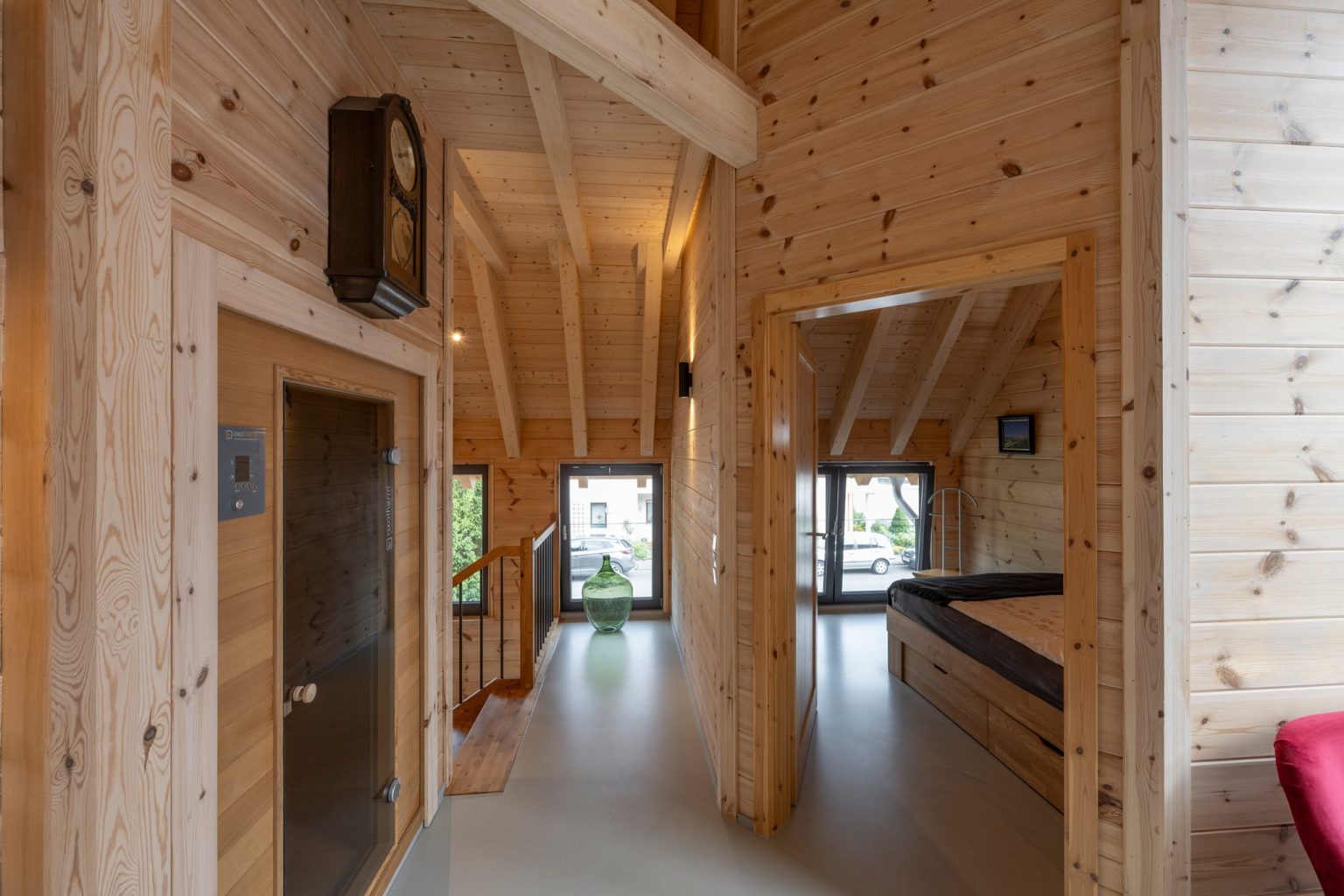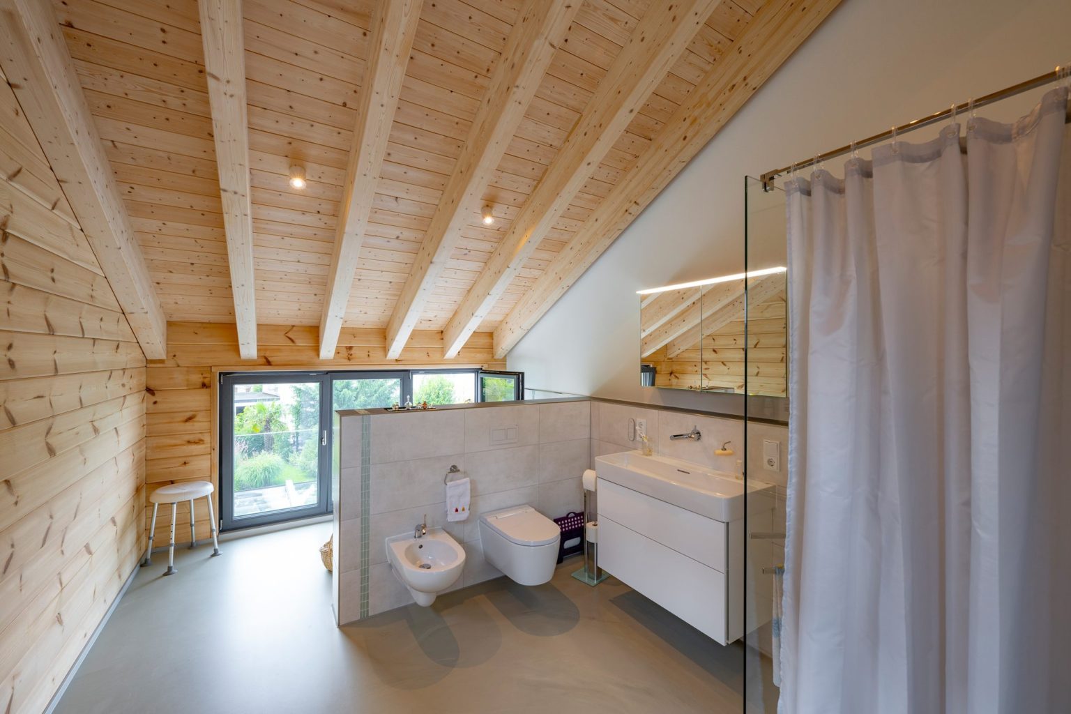 Holzhaus „Eikamp“ ist tagsüber dank großflächiger Fenster an den drei offenen Hausseiten lichtdurchflutet. Die Kiefernwände wurden mit UV-Schutzlasur am Nachdunkeln gehindert und bleiben dauerhaft naturhell. Einige Trennwände im Holzhaus wurden mit weiß gestrichenen Rigipsplatten verkleidet, was die Räume zusätzlich aufhellt und einen modernen Gesamteindruck hinterlässt. Während die weißen Wände das natürliche Licht reflektieren, erstrahlen die Massivholzwände und Balkendecken in ganzer Pracht – ganz ohne chemische Ausdünstungen! „Wegen der zur Straße vorgeschriebenen Dachhöhe entschieden wir uns für ein versetztes Pultdach. Zur Straße hin ist es höher und steiler als zur Gartenseite. Unser Obergeschoss besitzt eine enorme Lichte, da wir einen offenen Sichtdachstuhl wollten. Also entschieden wir uns zum Ausgleich im Erdgeschoss für eine Balkenlage mehr als üblich, sonst wäre der Luftraum im Dachgeschoss noch höher.“, erklärt Ute Müller-Geller. Während der Hausmontage kam dem Richtmeister die Idee, einen offenen Dachboden auf der höheren Hausseite einzuziehen. Der Bauherrschaft gefiel der Gedanke und heute befindet sich dort das eigene kleine Reich ihres Enkelsohnes, der über eine feste, stabile Metalleiter dort hinaufgelangt. Oben schütz ein fest installiertes Metallgeländer vor dem Absturz. Viele kreative Ideen, Besonderheiten und ökologische Materialien gibt es in Holzhaus „Eikamp“ zu entdecken. Beispielsweise wurde im ganzen Haus ein recycelbarer Fußboden aus Gießharz auf Rapsölbasis in einem hellen Grau verlegt, das hervorragend zu den anthrazitfarbenen Fenstern, Treppen- und Glastürelementen passt. So setzt sich das moderne, geradlinige Erscheinungsbild von außen konsequent nach drinnen fort. Eine Glas-Metall-Schiebetüre im Industrielook, die sich in der Wand zwischen Eingangsbereich und Wohnbereich versteckt, überrascht den Besucher, wenn sie hervorgezogen wird. Eine Flügeltüre im gleichen Design trennt die Küche vom Wohnbereich. Hier befindet sich auch eine als Schrank genutzte Durchreiche, die sowohl von der Küche als auch vom Esszimmer aus zu öffnen ist. „Von der Spülmaschine in der Küche kann ich das Geschirr dort einräumen und von der Esszimmerseite, wo sich außerdem ein Zugang zur Terrasse anschließt, das Geschirr zum Tischdecken entnehmen.“, freut sich die Hausherrin über ihre geniale Idee. Unsichtbar ist auch die Badezimmertüre im Obergeschoss, welche sich wie ein Chamäleon der Holzwandstruktur anpasst und lediglich durch eine Türklinke verraten wird. Neben der Transparenz, der Helligkeit und dem ökologischen Gedanken ist auch das Ressourcen-schonende Energiekonzept im Sinne der Hauseigentümer. Mittels Fußbodenheizung wird die von einer 12 Meter tiefen Grundwasserpumpe gespeiste Wärme im Holzhaus verbreitet. Sämtlichen Strom, u.a. auch für den Betrieb dieser Wasser-Wasser-Wärmepumpe, erzeugen zwei großflächige PV-Anlagen auf dem Hausdach solar. Eine E-Ladestation am Carport ist ebenfalls vorhanden. Abgesehen von dem Gasanschluss in der Küche ist Holzhaus „Eikamp“ energieautark. Zum Spaß haben sich Wolfgang und Ute zwei Gaskamine im Haus gegönnt. „Unsere einschaligen Blockwände dämmen sehr gut, sodass wir sehr sparsam heizen können. Die Wärmeschutzfenster und die gute Aufdachdämmung tragen zum geringen Heizenergieverbrauch bei.“, sagt er.