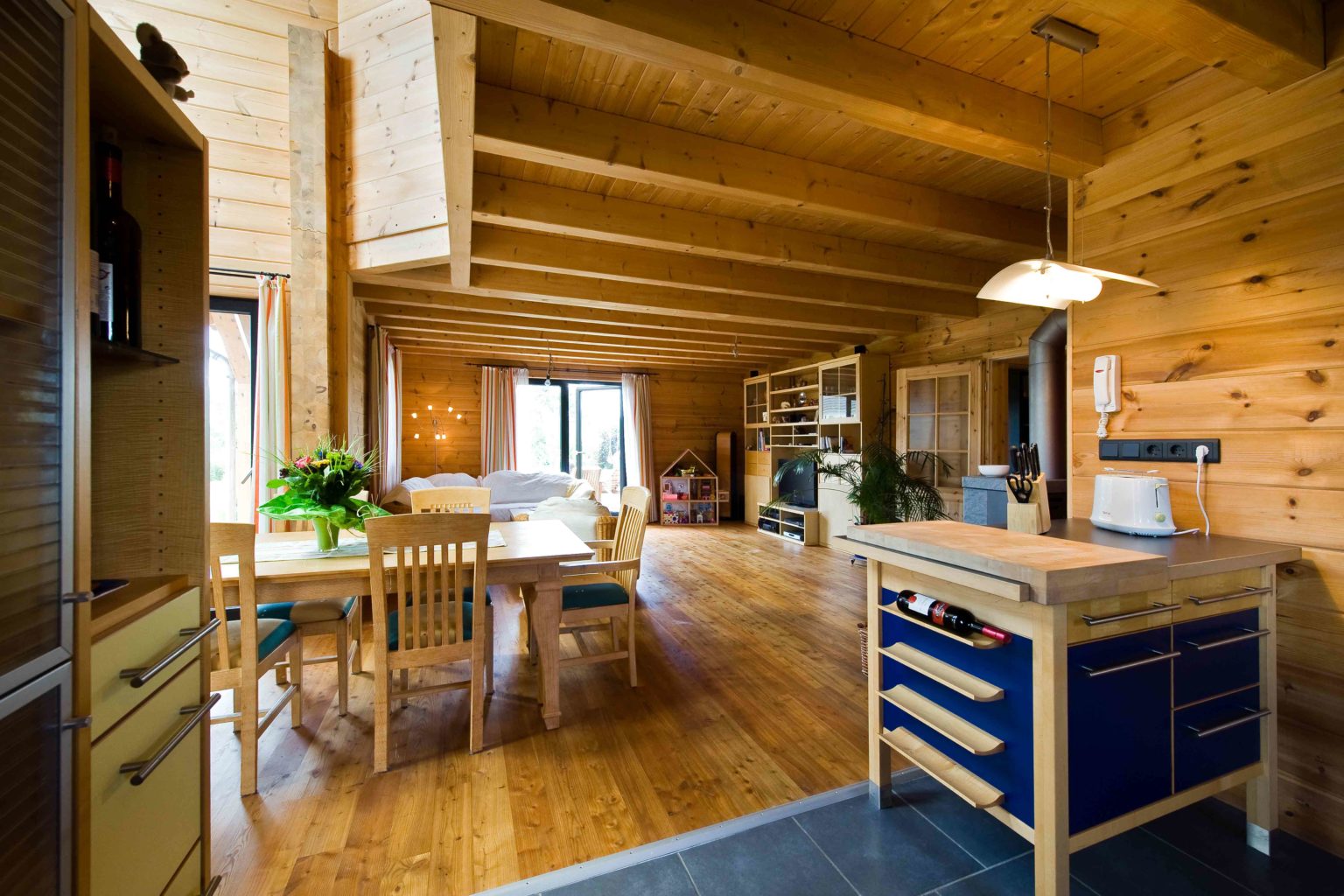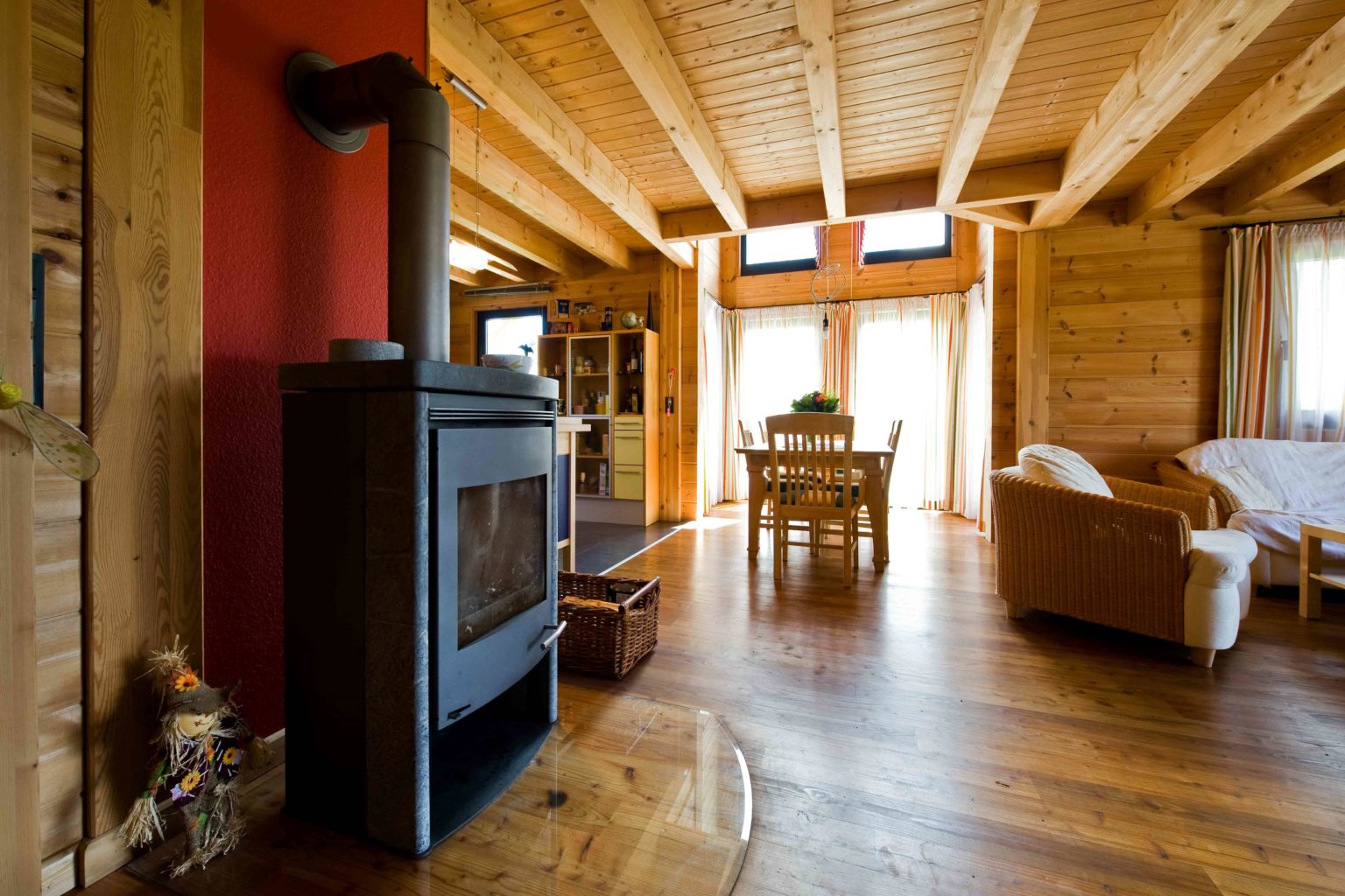 Zusammen mit dem Fullwood-Richtmeister und ein paar Helfern stellte der Hausherr sein Holzhaus selbst auf. Dank der im Werk exakt vorgefertigten Wandelemente ging die Montage binnen weniger Tage reibungslos vonstatten und der Ausbau konnte beginnen. Auch hier erledigte der tatkräftige Hobbyhandwerker sehr viel selbst, und überließ nur Elektro und Sanitärarbeiten örtlichen Handwerksbetrieben. Als Diplommathematiker und Physiker war ihm die Arbeit mit den eigenen Händen ein willkommener Ausgleich. Auch für seinen Kaminofen, mit dem er sein Holzhaus hauptsächlich beheizt, hackt der Hausherr das Holz gerne selbst. Daneben investierte er noch in eine klassische Gas-Brennwerttherme (Fußbodenheizung) und legte eine große Regenwasserzisterne an, die nicht nur den Garten mit Wasser versorgt, sondern auch die Waschmaschine und das WC.