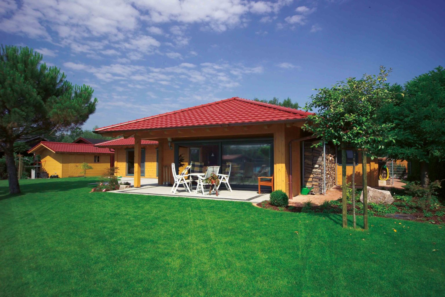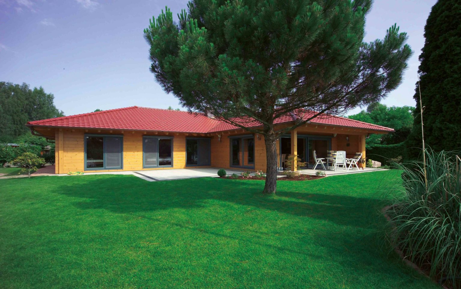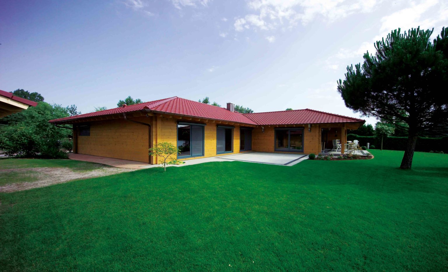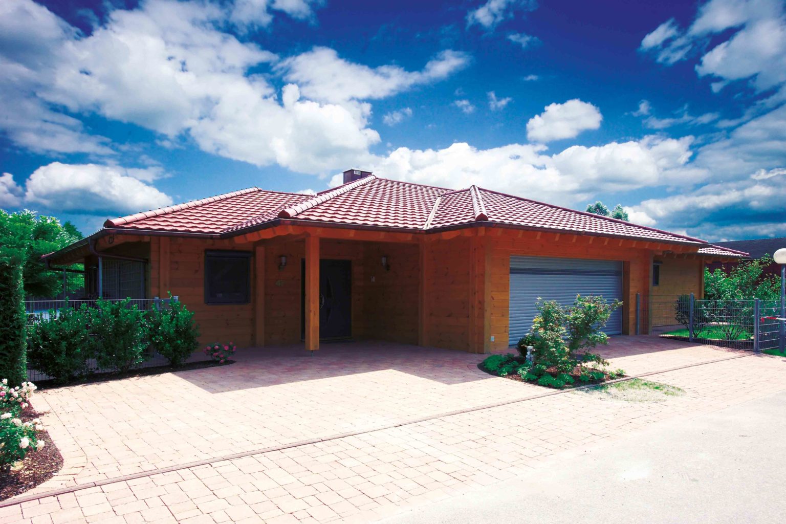 Der Eingangsbereich von Holzhaus "Elsass" befindet sich unter einem breiten Vordach und gleich daneben wurde eine Doppelgarage an das Holzhaus platziert. Gäste kommen somit relativ trocken vom Auto ins Holzhaus. Die Bewohner gelangen direkt von der Garage aus über eine Verbindungstür ins Innere. Raumhohe Glasfenster lassen viel Licht in das Innere und von jedem Zimmer aus können die Holzhaus Bewohner durch Schiebetüren ins Freie. Im amerikanischen Stil geht die Diele direkt in den Wohnbereich über und die Küche - durch eine Bar mit Hockern optisch abgeteilt - ist ins Wohngeschehen mit einbezogen. Über einen hohen Flur im Holzhaus gelangt man in einem separaten Trakt mit Schlaf- und Gästezimmer. Ein Bad mit 24,5m² mit echter Wohnqualität und eine Sauna laden zur Wellness ein. Urlaubsstimmung kommt in diesem Holzhaus also zu jeder Jahreszeit auf.