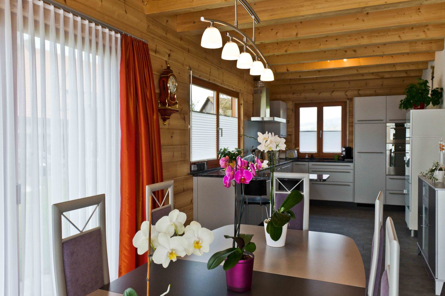Da Massivholz sehr schlecht Wärme leitet, besitzt ein massives Holzhaus gute Dämmeigenschaften. Im Winter bleibt Wärme im Innern, während im Sommer Hitze draußen bleibt. Und noch ein Vorteil macht sich am Jahresende auf der Kostenabrechnung bemerkbar: Durch die relativ hohe Oberflächentemperatur und sinnliche Ausstrahlung von Holz, fühlt man sich bereits bei niedrigerer Raumtemperatur wohl. Durchschnittlich zwei bis drei Grad Celsius niedriger ist die Temperatur bei gleichem Wohlgefühl, was aufs Jahr gerechnet viel Energie und Geld spart. Mit einer guten Aufdachdämmung haben die Eigentümer von Holzhaus „Emmental“ zusätzlich für minimalen Energieverlust gesorgt. Durch die einzigartige Eigenschaft von Bäumen, Kohlendioxyd aus der Luft aufzunehmen und als Kohlenstoff zu speichern, avanciert Holz zum klimafreundlichsten Baustoff. Selbst wenn das Holz verbaut ist, speichert es den Kohlenstoff weiterhin. Zudem wird keine Energie bei der „Produktion“ von Holz benötigt und die Erdatmosphäre somit nicht belastet. Bei verantwortungsvoller nachhaltiger Forstwirtschaft wächst Holz ständig nach und steht immer ausreichend zur Verfügung. Kurze Transportwege optimieren die Umweltfreundlichkeit zusätzlich.