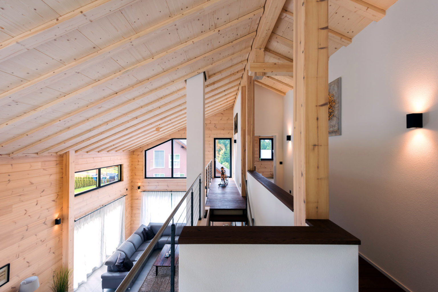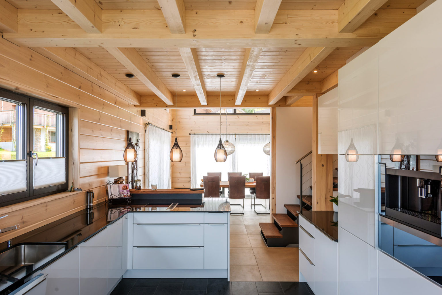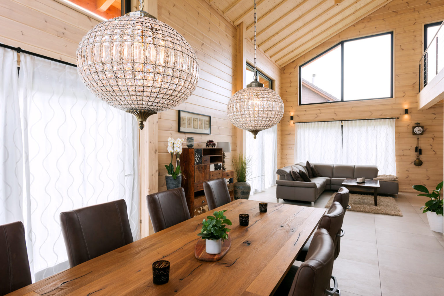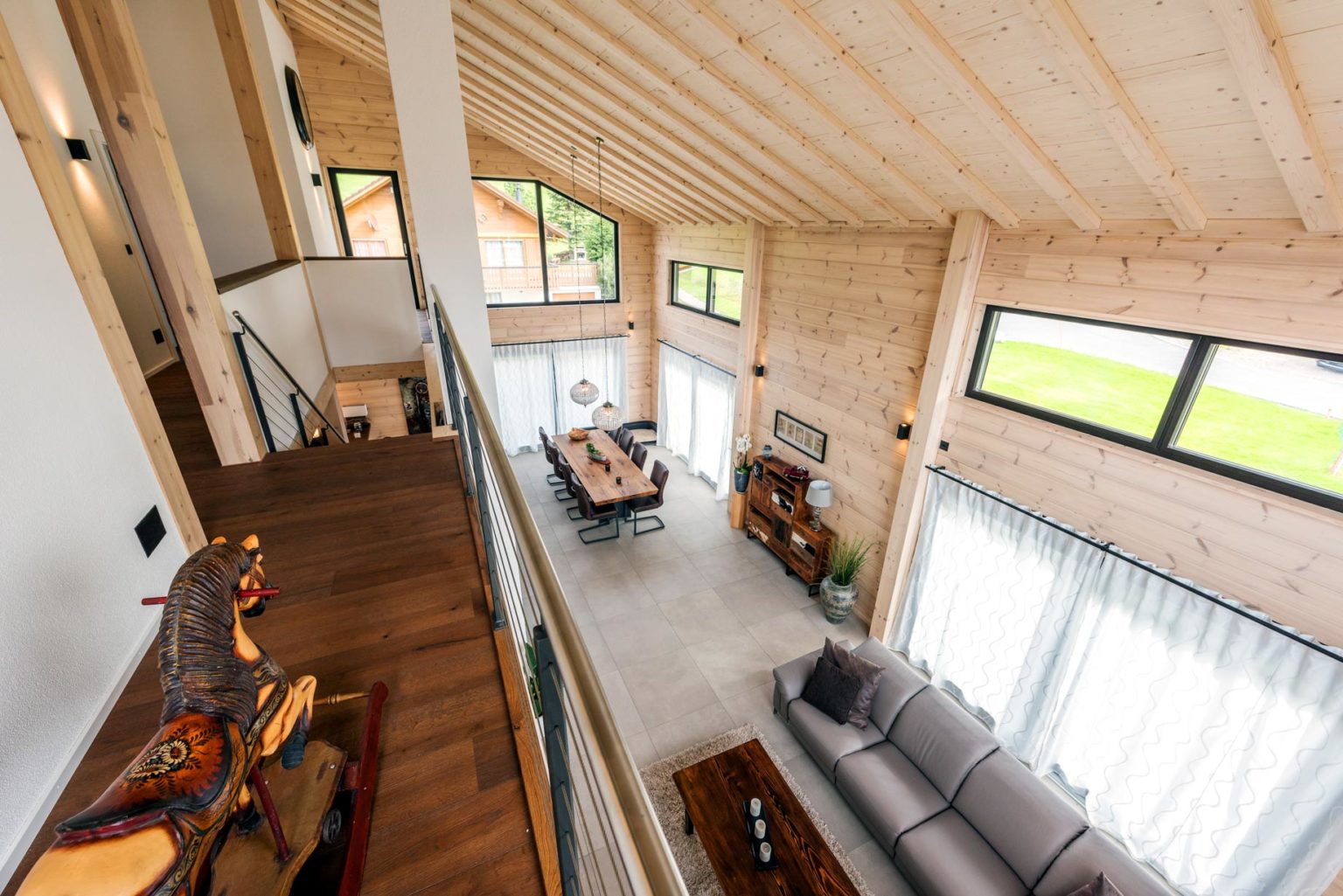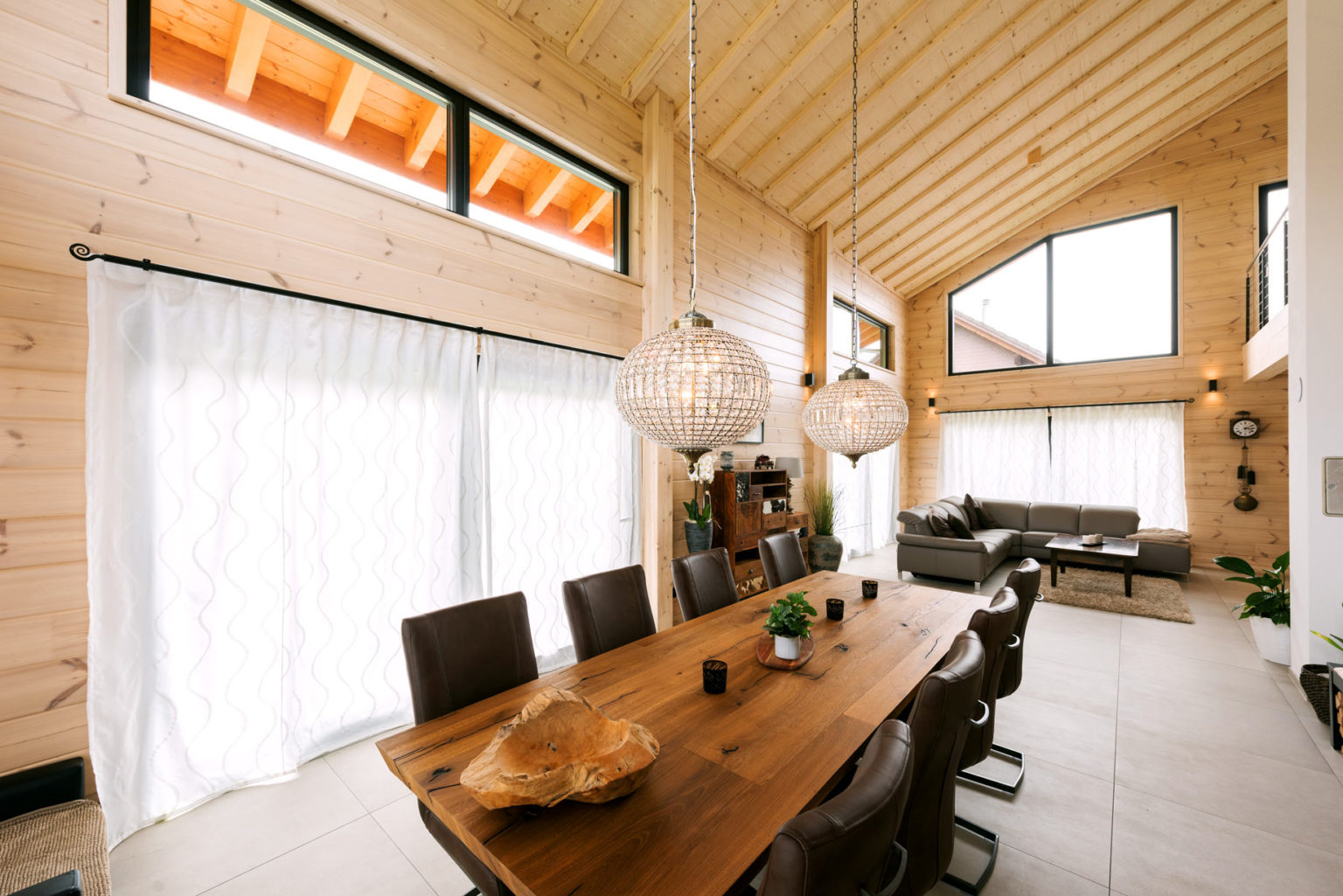 Oberste Priorität hatte für die Eigentümer ihre Freiheit die eigenen Ideen umsetzen zu können. Dazu gehören große Fenster, die viel natürliches Licht einfallen lassen, sowie ein echtes Massivholzhaus zu bauen, das von Stil und Struktur her aber sehr modern ist. Mit Holzhaus "Entlebuch" ist ihnen all dies gelungen, auch dank der Flexibilität und jahrzehntelangen Erfahrung von Fullwood. Verbaut wurde die "Luxuswand" des Holzhausspezialisten, die mit ihren 27cm extra dick ist und die besonders strengen, schweizerischen Energievorschriften locker erfüllt. Das naturhelle Polarkiefernholz der tragenden Außenwände wurde innen mit einer leicht milchigen Lasur behandelt, die einen Tick aufhellt, und mit UV-Schutz vor dem Nachdunkeln bewahrt. Dazu kombinierten die Hauseigner weiß verputzte, leichte Trennwände (Ständerbau), die neben noch mehr Helligkeit das moderne Ambiente im Holzhaus betonen. Für Bodenbeläge, Mobiliar und Dekorationen wurden sehr helle Erdfarben (Sand, Stein) und braun gewählt, die den natürlichen und dezenten Look ergänzen. Ein bis zum First offener, sehr hoher Luftraum erstreckt sich über dem offenen Wohn/Ess-Bereich im Erdgeschoss und betont die Weitläufigkeit der Hausfläche in die Vertikale. Das Ergebnis ist ein besonders großzügiges und "luftiges" Wohngefühl ohne Einengung und Druck. Die imposante, offene Sichtfirstpfette beeindruckt nicht nur als schmückendes Element, sondern betont das Bodenständige und Urtypische, für das ein Holzhaus steht. Behaglichkeit und wohngesundes Raumklima dank chemisch unbehandeltem Massivholz vereint in zeitlosem Ambiente dank moderner (Innen-) Architektur.