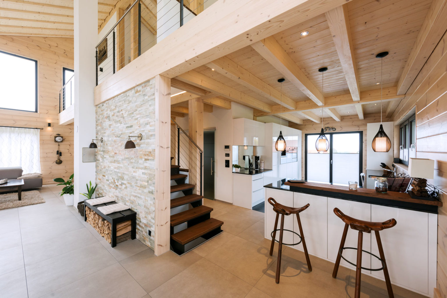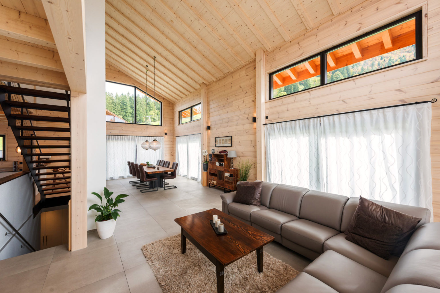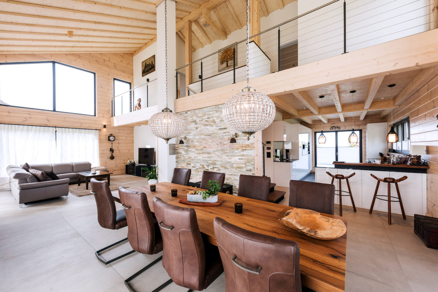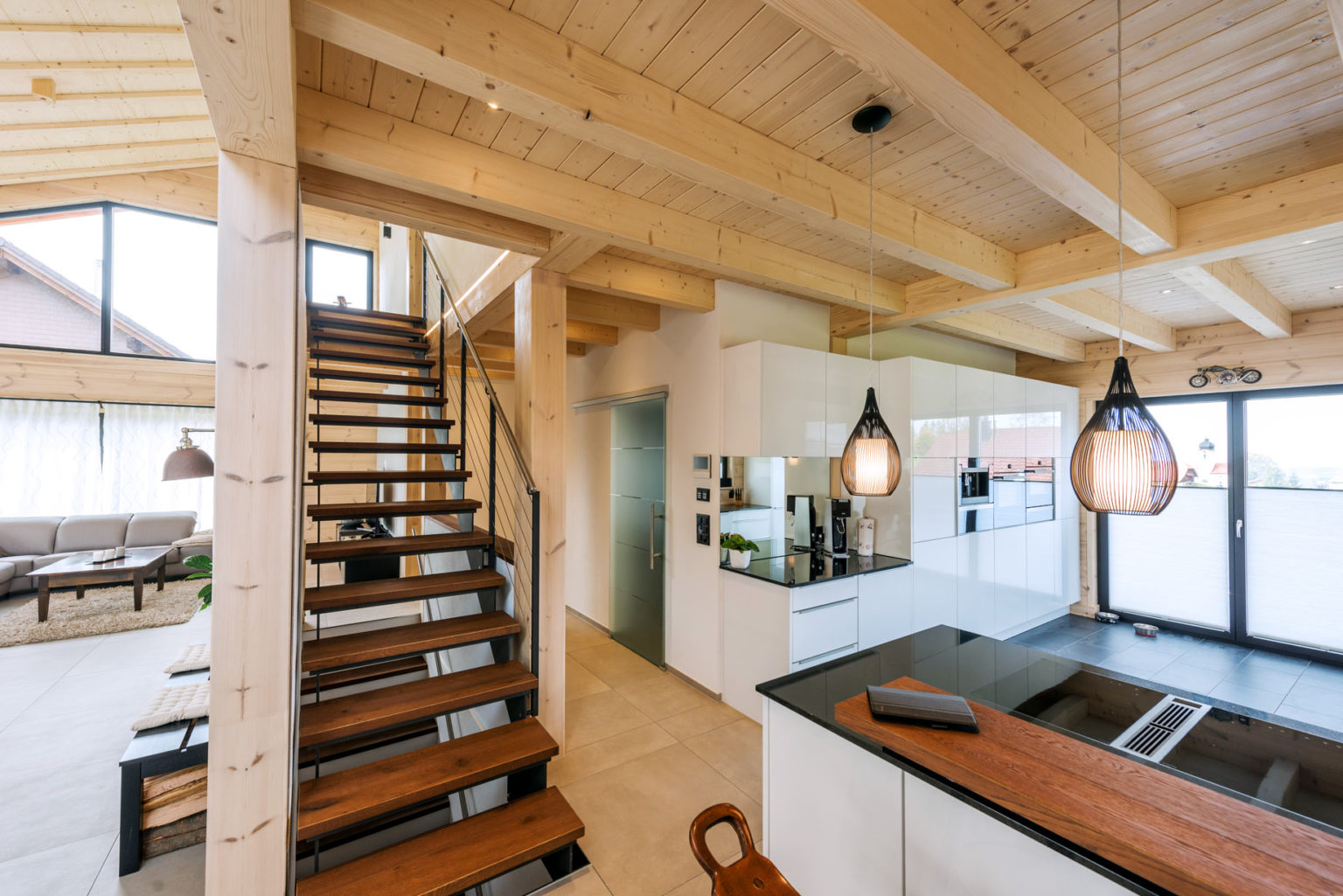 Oberste Priorität hatte für die Eigentümer ihre Freiheit die eigenen Ideen umsetzen zu können. Dazu gehören große Fenster, die viel natürliches Licht einfallen lassen, sowie ein echtes Massivholzhaus zu bauen, das von Stil und Struktur her aber sehr modern ist. Mit Holzhaus "Entlebuch" ist ihnen all dies gelungen, auch dank der Flexibilität und jahrzehntelangen Erfahrung von Fullwood. Verbaut wurde die "Luxuswand" des Holzhausspezialisten, die mit ihren 27cm extra dick ist und die besonders strengen, schweizerischen Energievorschriften locker erfüllt. Das naturhelle Polarkiefernholz der tragenden Außenwände wurde innen mit einer leicht milchigen Lasur behandelt, die einen Tick aufhellt, und mit UV-Schutz vor dem Nachdunkeln bewahrt. Dazu kombinierten die Hauseigner weiß verputzte, leichte Trennwände (Ständerbau), die neben noch mehr Helligkeit das moderne Ambiente im Holzhaus betonen. Für Bodenbeläge, Mobiliar und Dekorationen wurden sehr helle Erdfarben (Sand, Stein) und braun gewählt, die den natürlichen und dezenten Look ergänzen. Ein bis zum First offener, sehr hoher Luftraum erstreckt sich über dem offenen Wohn/Ess-Bereich im Erdgeschoss und betont die Weitläufigkeit der Hausfläche in die Vertikale. Das Ergebnis ist ein besonders großzügiges und "luftiges" Wohngefühl ohne Einengung und Druck. Die imposante, offene Sichtfirstpfette beeindruckt nicht nur als schmückendes Element, sondern betont das Bodenständige und Urtypische, für das ein Holzhaus steht. Behaglichkeit und wohngesundes Raumklima dank chemisch unbehandeltem Massivholz vereint in zeitlosem Ambiente dank moderner (Innen-) Architektur.