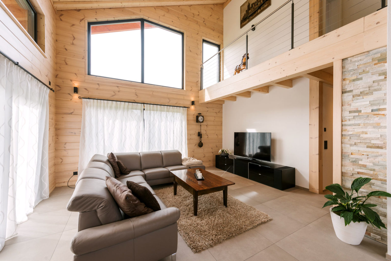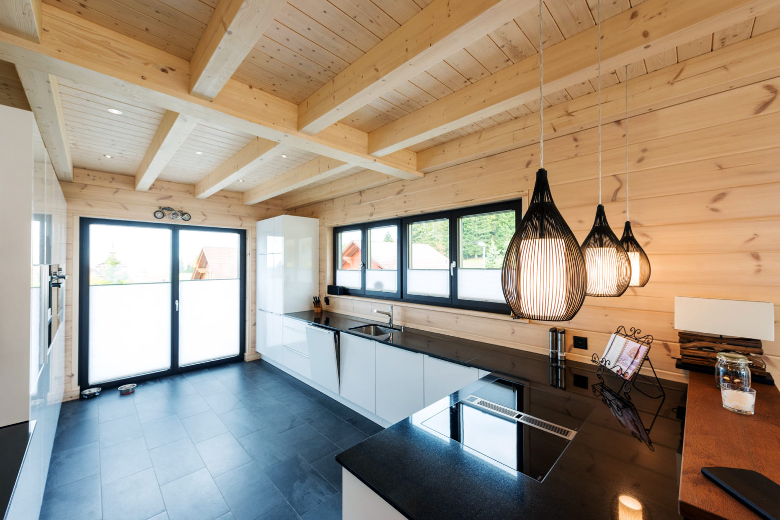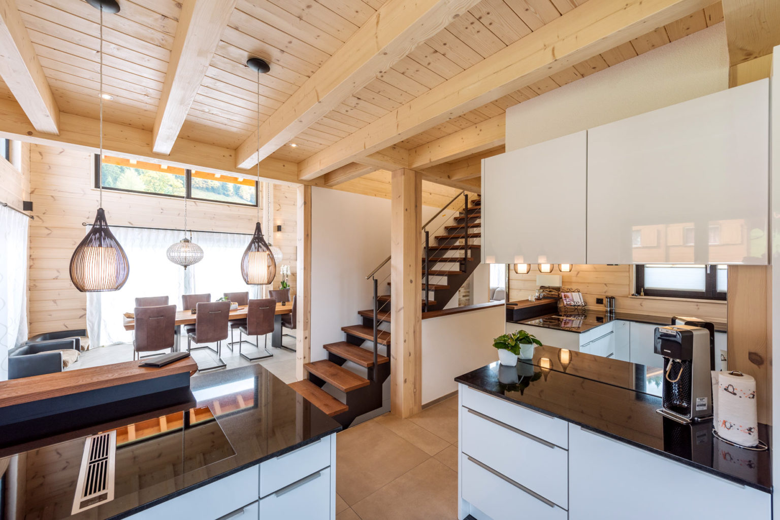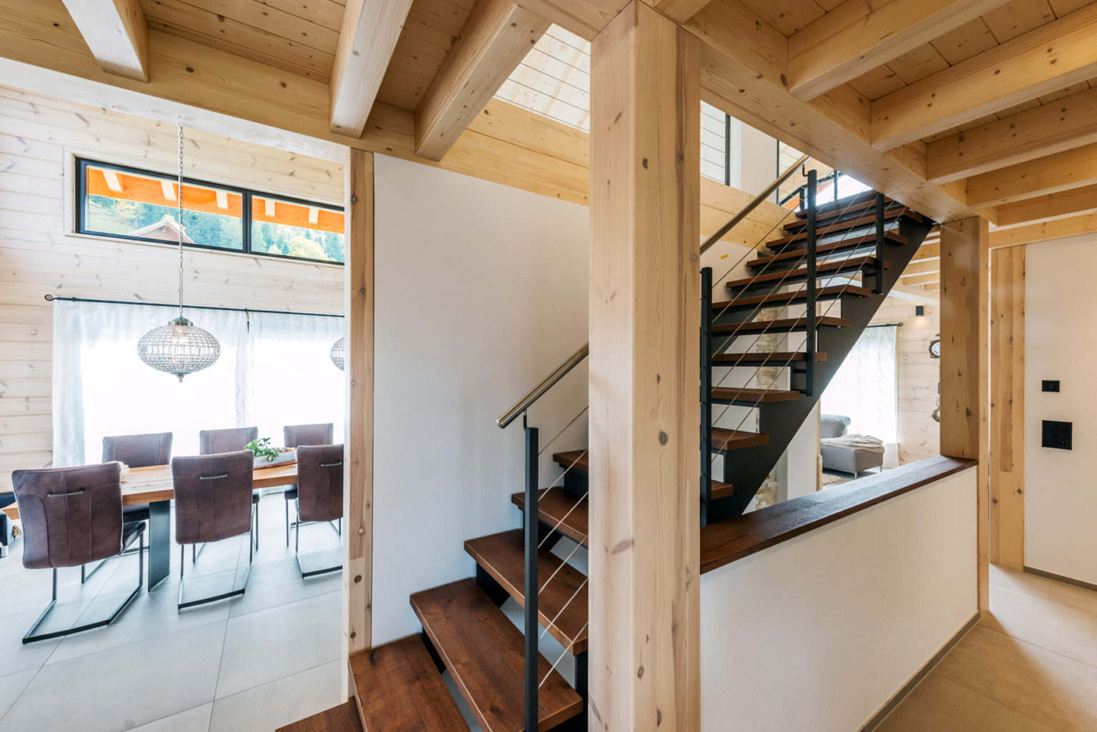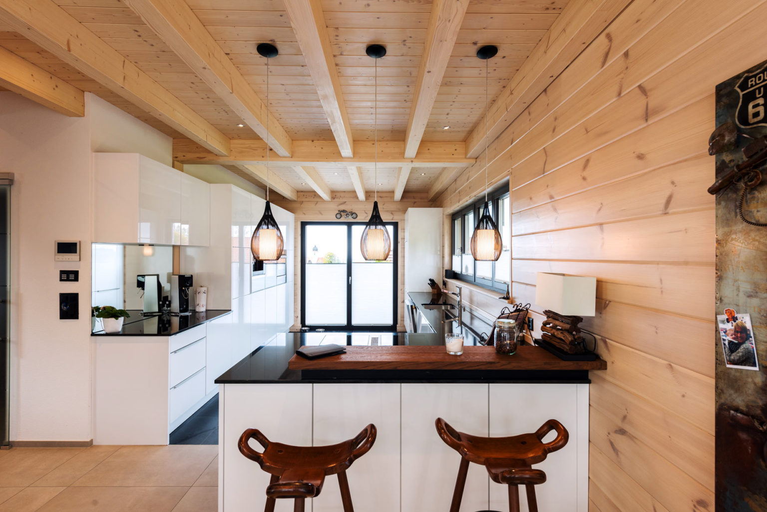 Oberste Priorität hatte für die Eigentümer ihre Freiheit die eigenen Ideen umsetzen zu können. Dazu gehören große Fenster, die viel natürliches Licht einfallen lassen, sowie ein echtes Massivholzhaus zu bauen, das von Stil und Struktur her aber sehr modern ist. Mit Holzhaus "Entlebuch" ist ihnen all dies gelungen, auch dank der Flexibilität und jahrzehntelangen Erfahrung von Fullwood. Verbaut wurde die "Luxuswand" des Holzhausspezialisten, die mit ihren 27cm extra dick ist und die besonders strengen, schweizerischen Energievorschriften locker erfüllt. Das naturhelle Polarkiefernholz der tragenden Außenwände wurde innen mit einer leicht milchigen Lasur behandelt, die einen Tick aufhellt, und mit UV-Schutz vor dem Nachdunkeln bewahrt. Dazu kombinierten die Hauseigner weiß verputzte, leichte Trennwände (Ständerbau), die neben noch mehr Helligkeit das moderne Ambiente im Holzhaus betonen. Für Bodenbeläge, Mobiliar und Dekorationen wurden sehr helle Erdfarben (Sand, Stein) und braun gewählt, die den natürlichen und dezenten Look ergänzen. Ein bis zum First offener, sehr hoher Luftraum erstreckt sich über dem offenen Wohn/Ess-Bereich im Erdgeschoss und betont die Weitläufigkeit der Hausfläche in die Vertikale. Das Ergebnis ist ein besonders großzügiges und "luftiges" Wohngefühl ohne Einengung und Druck. Die imposante, offene Sichtfirstpfette beeindruckt nicht nur als schmückendes Element, sondern betont das Bodenständige und Urtypische, für das ein Holzhaus steht. Behaglichkeit und wohngesundes Raumklima dank chemisch unbehandeltem Massivholz vereint in zeitlosem Ambiente dank moderner (Innen-) Architektur.