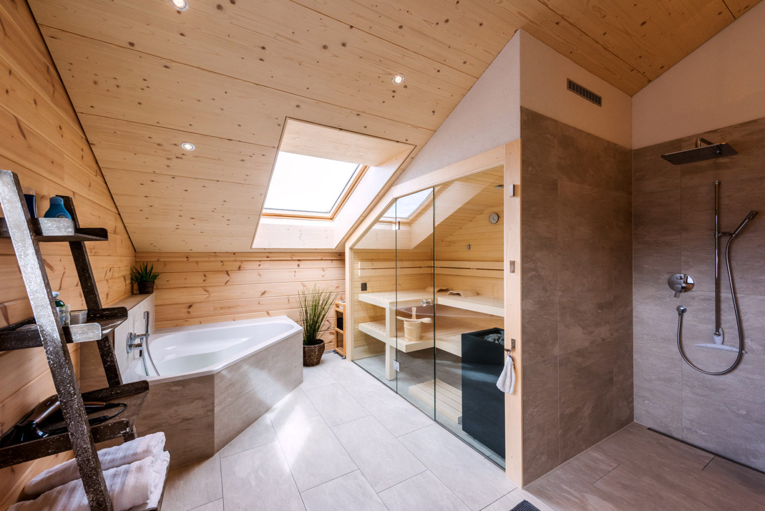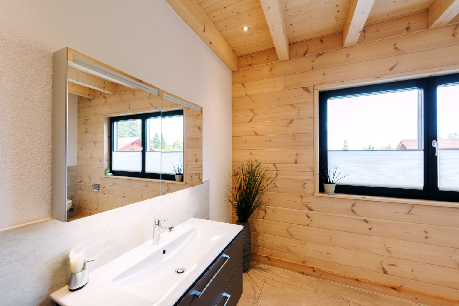 Überzeugt von der Nachhaltigkeit des Baustoffs Holz kommt kein anderes Baumaterial für die Hauseigentümer in Frage. Auf der Suche nach dem passenden Holzhaus Hersteller gefielen die Holzhäuser von Fullwood nicht nur optisch sondern überzeugten besonders durch ihre hohe Qualität. Zudem entspricht die komplett individuelle Planung, wie sie bei Fullwood üblich ist, den Anforderungen der heutigen Hauseigner. Holzhäuser passen perfekt in die ländliche Umgebung vor Ort. Auch bei der Heizung wurde auf Nachhaltigkeit geachtet und eine Kombination aus Geothermie mit Sole-Wasser-Wärmepumpe gewählt. Erdwärme ist eine einheimische und umweltfreundliche Energiequelle, die keine Schadstoffe erzeugt, also auch kein CO2 freisetzt. Für die Erd-Sonde wurden 285 Meter in die Tiefe gebohrt, wo eine konstante Temperatur zwischen 18 und 25 Grad Celsius herrscht. Mittels Wärmepumpe wird die gewonnene Wärme umgewälzt, auf die gewünschte Temperatur gebracht und im Warmwasserspeicher der Fußbodenheizung gespeichert. Der Überschuss wird zur Erwärmung des Brauchwassers genutzt, und eine Indach-Photovoltaikanlage erzeugt sämtlichen benötigten Strom – auch hier wird der Überschuss genutzt, indem er ins öffentliche Netzt geleitet wird. Die Südausrichtung des Hausdachs und dessen Neigung von 24 Grad stellen ideale Voraussetzungen zur Nutzung der solaren Energie dar.