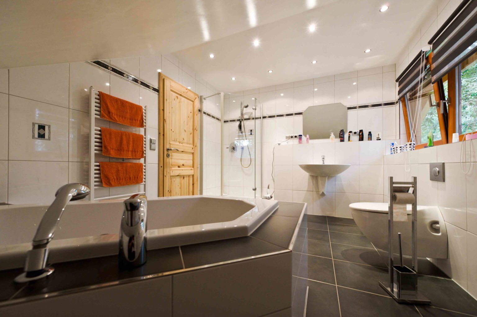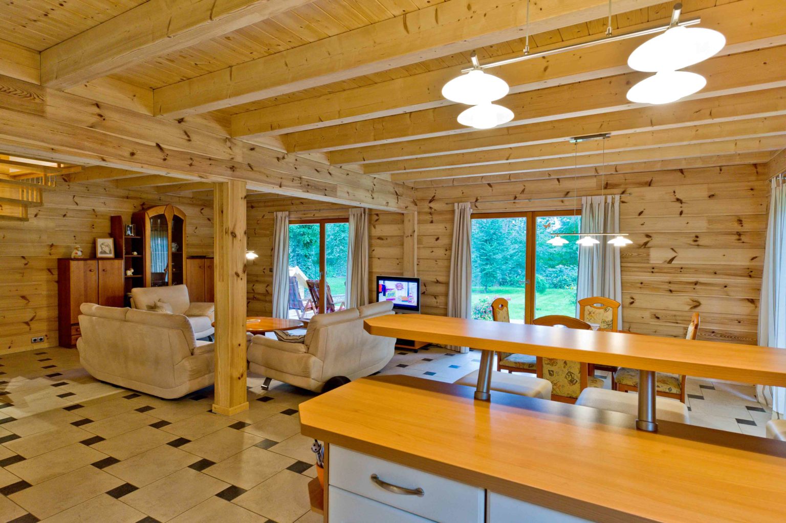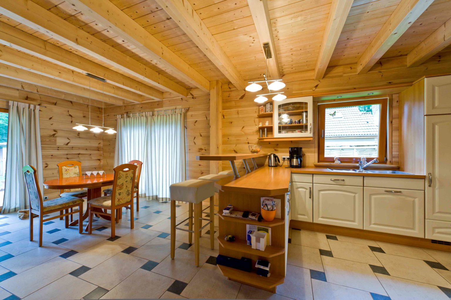 Der Hausherr, ein professioneller Fliesenbauer mit eigenem Betrieb, ist der geborene Universalhandwerker, und hatte viel Spaß am Bauen seines Eigenheims, zumal alles reibungslos klappte. Zusammen mit dem Fullwood-Richtmeister montierte er die im Werk perfekt vorgefertigten Wandelemente in wenigen Tagen, inklusive Dachstuhl. Auch beim Innenausbau legte der Familienvater selbst Hand an und erledigte etwa 80 % aller Arbeiten selbst. Nach insgesamt 4 Monaten Bauzeit konnte die Familie in ihr rundum fertiges Holzhaus einziehen. Mit der hervorragenden, immer zuverlässigen Betreuung seitens Fullwood war und ist das Ehepaar extrem zufrieden – man kümmerte sich sehr gut um sie! Die Außenwände strichen die Eigentümer dreimal mit UV- und Witterungsschutz, um ein Vergrauen des Kiefernholzes zu verhindern. Auch im Innenbereich wollten sie die natürliche Farbe der Vollholzwände erhalten und verwendeten dort eine UV-Schutzlasur gegen Nachdunkeln. Helle Fliesenböden und mit weißem Reibeputz verkleidete Trennwände (Ständerbau) tragen zur Helligkeit in Holzhaus „Falkenforst“ bei. Viel natürliches Licht durfte auch nicht fehlen, weshalb etliche, teils bodentiefe, Fenster eingebaut wurden. Die Fensterrahmen sind, genau wie alle Türen, ebenfalls aus Holz – ein anderes Material hätte nach Ansicht der Besitzer nicht gepasst. Im Dachgeschoss verzichteten sie auf Holzoberflächen, wollten dort lieber alles weiß haben. Deshalb wurde Holzhaus „Falkenforst“ nur im Erdgeschoss mit der massiven 20-er Blockbohlenwand von Fullwood gebaut, auf die eine Kombiblockwand des erfahrenen Holzhausspezialisten gesetzt wurde. Dank der Setzungsfreiheit beider Wandsysteme konnten beide problemlos miteinander kombiniert werden.