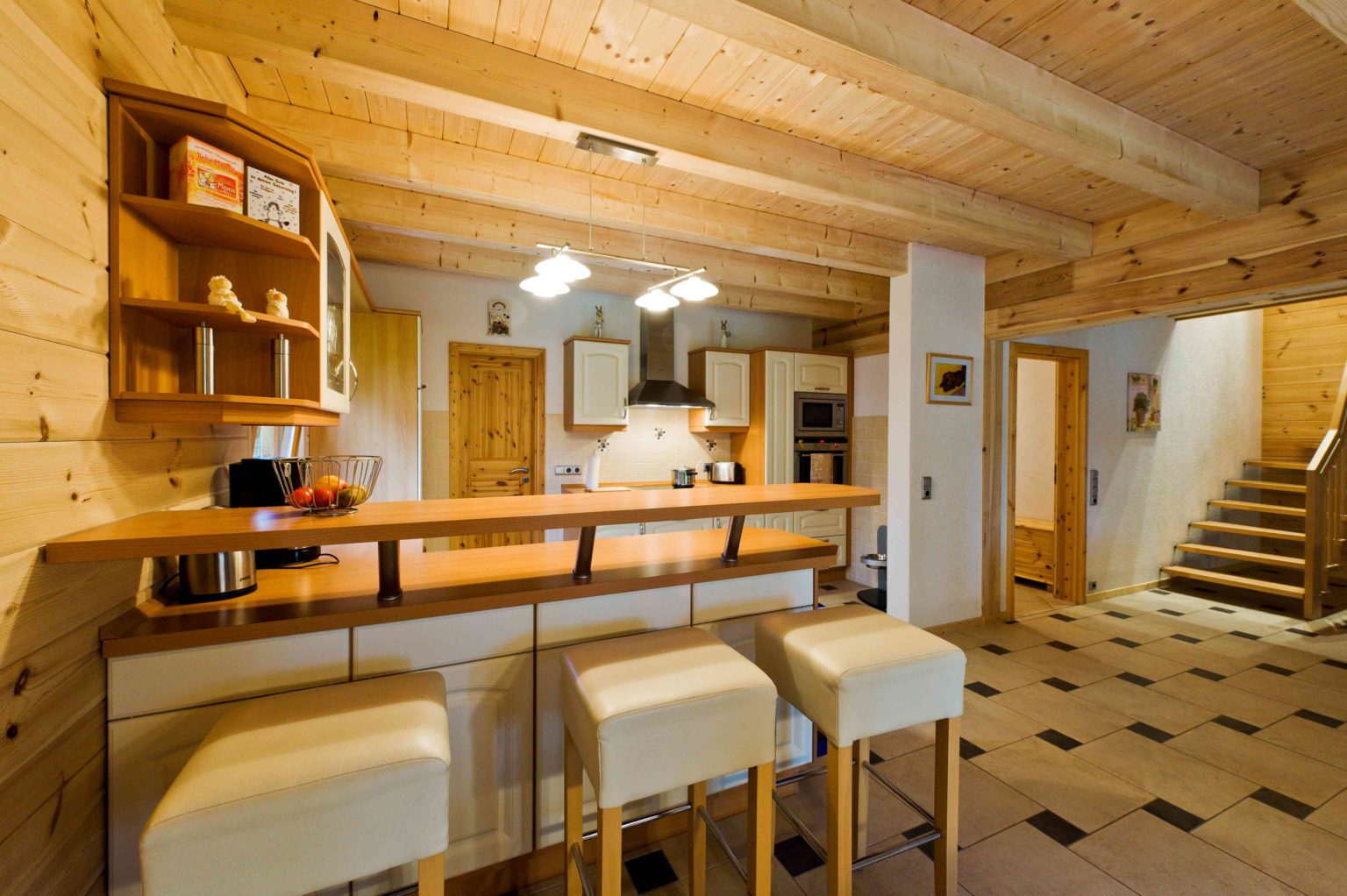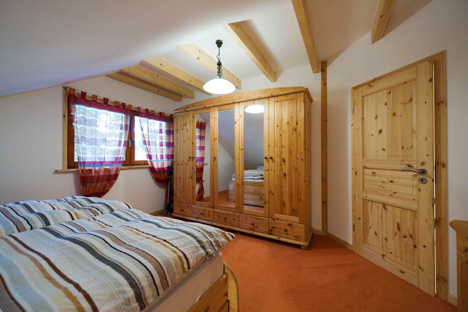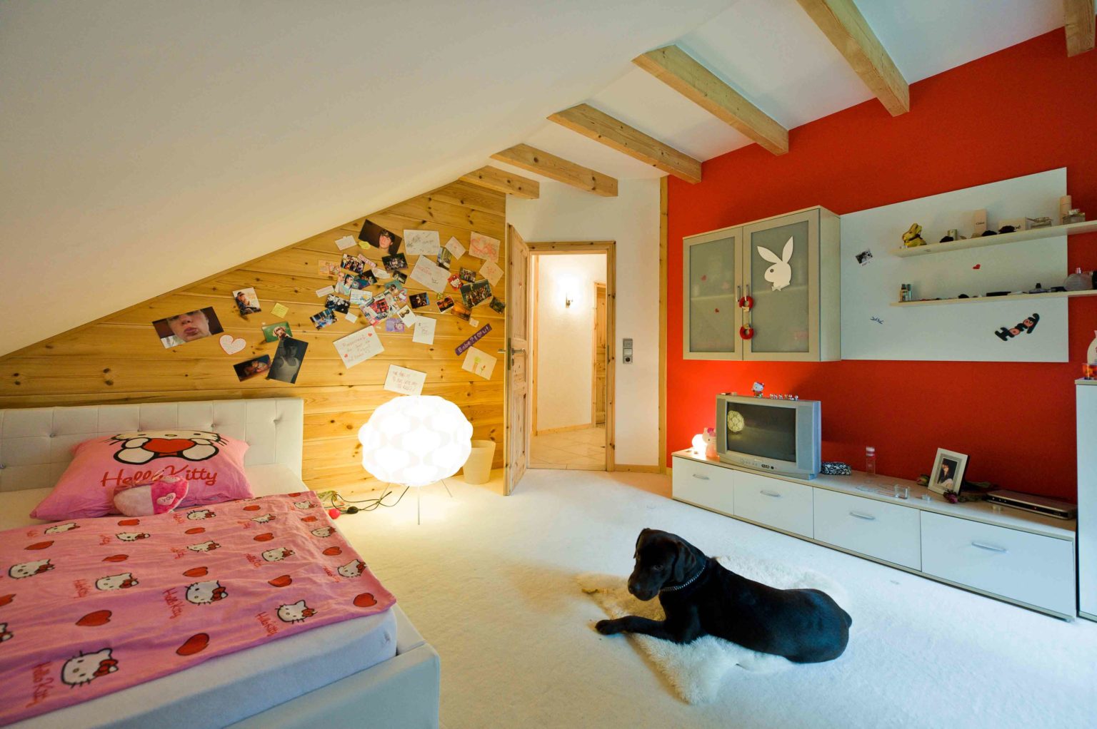 Der Hausherr, ein professioneller Fliesenbauer mit eigenem Betrieb, ist der geborene Universalhandwerker, und hatte viel Spaß am Bauen seines Eigenheims, zumal alles reibungslos klappte. Zusammen mit dem Fullwood-Richtmeister montierte er die im Werk perfekt vorgefertigten Wandelemente in wenigen Tagen, inklusive Dachstuhl. Auch beim Innenausbau legte der Familienvater selbst Hand an und erledigte etwa 80 % aller Arbeiten selbst. Nach insgesamt 4 Monaten Bauzeit konnte die Familie in ihr rundum fertiges Holzhaus einziehen. Mit der hervorragenden, immer zuverlässigen Betreuung seitens Fullwood war und ist das Ehepaar extrem zufrieden – man kümmerte sich sehr gut um sie! Die Außenwände strichen die Eigentümer dreimal mit UV- und Witterungsschutz, um ein Vergrauen des Kiefernholzes zu verhindern. Auch im Innenbereich wollten sie die natürliche Farbe der Vollholzwände erhalten und verwendeten dort eine UV-Schutzlasur gegen Nachdunkeln. Helle Fliesenböden und mit weißem Reibeputz verkleidete Trennwände (Ständerbau) tragen zur Helligkeit in Holzhaus „Falkenforst“ bei. Viel natürliches Licht durfte auch nicht fehlen, weshalb etliche, teils bodentiefe, Fenster eingebaut wurden. Die Fensterrahmen sind, genau wie alle Türen, ebenfalls aus Holz – ein anderes Material hätte nach Ansicht der Besitzer nicht gepasst. Im Dachgeschoss verzichteten sie auf Holzoberflächen, wollten dort lieber alles weiß haben. Deshalb wurde Holzhaus „Falkenforst“ nur im Erdgeschoss mit der massiven 20-er Blockbohlenwand von Fullwood gebaut, auf die eine Kombiblockwand des erfahrenen Holzhausspezialisten gesetzt wurde. Dank der Setzungsfreiheit beider Wandsysteme konnten beide problemlos miteinander kombiniert werden.