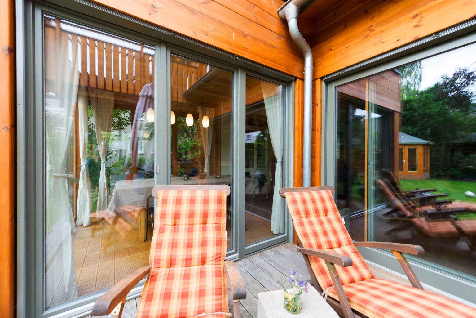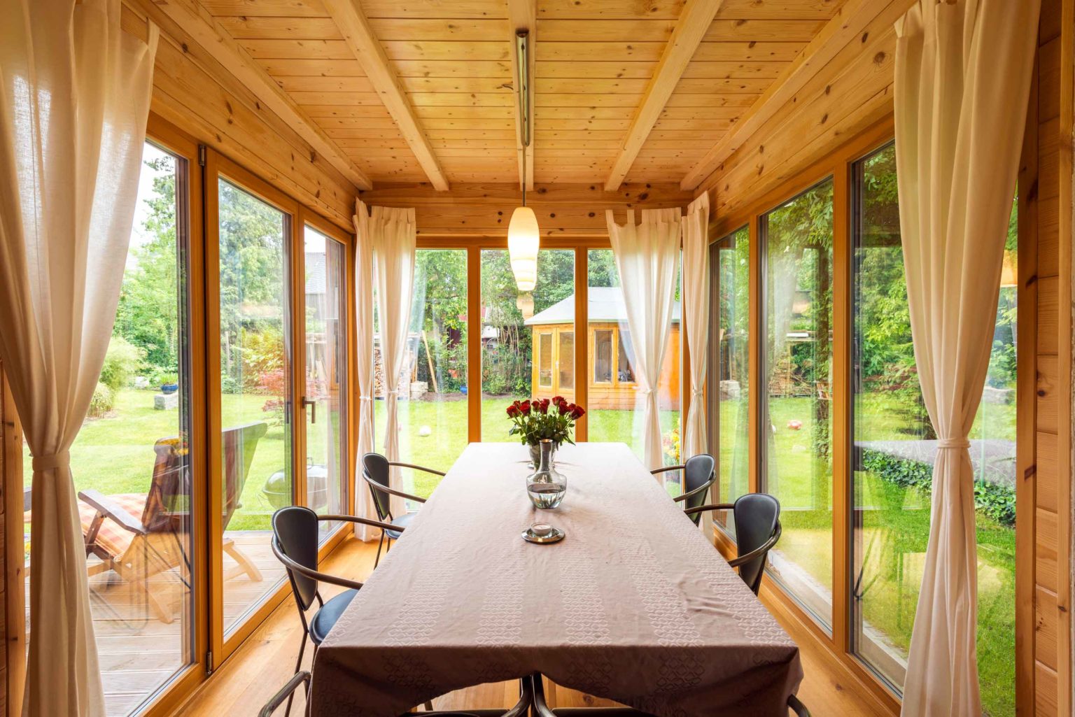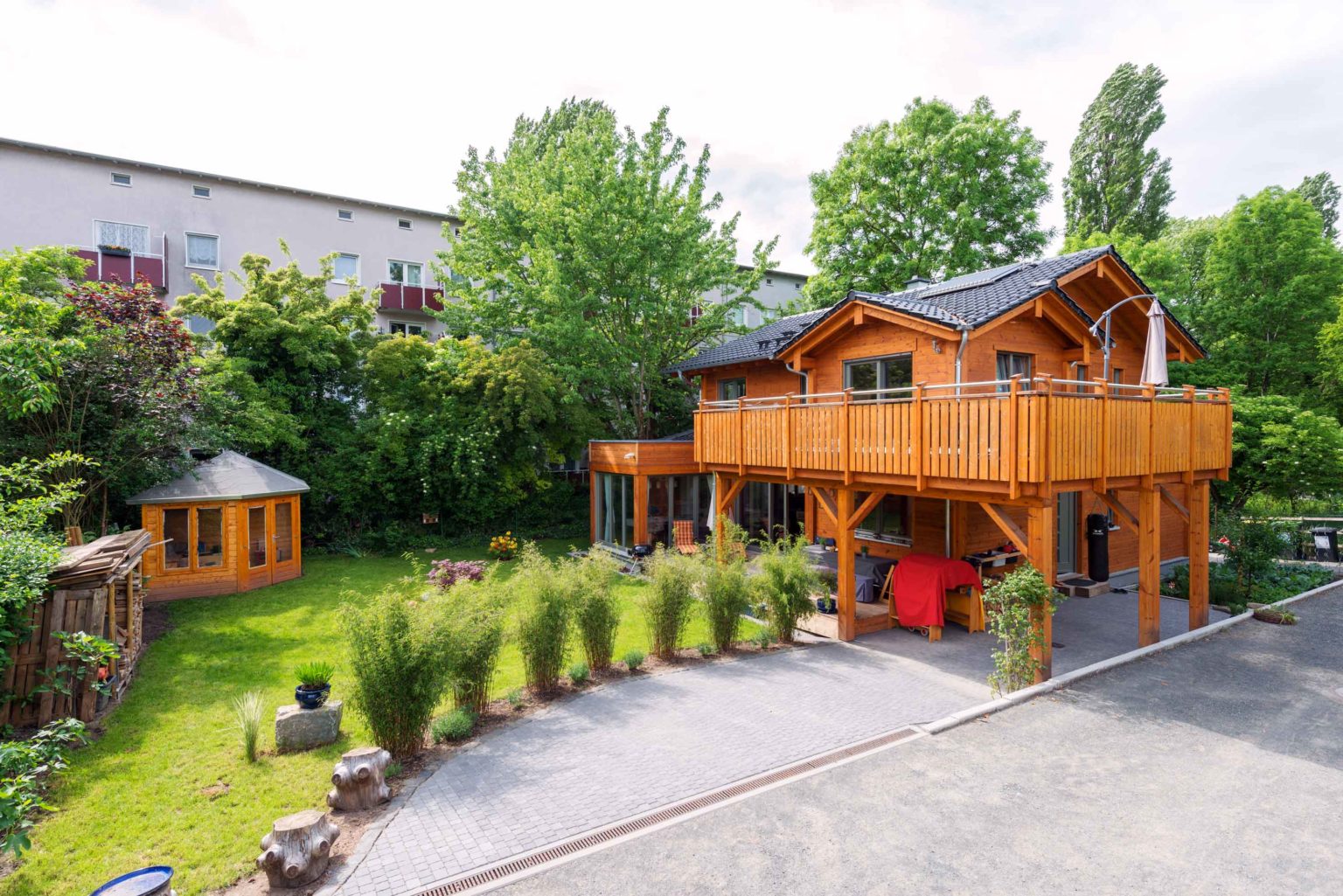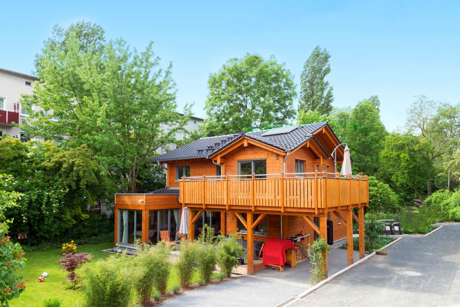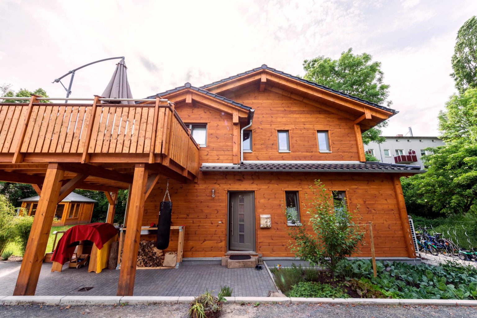 Wichtig waren den Eigentümern von Holzhaus „Frankfurt“ vor allem reichlich natürlicher Lichteinfall und hohe Räume. Deshalb planten sie viele, teils bodentiefe Fenster ein und erweiterten die übliche Raumhöhe um zwei zusätzliche Balkenlagen. Außerdem sollte ihr neues Eigenheim unbedingt zwei Vollgeschosse und einen Keller haben, damit die fünfköpfige Familie genug Platz hat. Aufgrund der deutlich höheren Bebauung in der urbanen Nachbarschaft war auch das kein Problem. Neben einer großen Rasenfläche zum Spielen im Garten legte das junge Ehepaar noch Wert auf eine überdachte Terrasse im Erdgeschoss und einen großflächigen, terrassenartigen Balkon im Obergeschoss. Während letzteres ganz den drei Kindern gehört, ist das Erdgeschoss – vor allem der offene Wohn/Ess/Kochbereich – fürs Familienleben gedacht. Ein privater Rückzugsbereich steht den geforderten Familienoberhäuptern hier selbstverständlich auch zur Verfügung! Praktischer Hausgrundriss im Quadrat Der Grundriss von Holzhaus „Frankfurt“ ist quadratisch mit einem voll verglasten Wintergarten, der an der südlichen Seite des Erdgeschosses heraustritt. Der Hauseingang befindet sich an der Ostseite und führt in eine Diele nebst Treppenhaus. Durch eine Tür gelangt man in den großen, offenen Wohnbereich mit Küchenecke, Sofalandschaft und Esszimmer (im Wintergarten). Von hier aus geht es in den Elterntrakt mit Schlafzimmer, angeschlossener Ankleide und separatem, großen Badezimmer. Im Obergeschoss betritt man einen Flur, von dem aus es in die drei Kinderzimmer und ein Kinder-Bad/WC geht. Vom Zimmer des Ältesten, in der Süd/Ost-Ecke, gelangt man auf den riesigen, aufgeständerten Balkon. Darunter befindet sich ein Carport und ein Stück überdachte Terrasse.