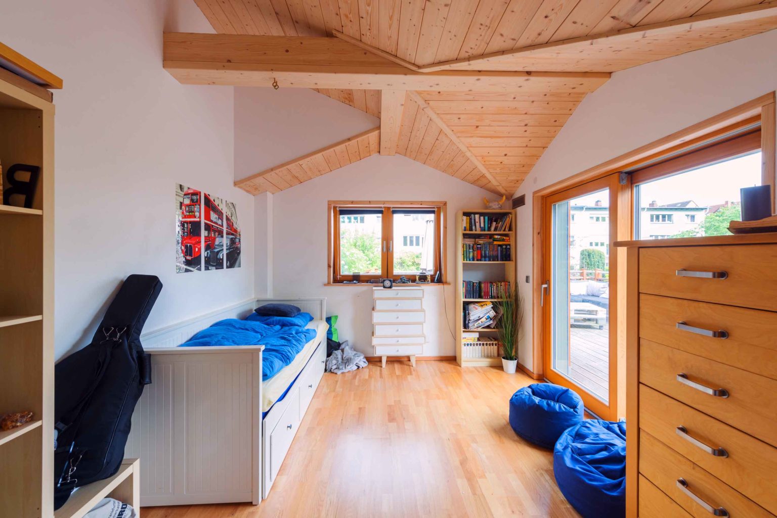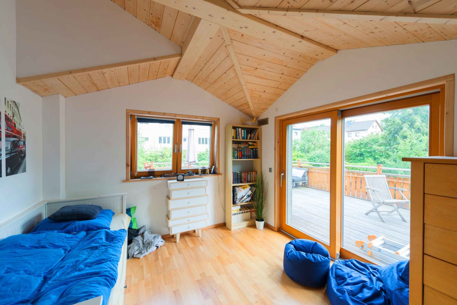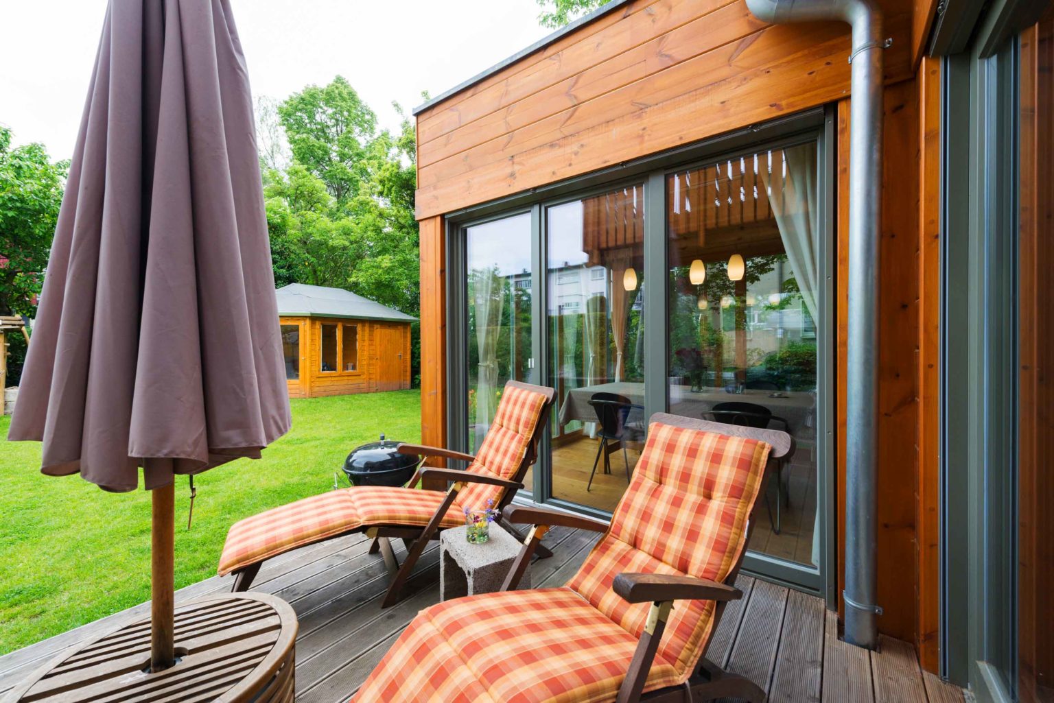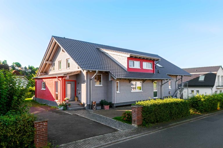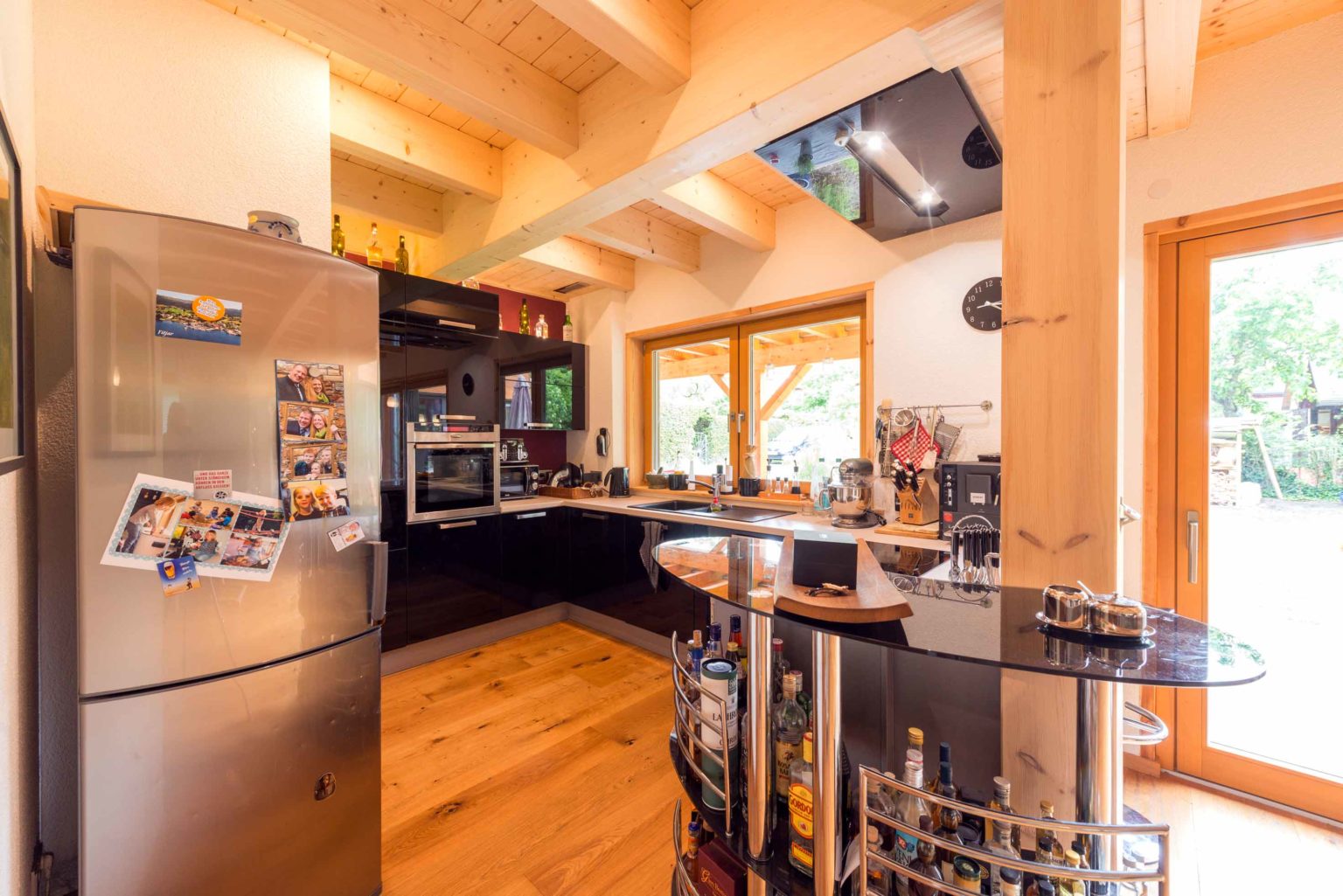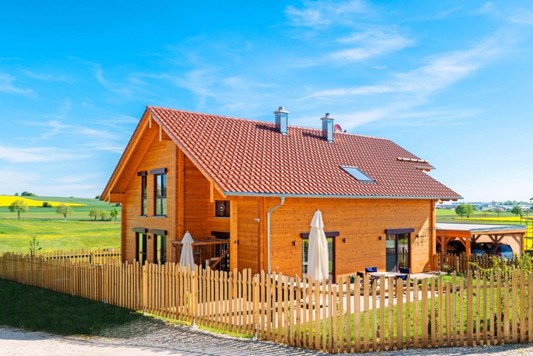 Ihren Haushersteller, Fullwood, fand die Familie im Internet, wo sie verschiedene Holzhaus Spezialisten verglich. Die Optik der glatten Holzwände gefiel dem Ehepaar, ebenso die Setzungsfreiheit und absolute Winddichtigkeit der Hauswände, vereint mit einem niedrigen U-Wert. Nachdem ein Musterhaus von Fullwood besichtigt worden war, entschieden sich die damaligen Bauinteressenten endgültig für diesen Holzhaus Spezialisten und planten Holzhaus „Frankfurt“ zuerst ganz allein. Ihr Kundenberater ging ganz selbstverständlich auf die Wünsche und Vorstellungen der Baufamilie ein und änderte nur ein paar Details des Hausentwurfs. Die Hauswände wurden dann in wenigen Elementen passgenau im Werk vorgefertigt und später termingetreu zum Bauplatz geliefert. Dort hievte sie ein Kran an Ort und Stelle und das Montageteam von Fullwood legte los. In wenigen Tagen montierten die erfahrenen Handwerker das Holzhaus und arbeiteten dabei rasch und sehr akkurat. Der Dachstuhl wurde schließlich vor Ort mit den exakt zugeschnittenen Balken gezimmert. Nach insgesamt einem halben Jahr Bauzeit konnte die Familie ihr Traumhaus schon beziehen.