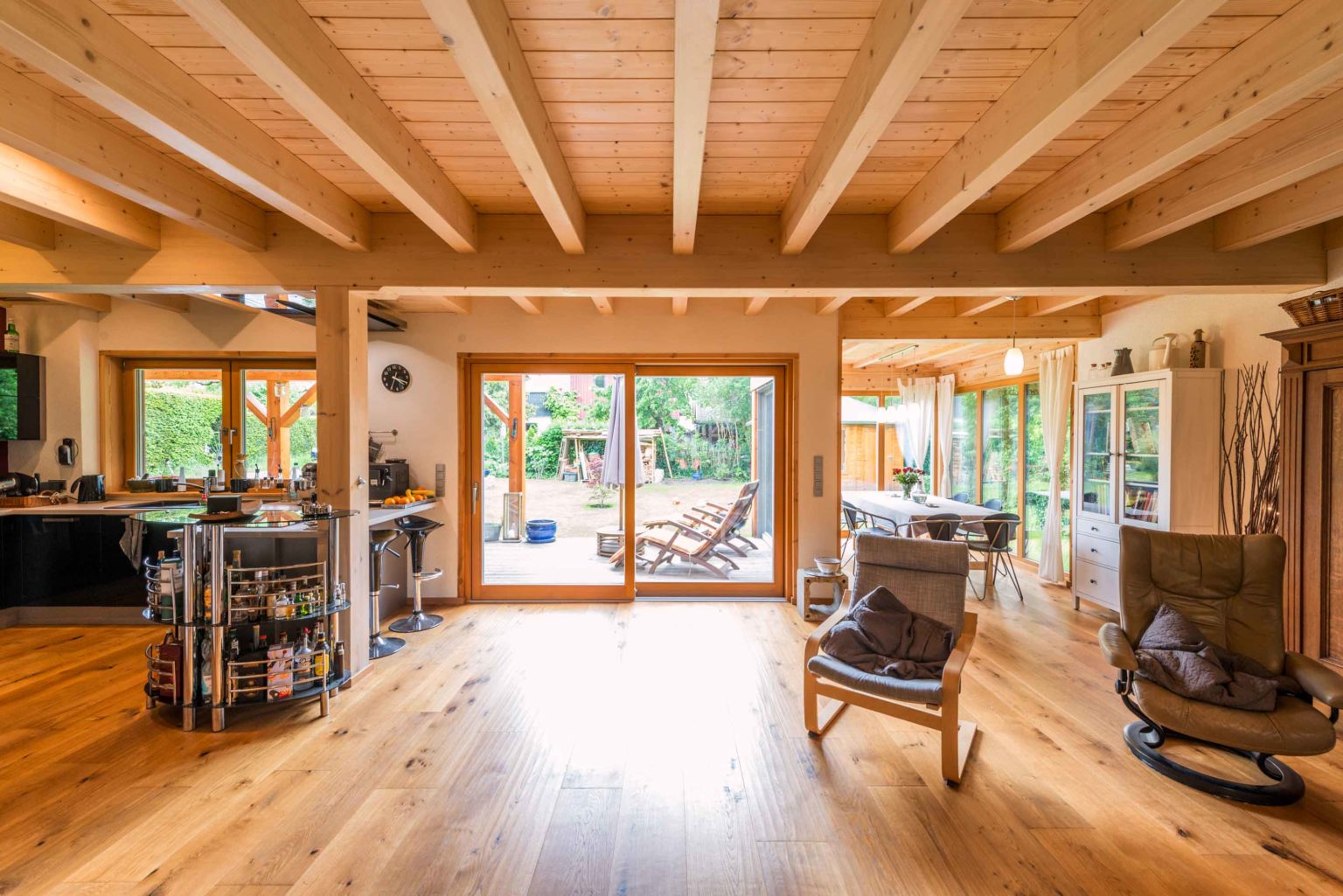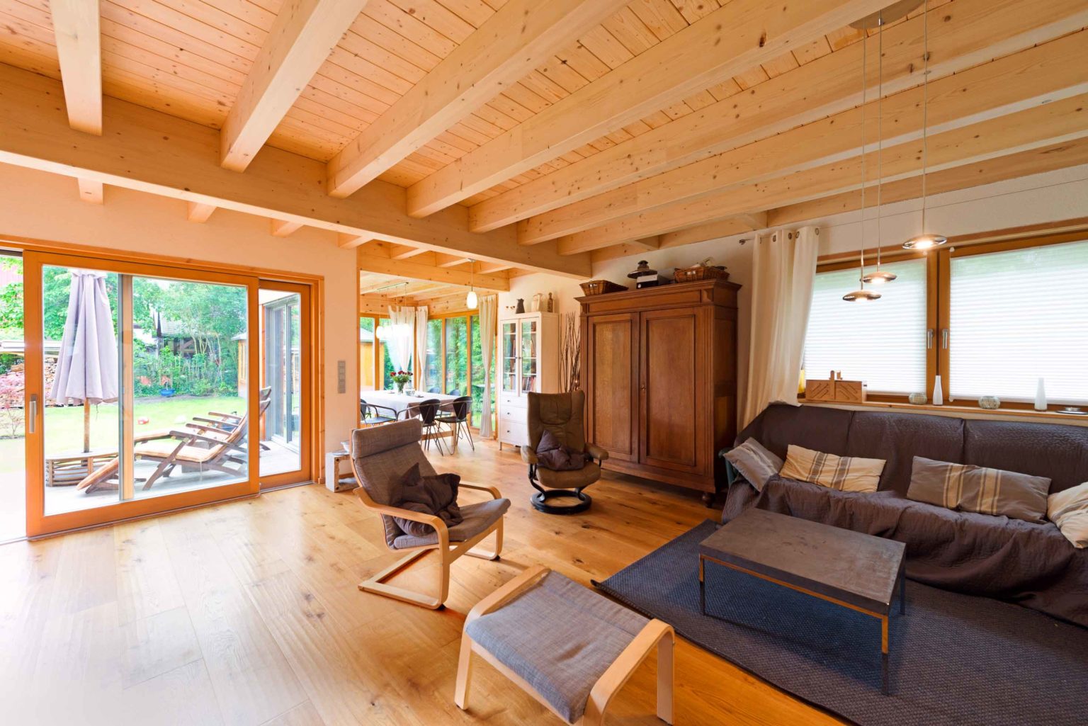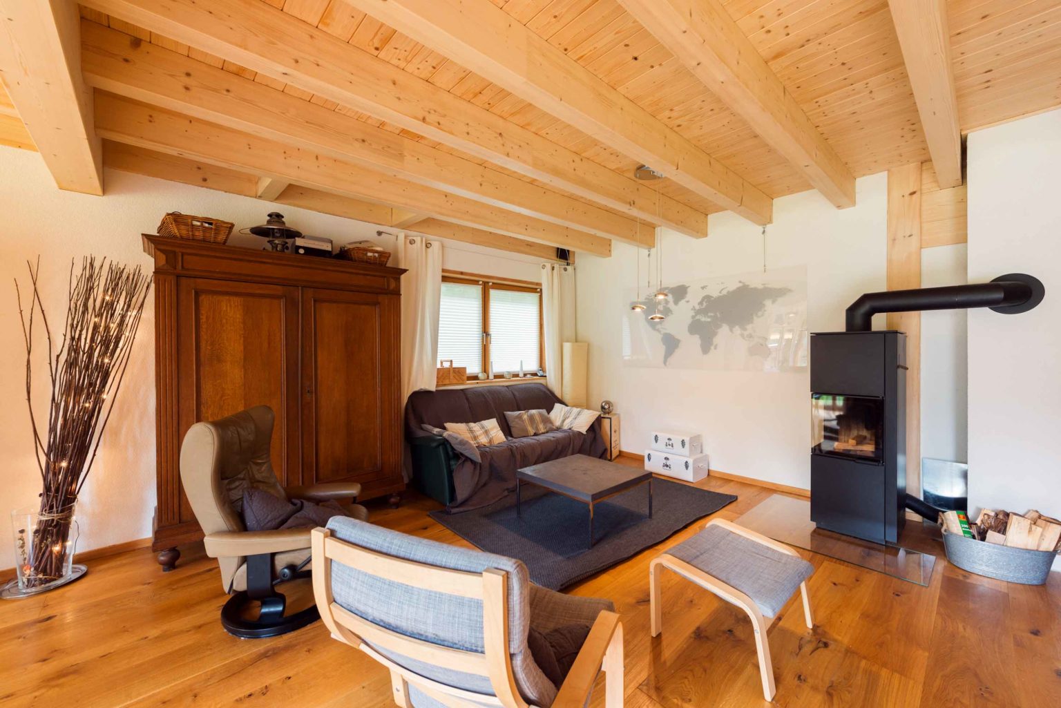 Ausschließlich Holzoptik wollte das Eigentümerpaar nicht haben, weshalb es sich für die Kombiblockwand von Fullwood entschied. Nun sieht Holzhaus „Frankfurt“ äußerlich wie ein ganz massives Holzhaus aus, während drinnen ausschließlich weiß verputzte Hauswände die Räume erhellen. Auf eine naturhelle Sichtbalkendecke aus massivem Kiefernholz und einen Eichendielenboden legten die beiden aber Wert und ließen nur im Flur und in den Bädern Fliesen verlegen. Damit die Holzdecke nicht nachdunkelt, wurde sie mit UV-Schutz behandelt. Die Holzfenster sind innen in einem warmen Holz-Ton gestrichen und außen grau gehalten, was drinnen gut zum Holzfußboden und der Holzbalkendecke passt und draußen zu den dunkelgrauen Dachziegeln und Terrassenplatten. Zur Wärmegewinnung verlässt sich die Familie auf ihre Luft/Wasser-Wärmepumpe, einen wasserführenden Kaminofen im Wohnbereich und eine solare Anlage auf dem Hausdach. Der Wärmespeicher im Keller fasst insgesamt 850 l. Im gesamten Holzhaus ist Fußbodenheizung verlegt.