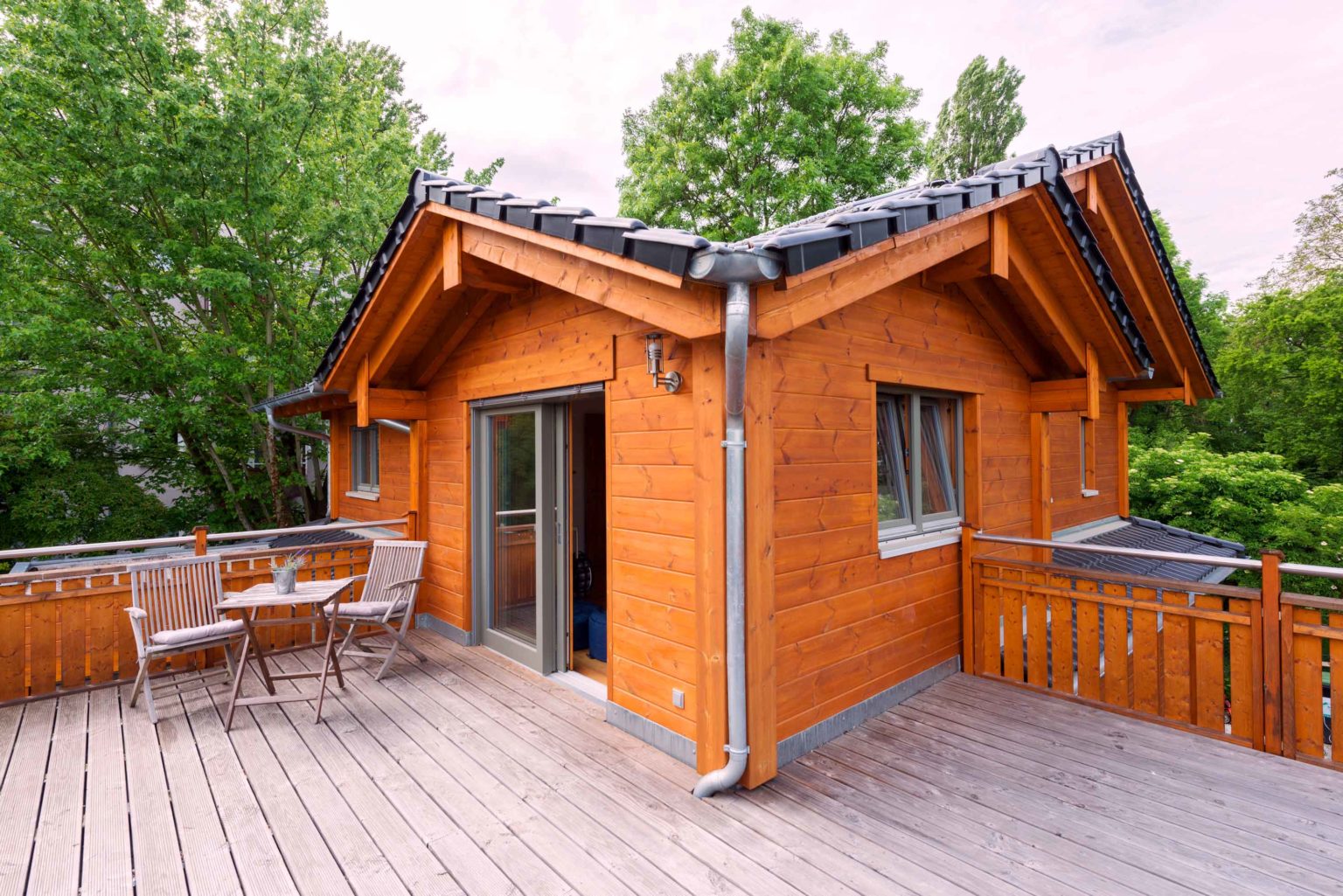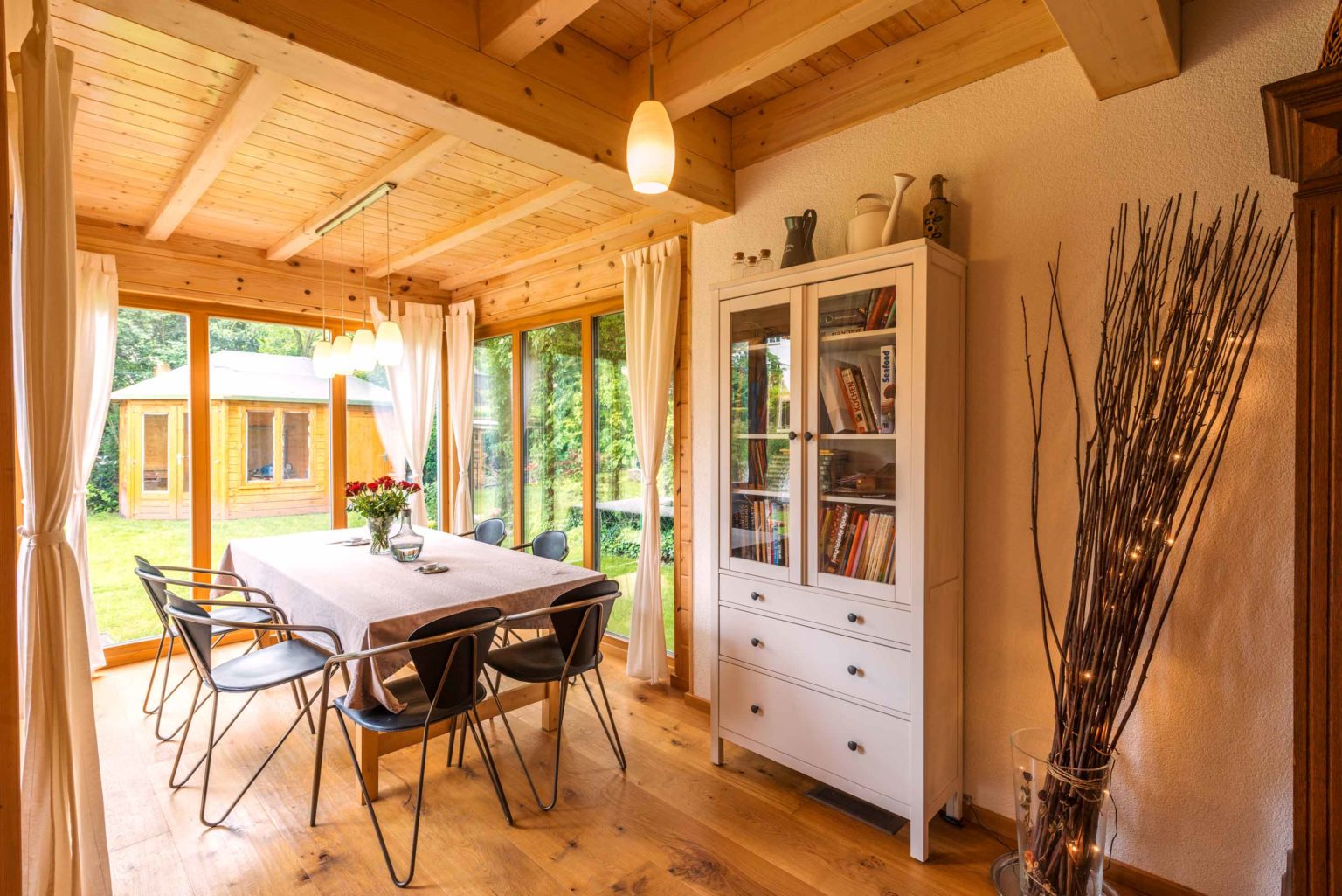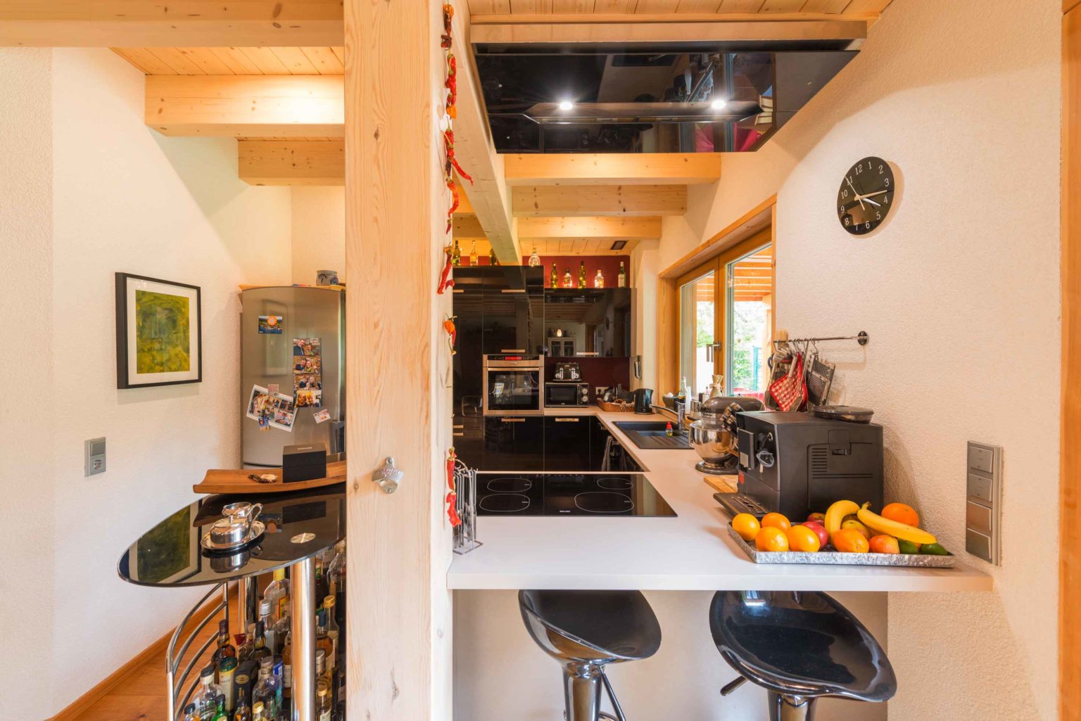 Ausschließlich Holzoptik wollte das Eigentümerpaar nicht haben, weshalb es sich für die Kombiblockwand von Fullwood entschied. Nun sieht Holzhaus „Frankfurt“ äußerlich wie ein ganz massives Holzhaus aus, während drinnen ausschließlich weiß verputzte Hauswände die Räume erhellen. Auf eine naturhelle Sichtbalkendecke aus massivem Kiefernholz und einen Eichendielenboden legten die beiden aber Wert und ließen nur im Flur und in den Bädern Fliesen verlegen. Damit die Holzdecke nicht nachdunkelt, wurde sie mit UV-Schutz behandelt. Die Holzfenster sind innen in einem warmen Holz-Ton gestrichen und außen grau gehalten, was drinnen gut zum Holzfußboden und der Holzbalkendecke passt und draußen zu den dunkelgrauen Dachziegeln und Terrassenplatten. Zur Wärmegewinnung verlässt sich die Familie auf ihre Luft/Wasser-Wärmepumpe, einen wasserführenden Kaminofen im Wohnbereich und eine solare Anlage auf dem Hausdach. Der Wärmespeicher im Keller fasst insgesamt 850 l. Im gesamten Holzhaus ist Fußbodenheizung verlegt.