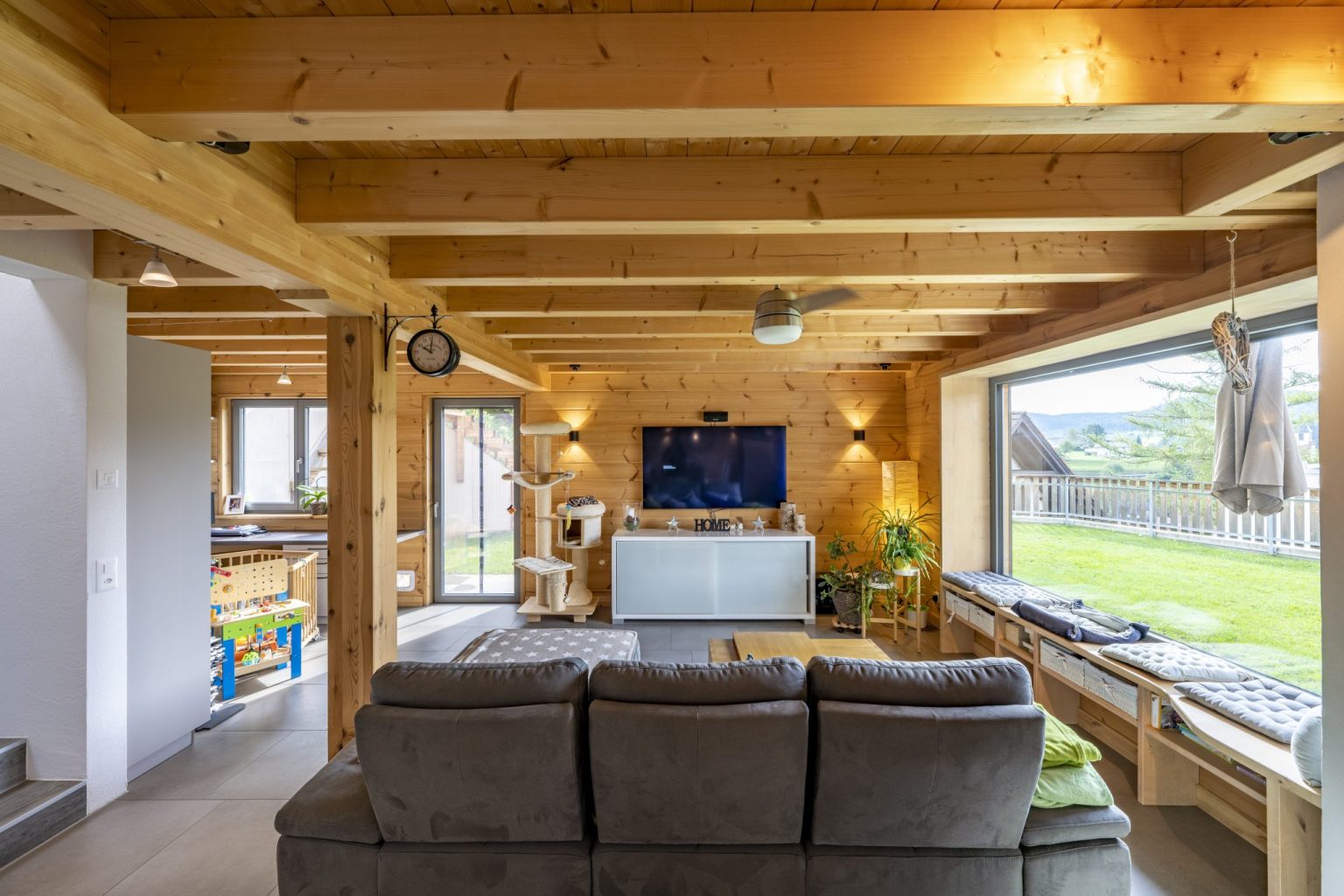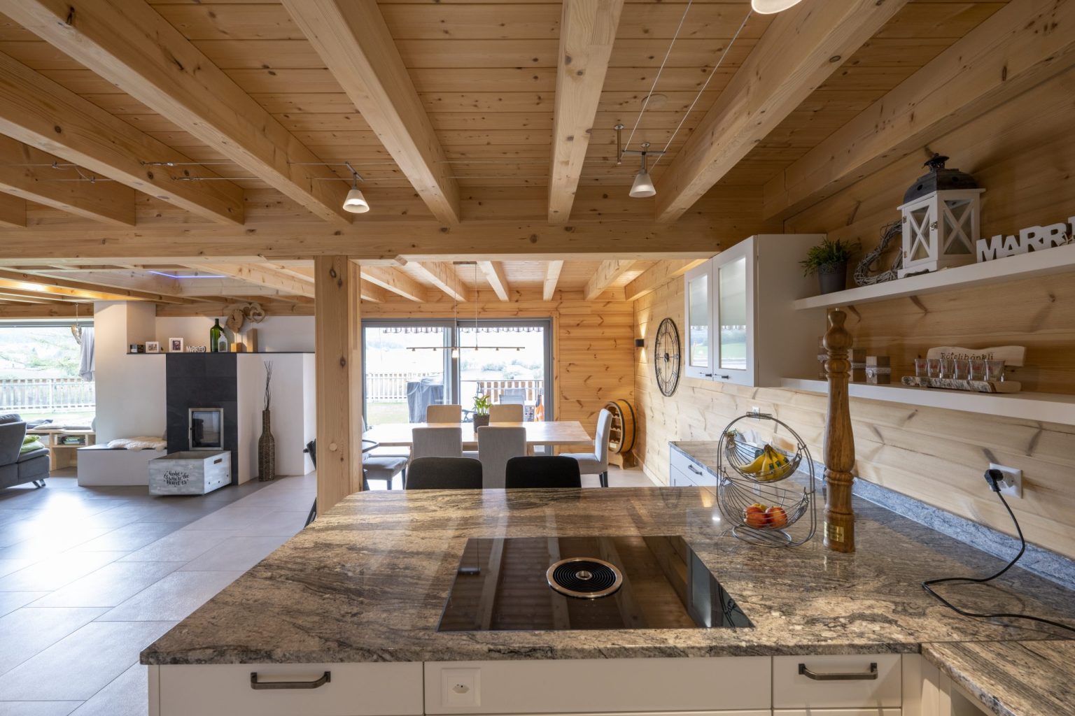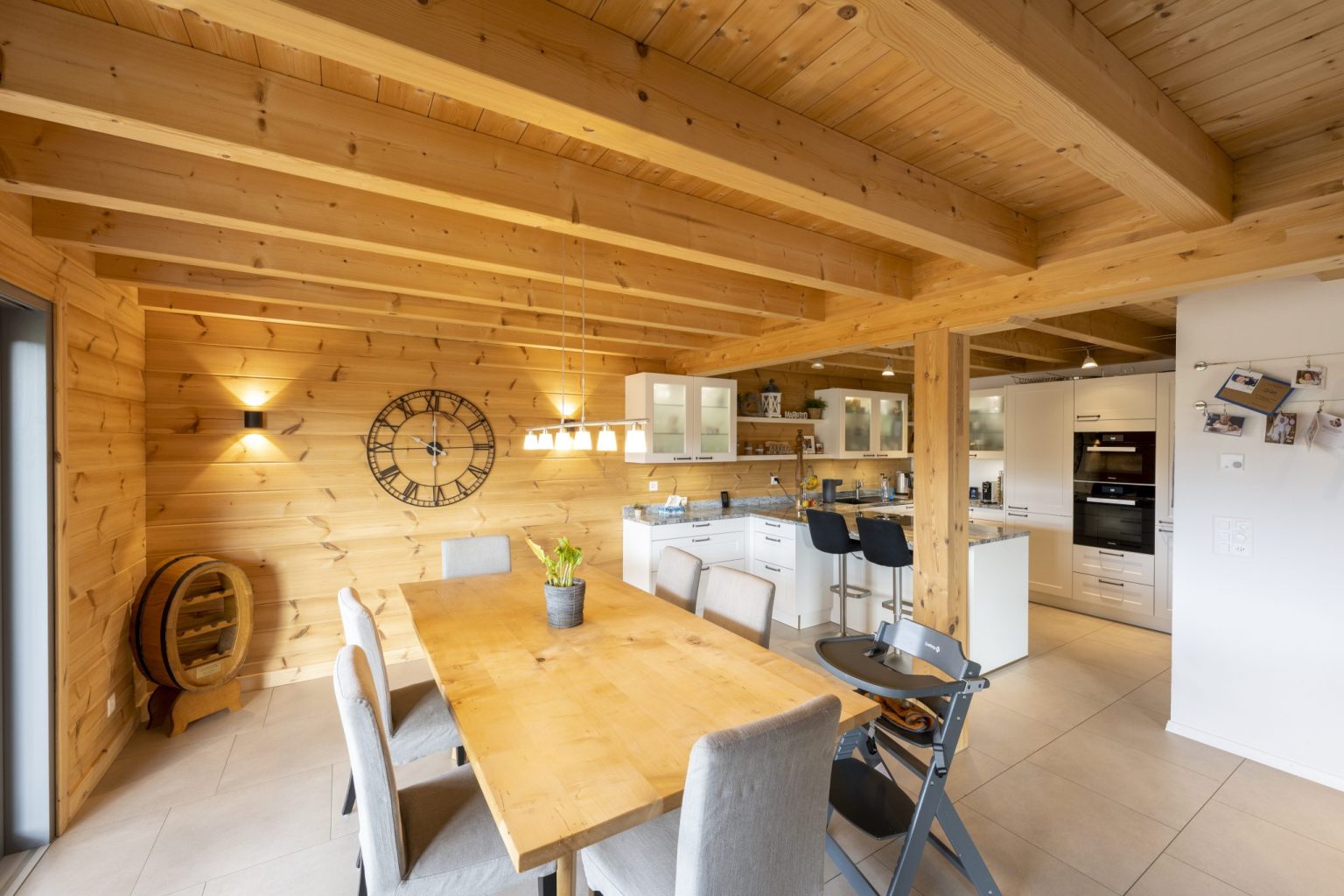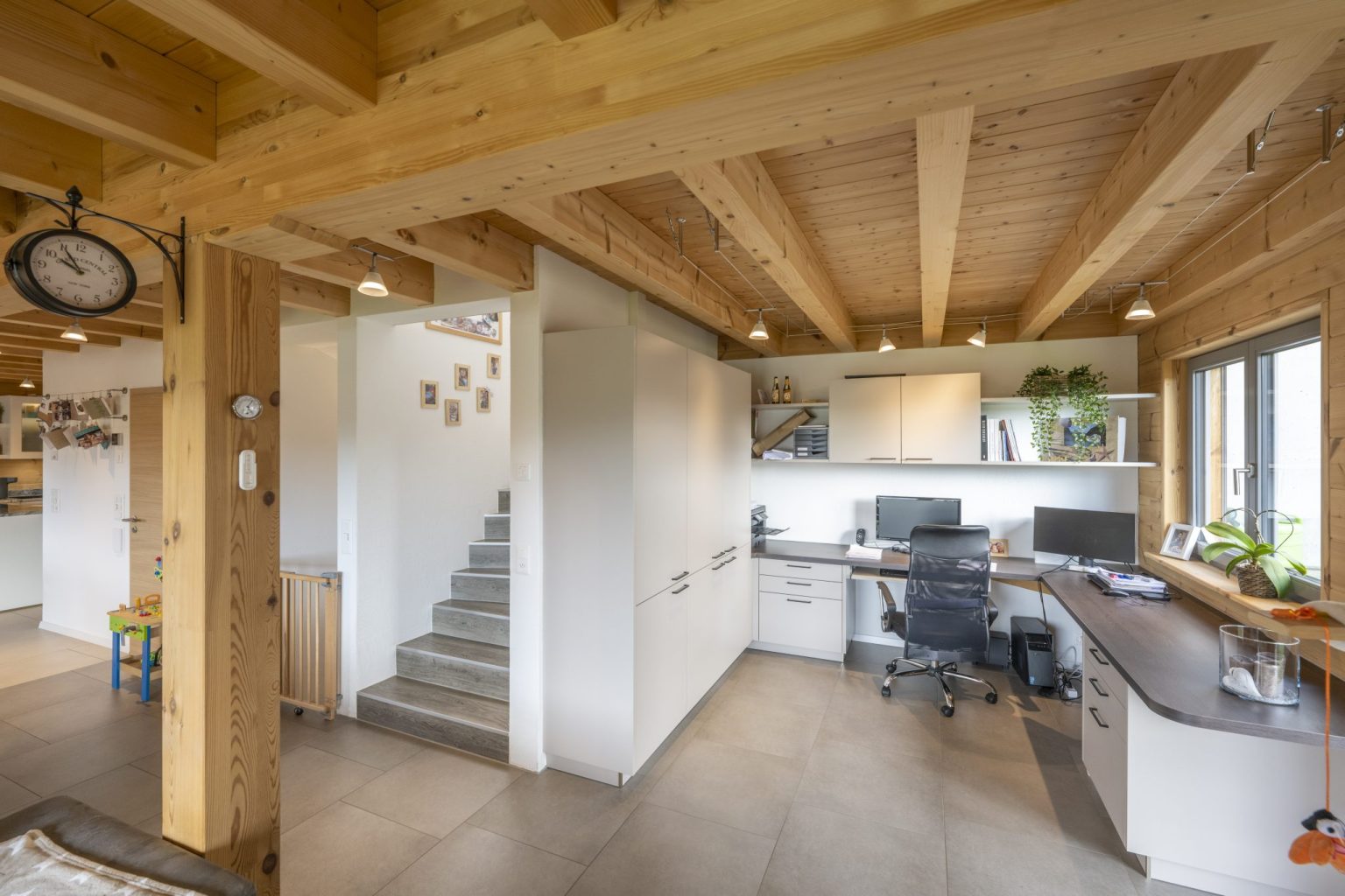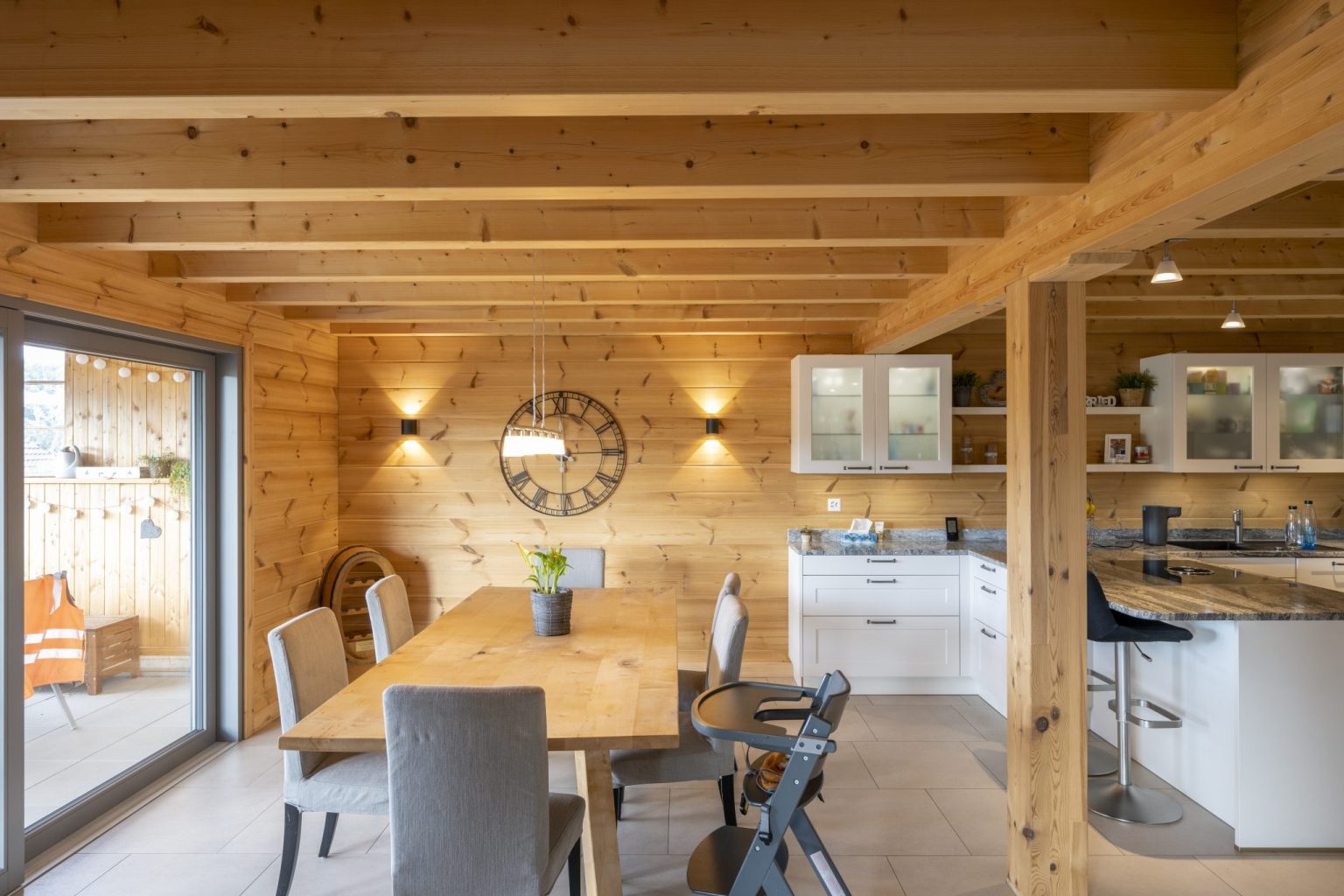 Bei Frank und Sarah Möri dreht sich alles ums Holz, sowohl beruflich als auch privat. Der Forstwart und seine Frau führen ein Dienstleistungsunternehmen, das von der Waldbewirtschaftung über die Areal- und Landschaftspflege bis hin zu Bagger- und Maschinenarbeiten alles Rund um Wald- und Wiese anbietet. Natürlich träumte das Ehepaar von einem eigenen, massiven Holzhaus, das mit Holz beheizt würde, was sonst? Die Befürchtung, sich ein Haus aus dem wertigen Rohstoff nicht leisten zu können, stellte sich glücklicherweise als unbegründet heraus, da man willens und in der Lage war, beim Hausbau und Innenausbau viel selbst zu machen. „Auf einer Baumesse entdeckten wir Fullwood Wohnblockhaus und kamen gleich ganz konkret ins Gespräch. Uns gefiel die Bauweise an sich und die Kombination von ungedämmten Blockwänden mit weiß gestrichenen Trennwänden in leichter Ständerbauweise, das wirkt hell und modern.“, erzählt Sarah Möri. Die heimelige Atmosphäre, die Holz erzeugt und die grundsätzlich in einem Holzhaus herrscht, gepaart mit Geradlinigkeit und schlichten weißen Innenwänden entspricht genau den Vorstellungen der Möris. „Geplant haben wir unser Holzhaus in enger Zusammenarbeit mit Fullwood. Unser Berater hatte super Ideen und fertigte eine Entwurfszeichnung an, die dann vom Architekten und Statiker technisch umgesetzt wurde.“, berichtet Frank Möri. Dabei musste der Keller mit dem Nachbarhaus zusammen geplant werden. „Obwohl es sich beim Nachbarhaus nicht um ein Holzhaus handelt, war der Anbau daran kein Problem. Einer der vielen Vorteile der modernen Fertigungstechnik von Fullwood ist nämlich die nahezu vollkommene Setzungsfreiheit der Blockwände.“, weiß der Eigentümer von Holzhaus „Fricktal“. Diese Eigenschaft ermöglicht eine Kombination der Holzwand (in diesem Fall ist sie 27cm dick) mit jedem anderen Material.