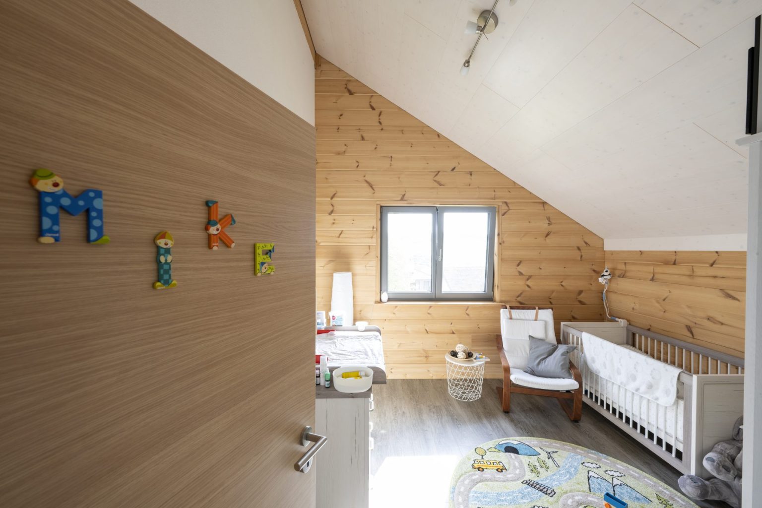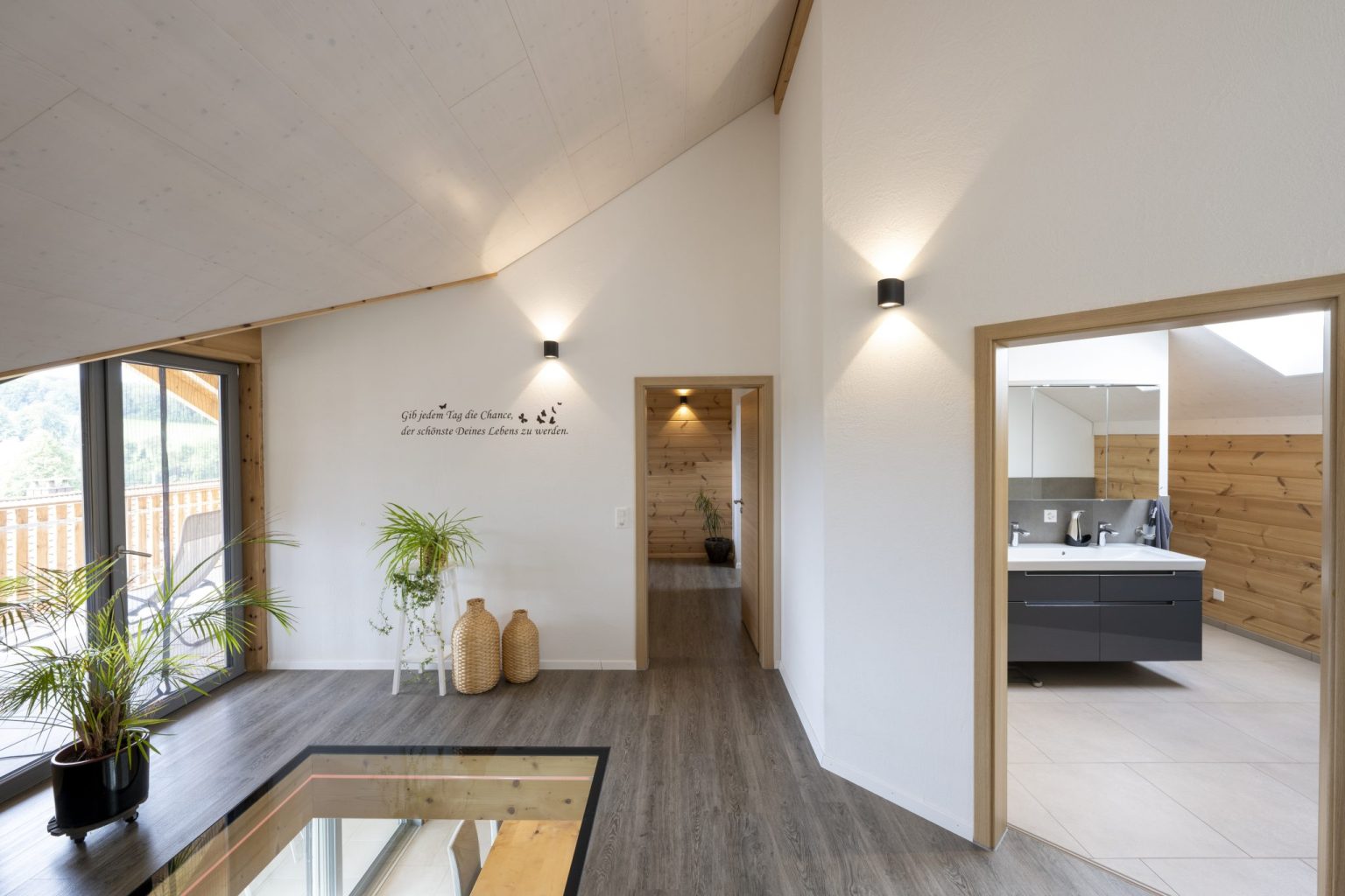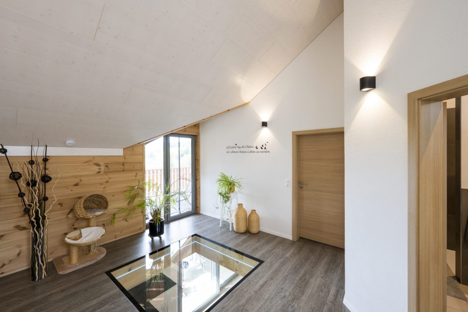Die Architektur von Holzhaus „Fricktal“ ist klassisch und geradlinig. Auf Schnörkel, Erker, Versätze, Gauben usw. hat man verzichtet, dafür aber einen dritten Giebel („Quer-Giebel“) gebaut. Die steile Hanglage erforderte ein Untergeschoss und wurde hier mittels großflächiger Betonfläche terrassenartig für Haus und Garten geebnet. Der etwas höhere Kniestock als üblich und das relativ flach geneigte Satteldach ergeben mehr Wohnfläche und Kopffreiheit im Dachgeschoss. „Wegen der vorgeschriebenen First- und Raumhöhe konnten wir im Dachgeschoss keinen offenen Sichtdachstuhl haben, deshalb haben wir die Dachschrägen mit flachen, weiß lasierten Holzplatten verkleidet. Dafür erfreuen wir uns an den offenen Balkendecken im Erdgeschoss umso mehr.“, erklärt die Hausherrin. Ungewöhnlich ist das verglaste, rechteckige Blickloch im geräumigen Gang des Dachgeschosses. Einen offenen Luftraum wollten die Hauseigentümer nicht haben, wohl aber mehr natürliches Licht im Erdgeschoss. So kamen sie auf die Idee, stattdessen einen Glasboden zwischen den Geschossen einzubauen. „Da unser Haus ja direkt ans Nachbarhaus anschließt, fehlen uns dort an der Wand Fenster. Durch die verglaste Decke gelangt vom Dachgeschoss Licht ins Erdgeschoss.“, so der Hausherr. Darüber zu laufen, ist für manch einen gewöhnungsbedürftig, aber oben halten sich ja sowieso nur die Hausbewohner auf und die haben sich daran gewöhnt. Ansonsten ist der Grundriss und das Konzept schnell beschrieben: Im Erdgeschoss teilen sich Wohnzimmer, Esszimmer, Küche und Arbeitszimmer einen offenen Bereich. Der Küche angeschlossen ist eine abgetrennte Speisekammer und ein Gäste-WC ist selbstverständlich ebenfalls in einem separaten Räumchen untergebracht. Der Zugang zum Erdgeschoss erfolgt vom Untergeschoss über eine gemauerte Treppe. So gelangt man stets trockenen Fußes vom Auto (Garage und Carport) ins Haus und umgekehrt. Vom offenen Wohnbereich des Erdgeschosses führt die Betontreppe weiter hinauf ins Dachgeschoss, wo sich zwei Kinderzimmer, ein Schlafzimmer und ein großes Familienbad um den großflächigen Gang reihen. Dem Schlafzimmer angeschlossen ist außerdem ein Ankleidezimmer und ein großer, überdachter Balkon am dritten Giebel lädt zum Verweilen und zum Aussicht genießen ein.