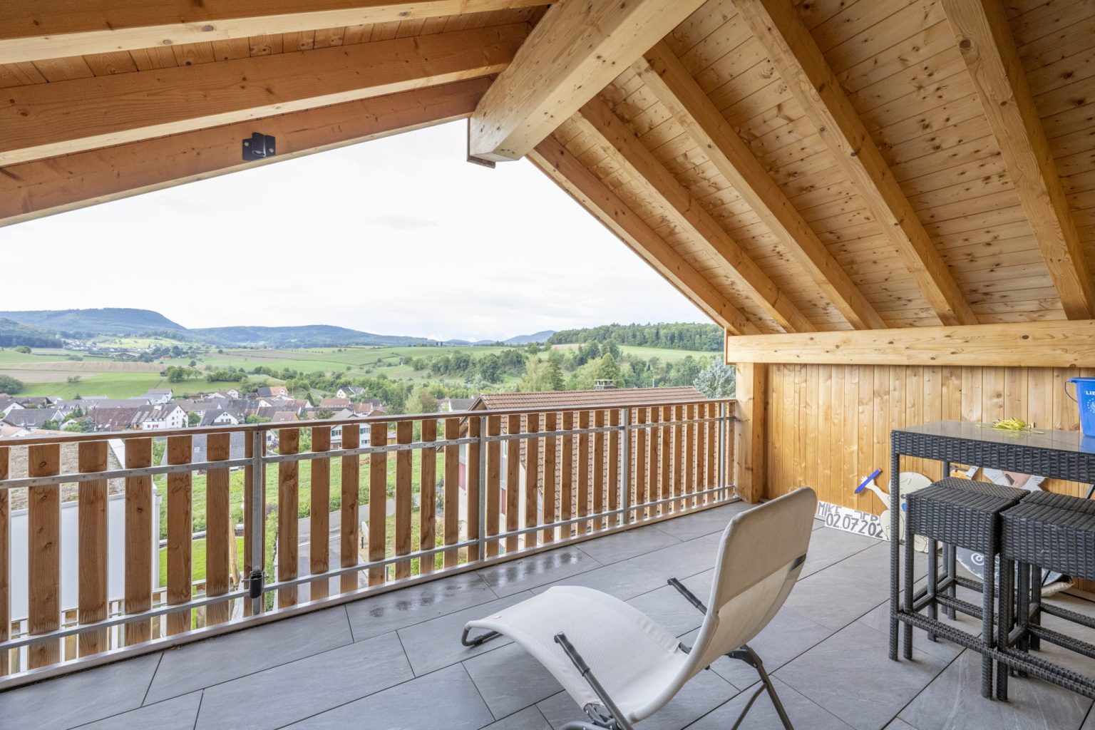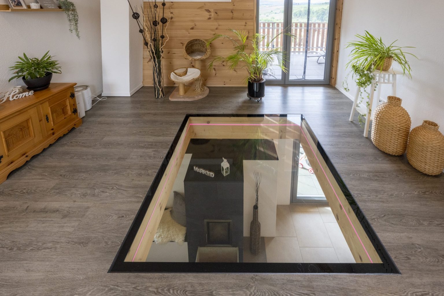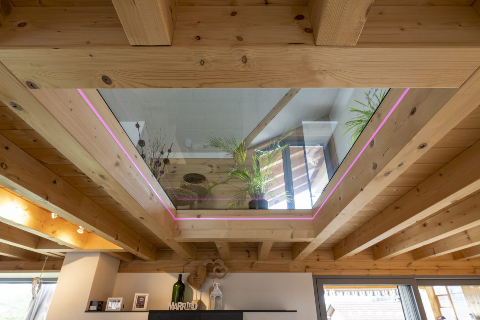 Die Architektur von Holzhaus „Fricktal“ ist klassisch und geradlinig. Auf Schnörkel, Erker, Versätze, Gauben usw. hat man verzichtet, dafür aber einen dritten Giebel („Quer-Giebel“) gebaut. Die steile Hanglage erforderte ein Untergeschoss und wurde hier mittels großflächiger Betonfläche terrassenartig für Haus und Garten geebnet. Der etwas höhere Kniestock als üblich und das relativ flach geneigte Satteldach ergeben mehr Wohnfläche und Kopffreiheit im Dachgeschoss. „Wegen der vorgeschriebenen First- und Raumhöhe konnten wir im Dachgeschoss keinen offenen Sichtdachstuhl haben, deshalb haben wir die Dachschrägen mit flachen, weiß lasierten Holzplatten verkleidet. Dafür erfreuen wir uns an den offenen Balkendecken im Erdgeschoss umso mehr.“, erklärt die Hausherrin. Ungewöhnlich ist das verglaste, rechteckige Blickloch im geräumigen Gang des Dachgeschosses. Einen offenen Luftraum wollten die Hauseigentümer nicht haben, wohl aber mehr natürliches Licht im Erdgeschoss. So kamen sie auf die Idee, stattdessen einen Glasboden zwischen den Geschossen einzubauen. „Da unser Haus ja direkt ans Nachbarhaus anschließt, fehlen uns dort an der Wand Fenster. Durch die verglaste Decke gelangt vom Dachgeschoss Licht ins Erdgeschoss.“, so der Hausherr. Darüber zu laufen, ist für manch einen gewöhnungsbedürftig, aber oben halten sich ja sowieso nur die Hausbewohner auf und die haben sich daran gewöhnt. Ansonsten ist der Grundriss und das Konzept schnell beschrieben: Im Erdgeschoss teilen sich Wohnzimmer, Esszimmer, Küche und Arbeitszimmer einen offenen Bereich. Der Küche angeschlossen ist eine abgetrennte Speisekammer und ein Gäste-WC ist selbstverständlich ebenfalls in einem separaten Räumchen untergebracht. Der Zugang zum Erdgeschoss erfolgt vom Untergeschoss über eine gemauerte Treppe. So gelangt man stets trockenen Fußes vom Auto (Garage und Carport) ins Haus und umgekehrt. Vom offenen Wohnbereich des Erdgeschosses führt die Betontreppe weiter hinauf ins Dachgeschoss, wo sich zwei Kinderzimmer, ein Schlafzimmer und ein großes Familienbad um den großflächigen Gang reihen. Dem Schlafzimmer angeschlossen ist außerdem ein Ankleidezimmer und ein großer, überdachter Balkon am dritten Giebel lädt zum Verweilen und zum Aussicht genießen ein.
