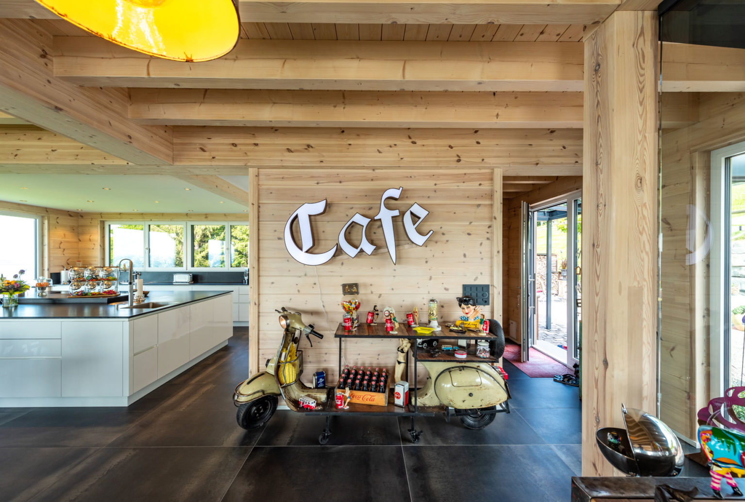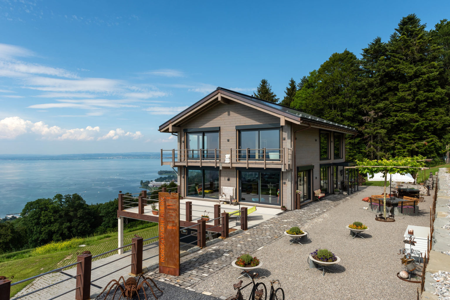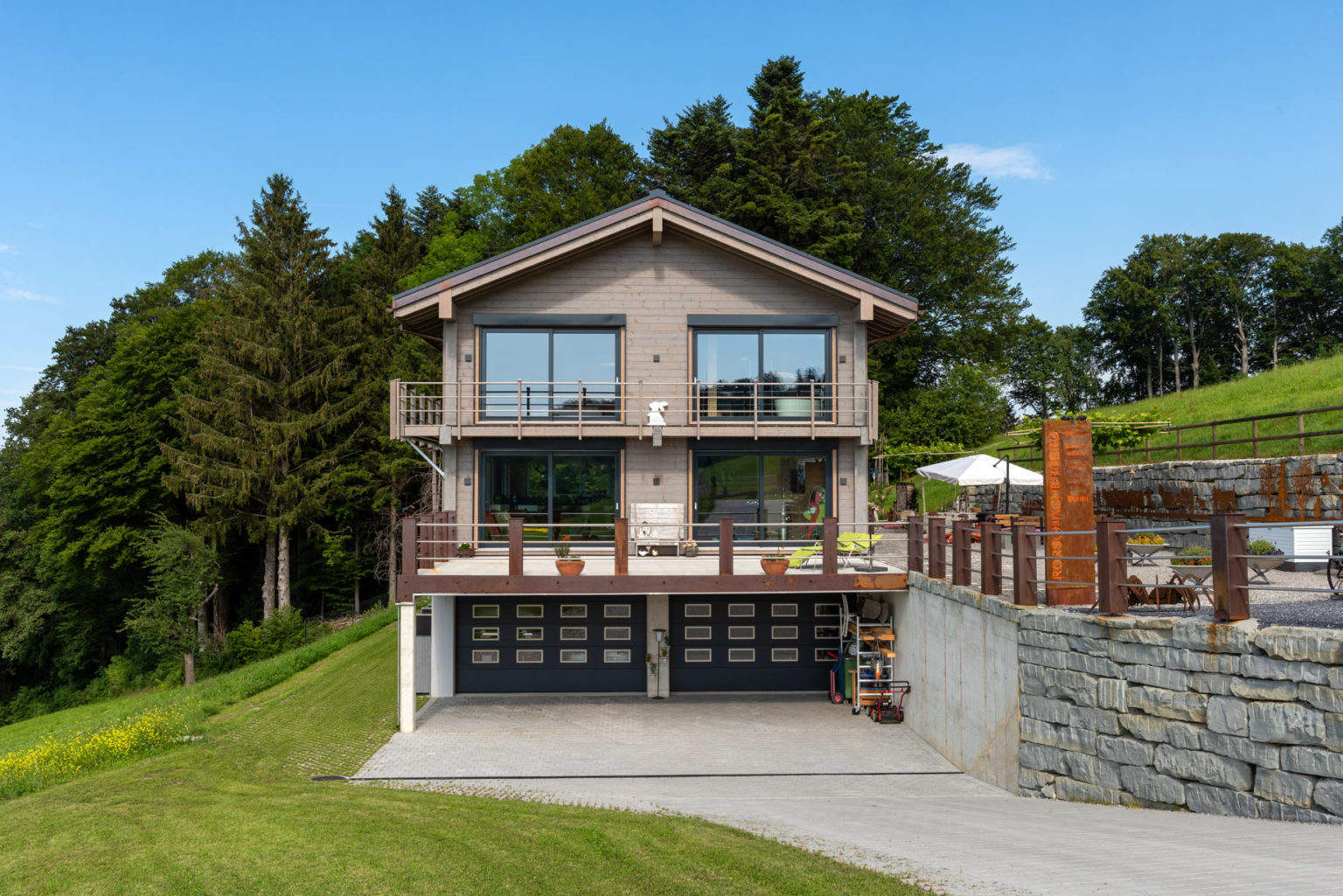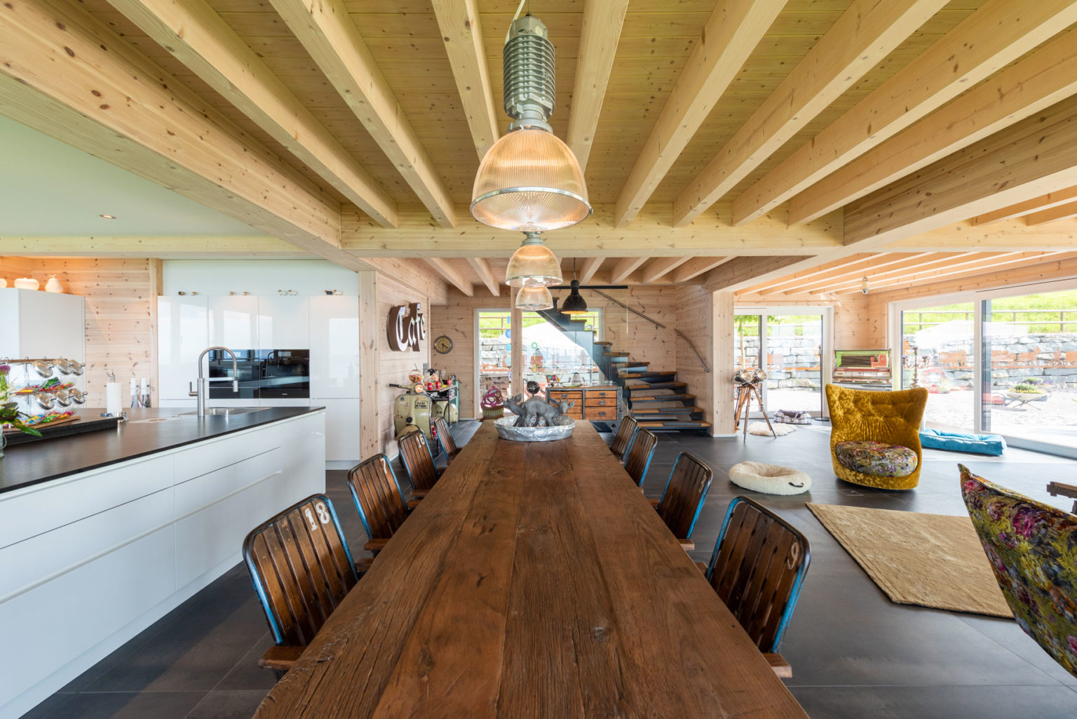 Holzhaus „Gallus‘ Traum“ vereint vieles, scheinbar Gegensätzliches miteinander: Einen konservativen, jahrhundertelang bewährten Baustoff mit modernster Haustechnik und nachhaltiger, ökologischer Blockhaus-Bauweise; eine klassische Architektur mit modernen Gestaltungsdetails und Natürlichkeit; Bodenständigkeit mit freiem Geist; warme Behaglichkeit mit lichtdurchfluteter Transparenz; die moderne, urbane Schweiz mit ihren ursprünglichen, landwirtschaftlichen und industriellen Traditionen bis hin zu zukunftsweisenden Technologien. „Natürlich verfügt mein Holzhaus über jeglichen modernen Komfort, der den Wohnalltag erleichtert und versüßt, aber auf digitale Elemente, beispielsweise bei der Haussteuerung, und „Schnickschnack“ habe ich bewusst verzichtet. Die Reduzierung aufs Wesentliche und gemeinsam verbrachte Zeit mit Familie und Freunden – das ist für mich Luxus!“, offenbart er. Sein persönliches Gespür für Ästhetik und die eigene persönliche Handschrift machen aus der Massivholzvilla ein außergewöhnliches Unikat auf hohem Niveau.