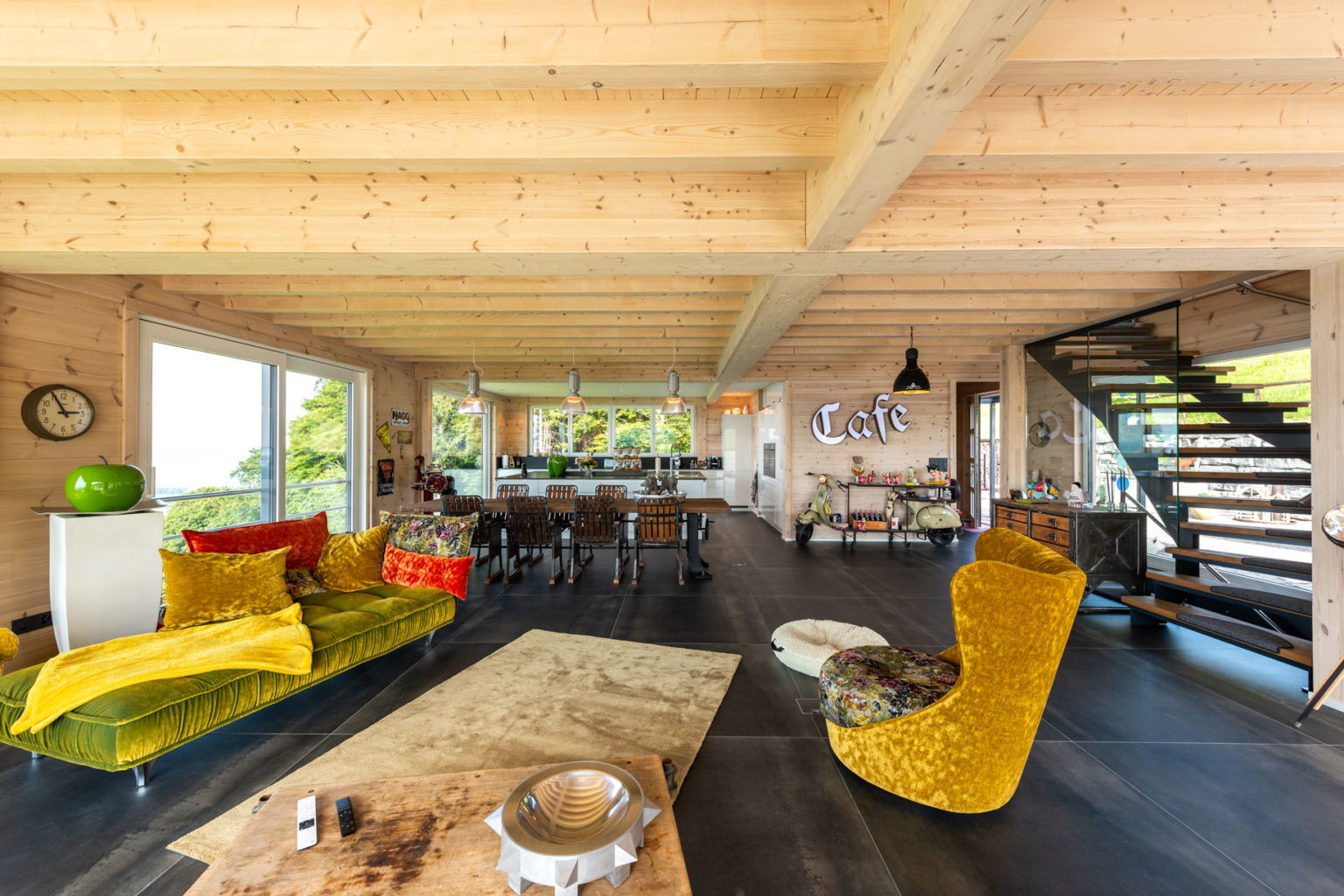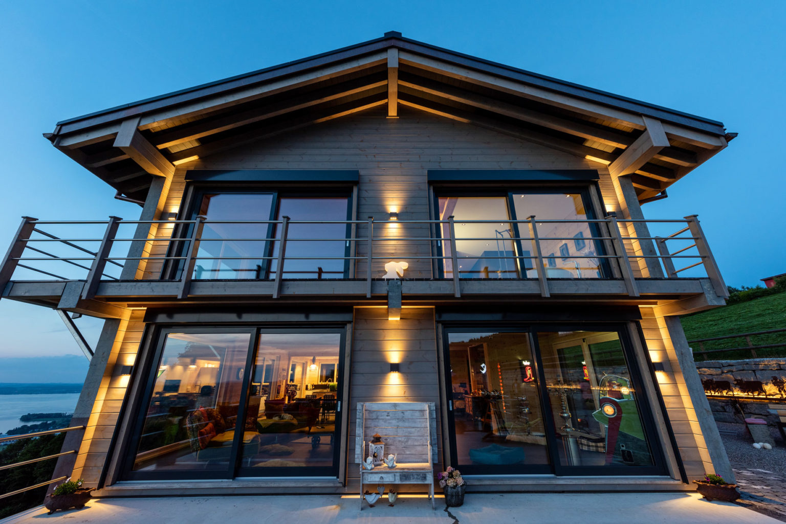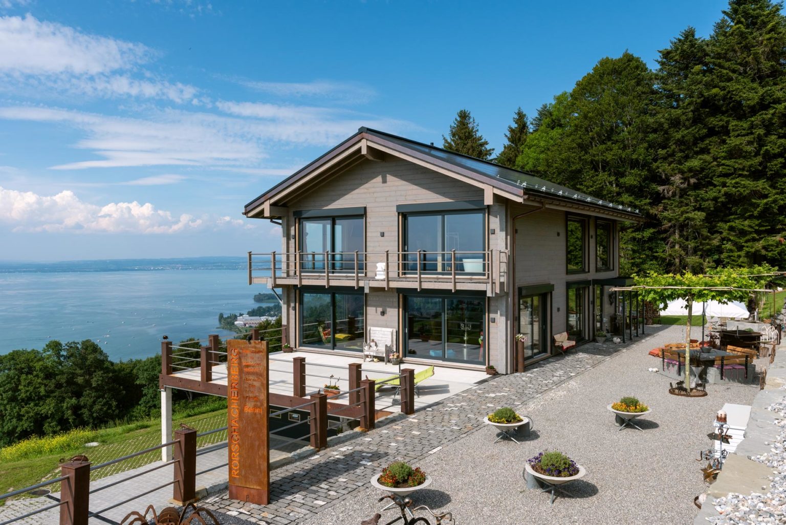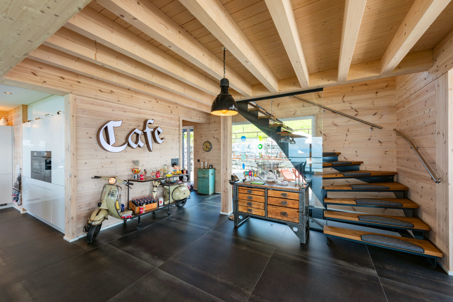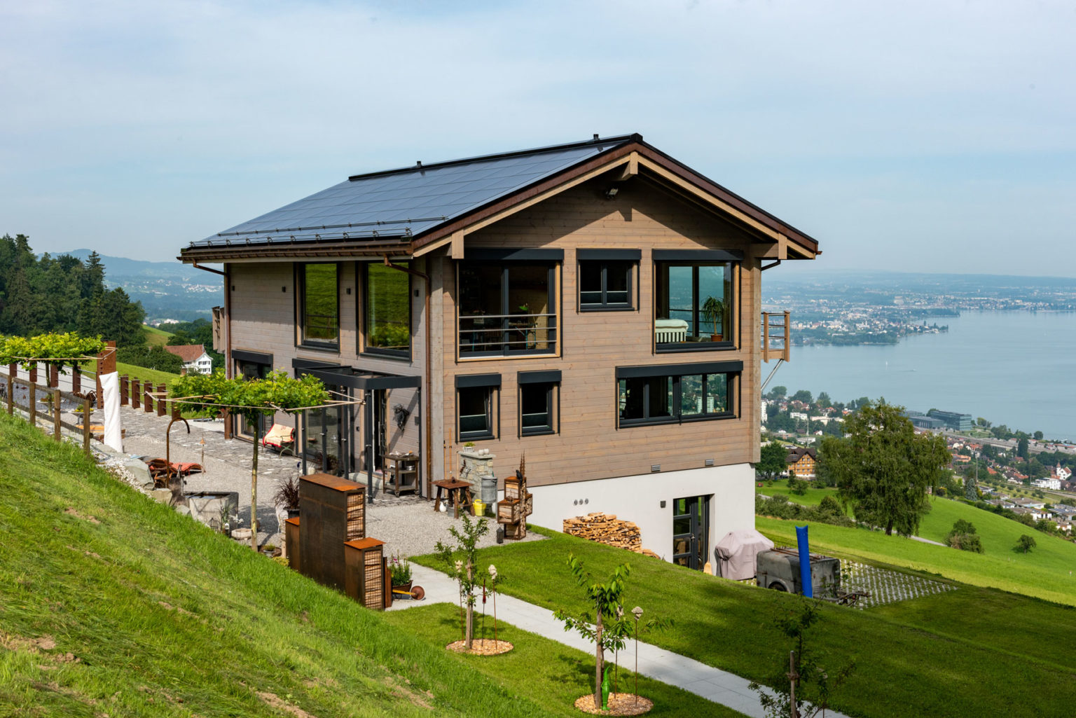 Holzhaus „Gallus‘ Traum“ vereint vieles, scheinbar Gegensätzliches miteinander: Einen konservativen, jahrhundertelang bewährten Baustoff mit modernster Haustechnik und nachhaltiger, ökologischer Blockhaus-Bauweise; eine klassische Architektur mit modernen Gestaltungsdetails und Natürlichkeit; Bodenständigkeit mit freiem Geist; warme Behaglichkeit mit lichtdurchfluteter Transparenz; die moderne, urbane Schweiz mit ihren ursprünglichen, landwirtschaftlichen und industriellen Traditionen bis hin zu zukunftsweisenden Technologien. „Natürlich verfügt mein Holzhaus über jeglichen modernen Komfort, der den Wohnalltag erleichtert und versüßt, aber auf digitale Elemente, beispielsweise bei der Haussteuerung, und „Schnickschnack“ habe ich bewusst verzichtet. Die Reduzierung aufs Wesentliche und gemeinsam verbrachte Zeit mit Familie und Freunden – das ist für mich Luxus!“, offenbart er. Sein persönliches Gespür für Ästhetik und die eigene persönliche Handschrift machen aus der Massivholzvilla ein außergewöhnliches Unikat auf hohem Niveau.