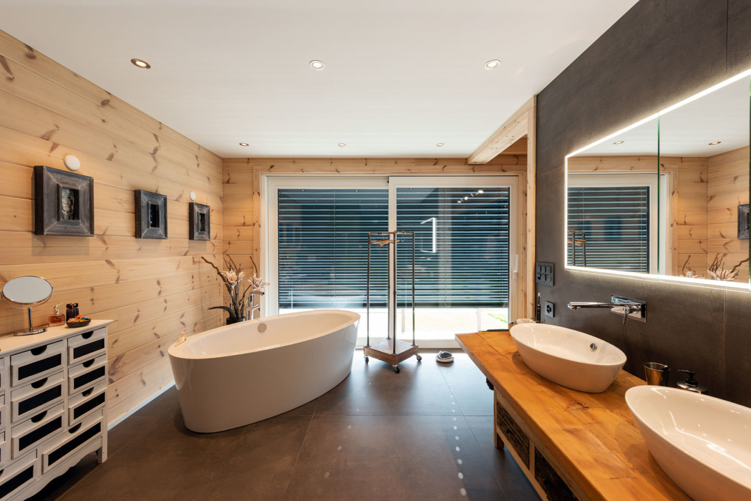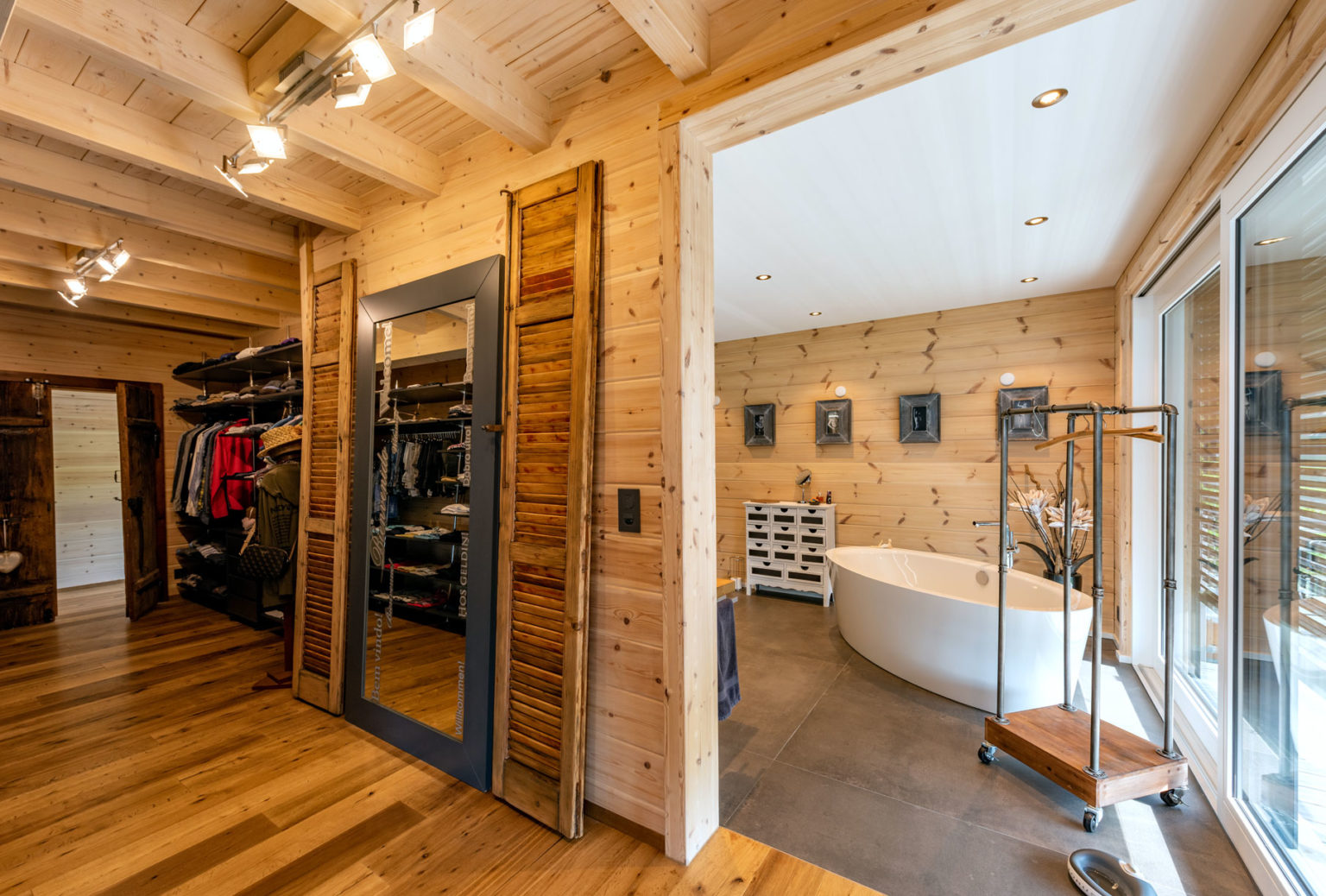 Für seine Massivholzvilla „Gallus‘ Traum“ suchte sich der Perfektionist und Schöngeist den erfahrenen Holzhaushersteller Fullwood aus, der seit über vier Jahrzehnten qualitätsgeprüfte und -besiegelte Holzhäuser für anspruchsvolle Kunden baut. „Die Blockwände von Fullwood werden elementweise im Werk vorgefertigt und dann termin- und passgenau auf die Bodenplatte montiert. Das klappt perfekt und geht schnell.“, beschreibt der Holzhauseigentümer. Durch die moderne Fertigungsweise des Holzhausspezialisten sind die Wände nicht nur absolut winddicht, sondern sogar setzungsfrei, das heißt, es ist keine Nachsorge am fertigen Objekt notwendig, wie das beispielsweise bei Rundstammhäusern der Fall ist. Die glatten, schlichten Blockwände sind, im Fall von Holzhaus „Gallus‘ Traum“, stolze 27cm dick und bestehen aus nordischem Kiefernholz, das durch sein langsames Wachstum besonders robust und langlebig ist. „Die massiven Holzwände von Fullwood dämmen wunderbar, ganz ohne zusätzliche Dämmung, die das Raumklima ungünstig beeinflussen könnte!“, betont der Hausherr.