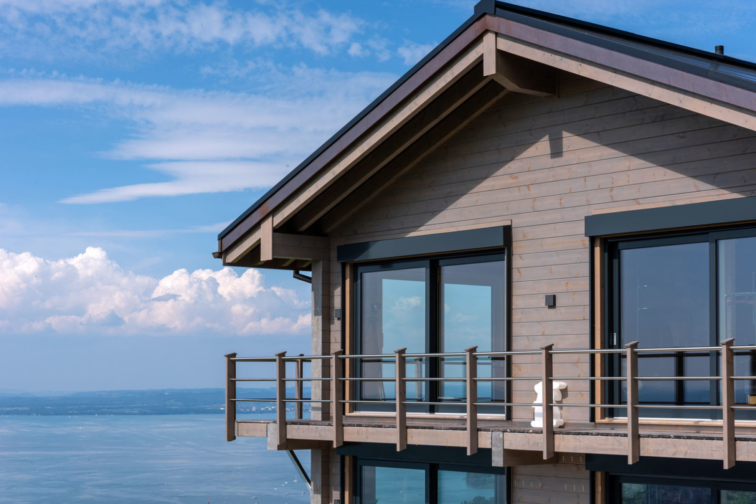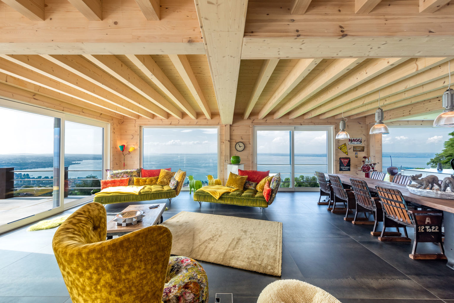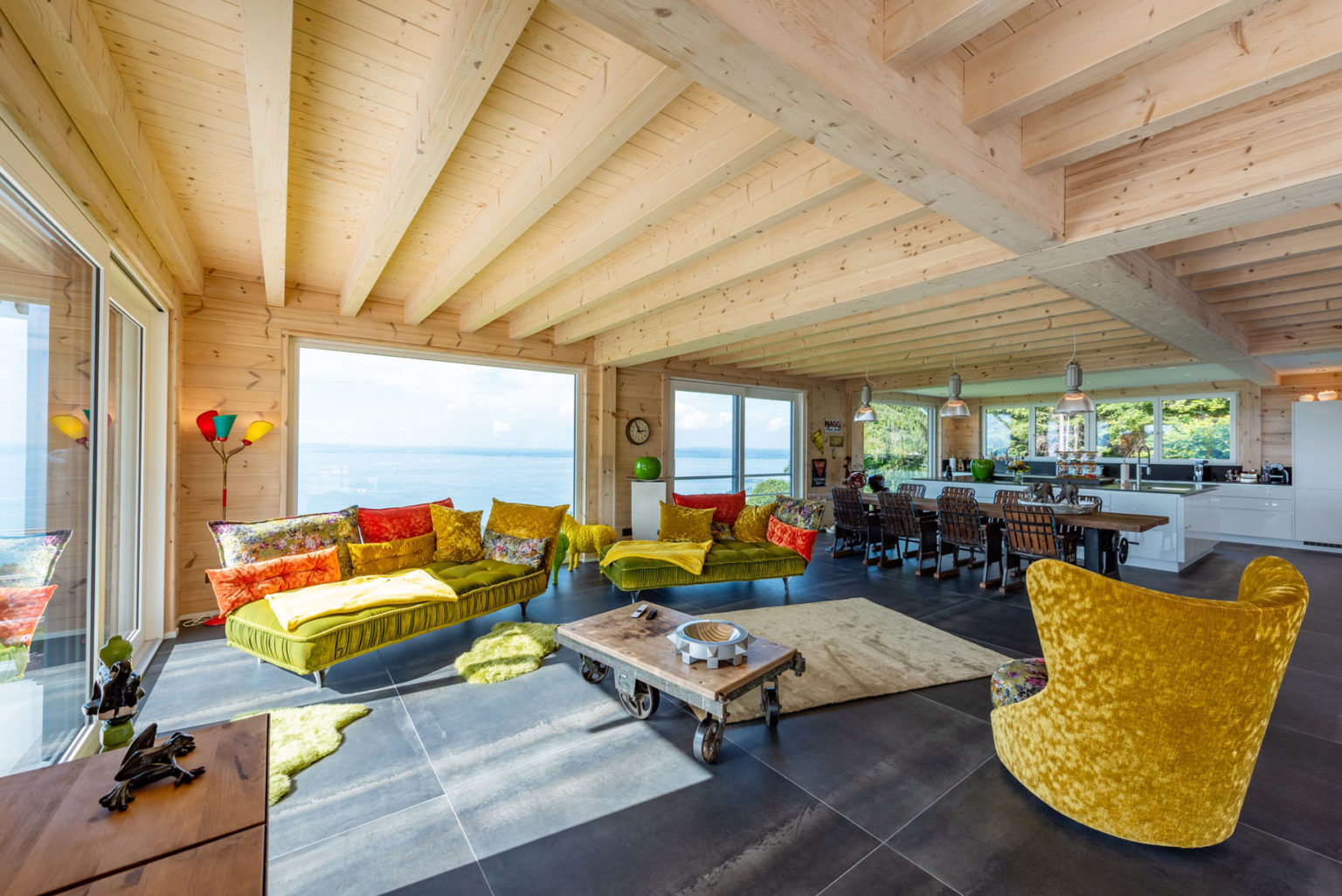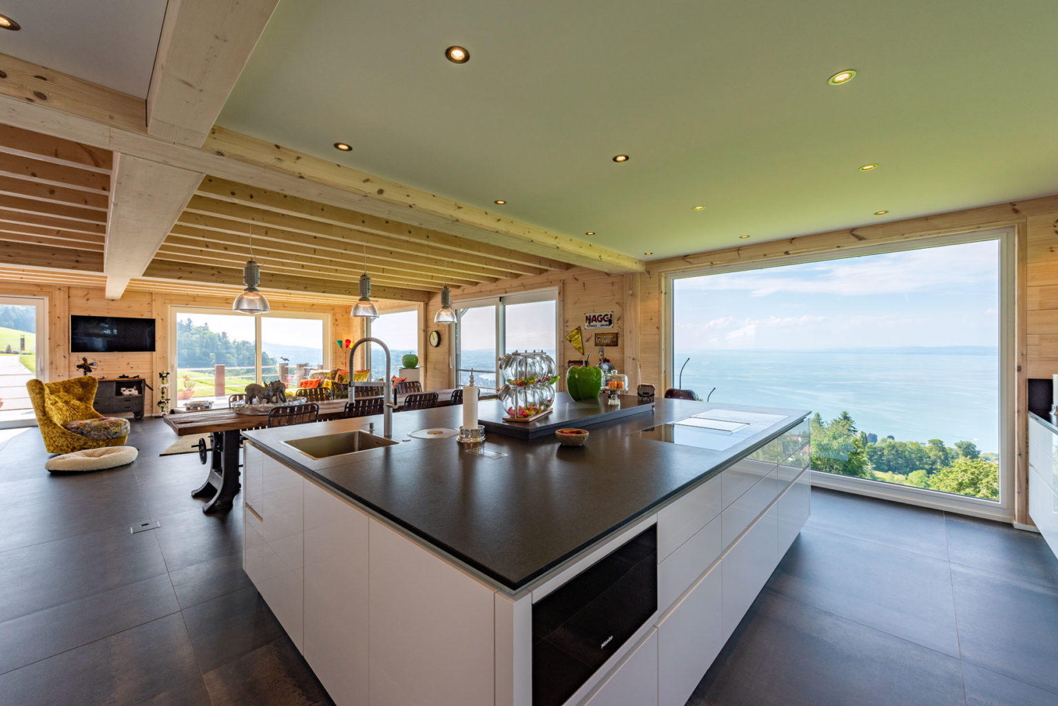 Neben der heimeligen Atmosphäre, die durch den Baustoff Holz erreicht wird, besticht Holzhaus „Gallus‘ Traum“ mit großen, offenen Flächen, die von reichlich einfallendem, natürlichem Licht geflutet werden. „Ein Haus in dieser Lage verlangt natürlich nach großen Fensterflächen um den überwältigenden Ausblick würdigen und ins Haus hinein holen zu können!“, erklärt der Hausplaner. Somit lassen die überdimensionalen Glasflächen nicht nur viel Tageslicht ins Holzhaus, sondern holen den Bodensee und den weiten Himmel darüber gewissermaßen ins Haus hinein. „Der Ausblick allein ist wie ein Kunstwerk, das je nach Lichtverhältnissen und Wetter wechselt und sich stetig wandelt.“, schwärmt er. Bis auf die 120x120cm großen, anthraziten Bodenfliesen aus pulverisiertem Stein (mit flachen Fugen) und die ebenfalls anthrazitfarbene Arbeitsplatte der riesigen Kochinsel, ist das Hausinnere hell gehalten: Die naturhellen Kiefernwände und offenen Balkendecken sind mit einem UV-Schutz gegen Nachdunkeln behandelt, der zusätzlich dank 2% weißer Pigmente einen Tick aufhellt; die Fensterrahmen (innen aus Holz) und vereinzelte Trennwände (aus leichtem Ständerbau) sind weiß gestrichen; die Küchenmöbel glänzen in weiß, und in manchen Bereichen sorgen schlichte, glatte Decken in weiß für ein ausgewogenes Maß an schwereloser Sachlichkeit.
