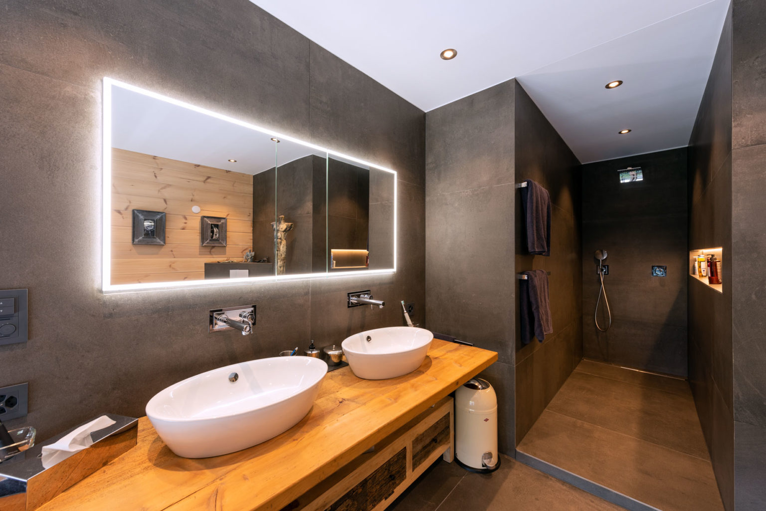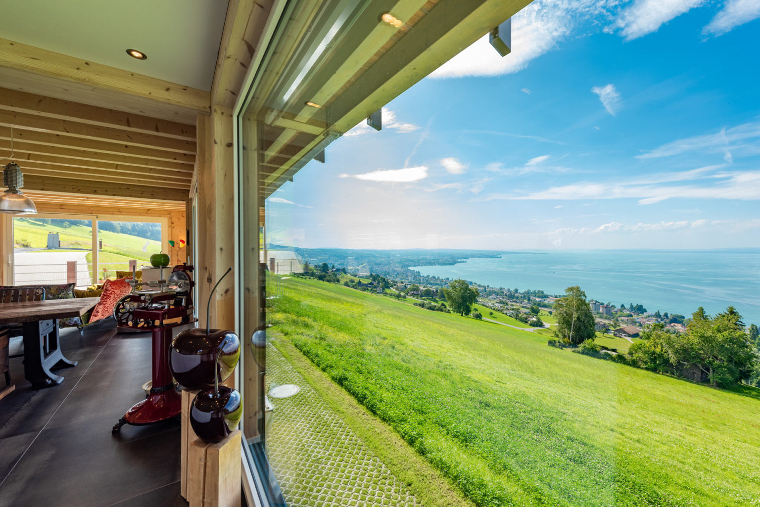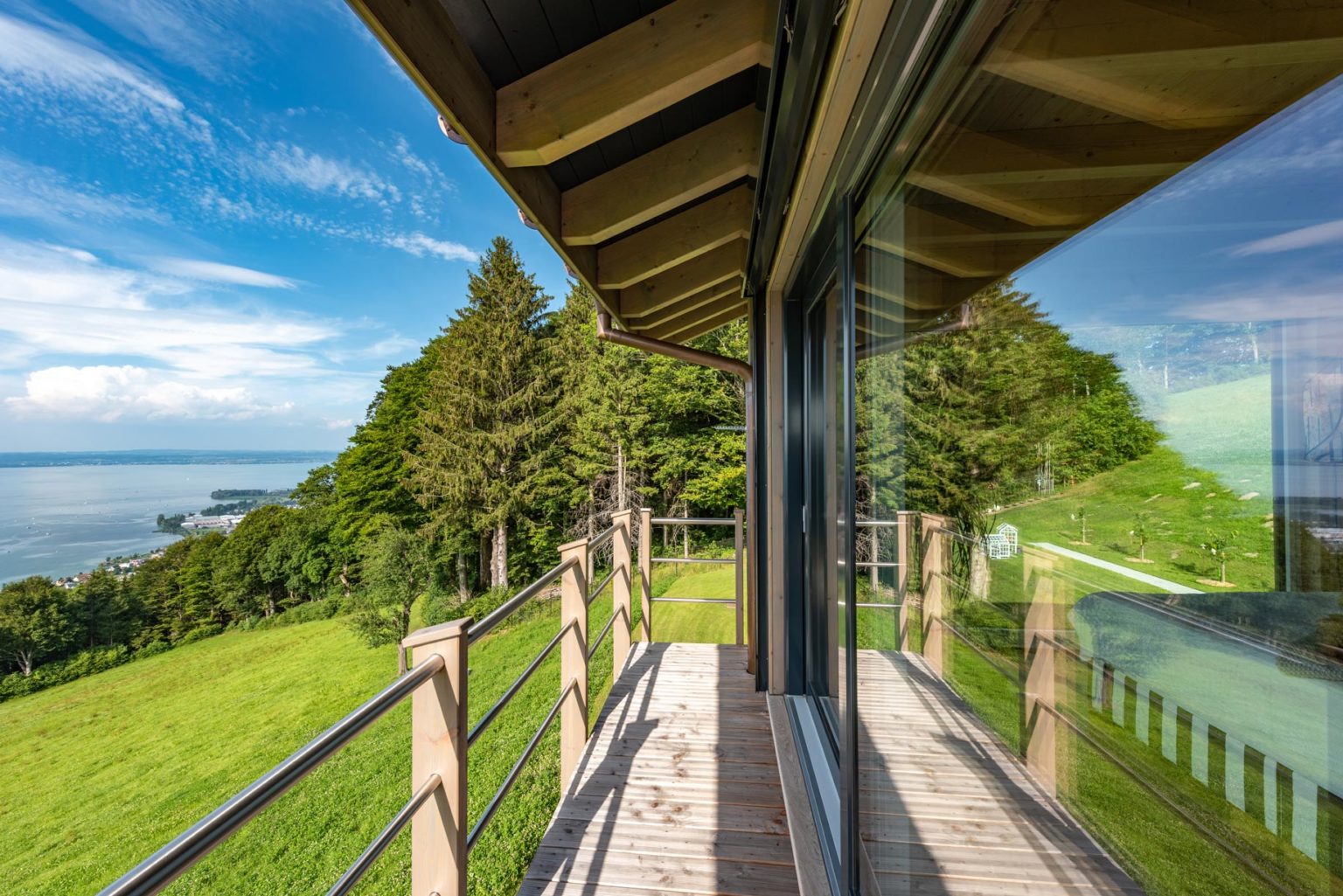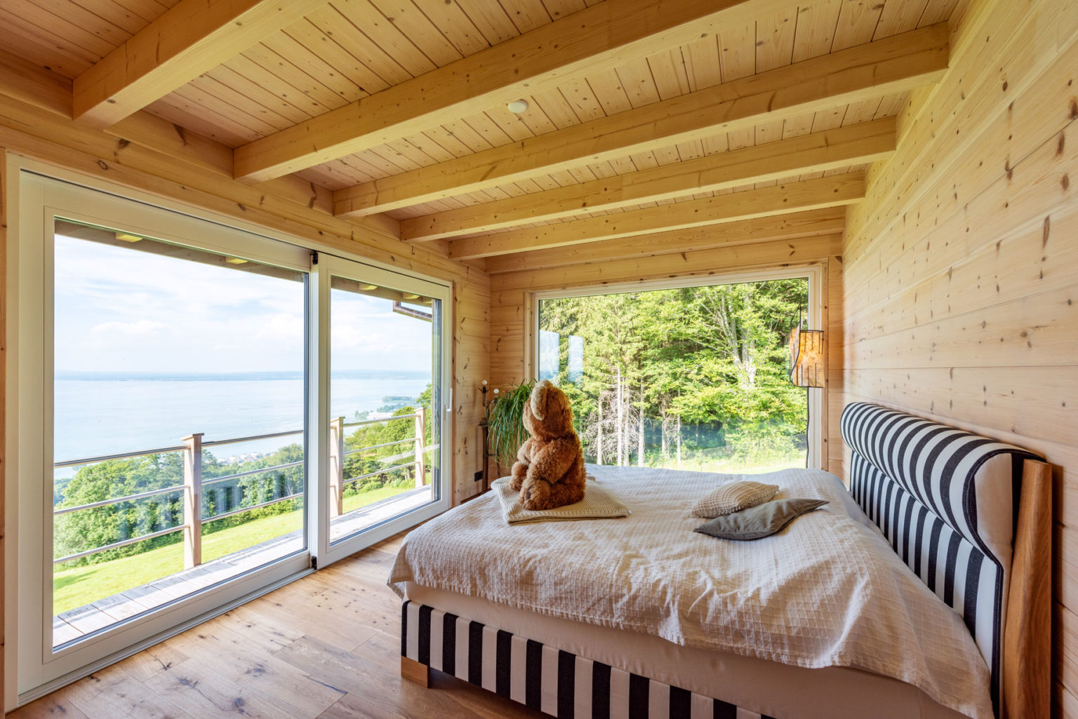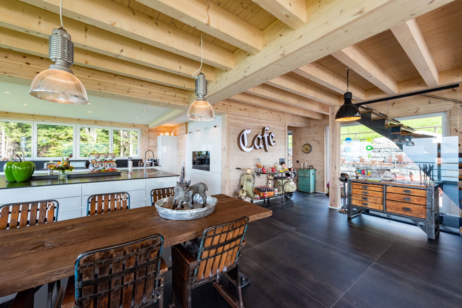 Neben der heimeligen Atmosphäre, die durch den Baustoff Holz erreicht wird, besticht Holzhaus „Gallus‘ Traum“ mit großen, offenen Flächen, die von reichlich einfallendem, natürlichem Licht geflutet werden. „Ein Haus in dieser Lage verlangt natürlich nach großen Fensterflächen um den überwältigenden Ausblick würdigen und ins Haus hinein holen zu können!“, erklärt der Hausplaner. Somit lassen die überdimensionalen Glasflächen nicht nur viel Tageslicht ins Holzhaus, sondern holen den Bodensee und den weiten Himmel darüber gewissermaßen ins Haus hinein. „Der Ausblick allein ist wie ein Kunstwerk, das je nach Lichtverhältnissen und Wetter wechselt und sich stetig wandelt.“, schwärmt er. Bis auf die 120x120cm großen, anthraziten Bodenfliesen aus pulverisiertem Stein (mit flachen Fugen) und die ebenfalls anthrazitfarbene Arbeitsplatte der riesigen Kochinsel, ist das Hausinnere hell gehalten: Die naturhellen Kiefernwände und offenen Balkendecken sind mit einem UV-Schutz gegen Nachdunkeln behandelt, der zusätzlich dank 2% weißer Pigmente einen Tick aufhellt; die Fensterrahmen (innen aus Holz) und vereinzelte Trennwände (aus leichtem Ständerbau) sind weiß gestrichen; die Küchenmöbel glänzen in weiß, und in manchen Bereichen sorgen schlichte, glatte Decken in weiß für ein ausgewogenes Maß an schwereloser Sachlichkeit.