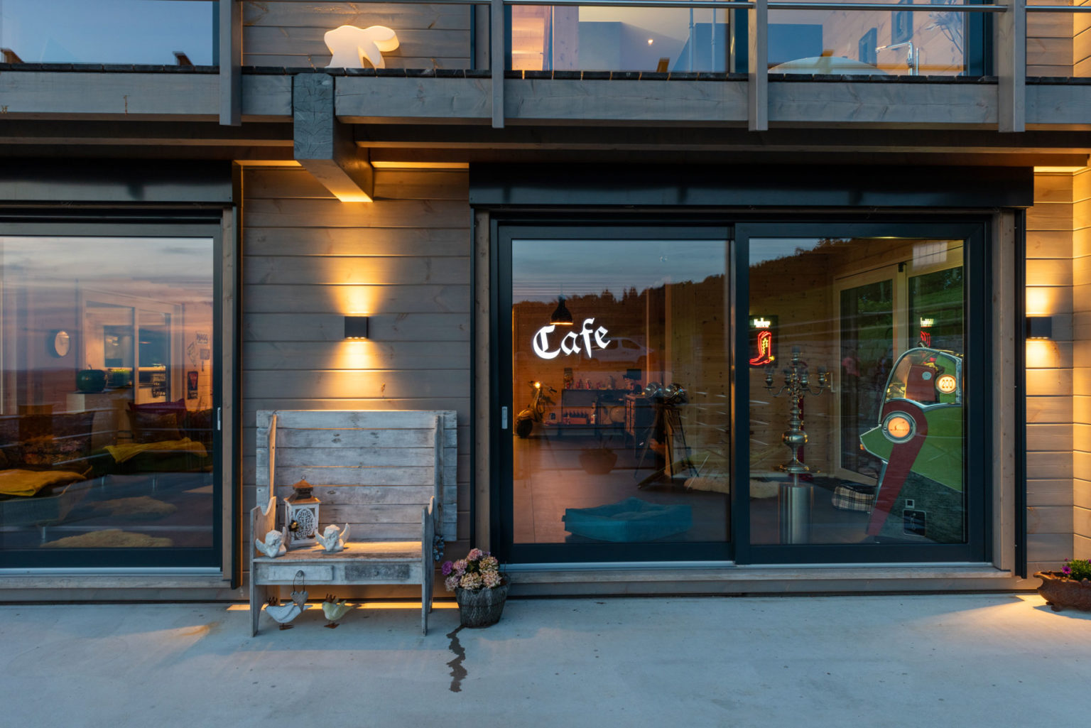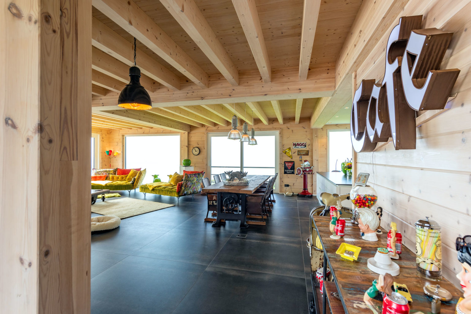 Holzhaus „Gallus‘ Traum“ besitzt eine geradlinige, kantige Formensprache ohne jegliche Schnörkel. Auf dem imposanten, grau lasierten Kubus ruht ein anthrazit eingedecktes Satteldach mit flacher Neigung und relativ kleinem Dachüberstand. Die Fensterrahmen (außen aus Aluminium, innen aus Holz!) und Jalousien sind farblich identisch mit der Dacheindeckung und werden von einer Balkonbrüstung, bestehend aus Edelstahlrohren und Holz, ergänzt. Kupferrohre und -blenden am Giebel korrespondieren farblich mit den absichtlich eingerosteten Metallpfosten der Terrassenumfriedung und dem über mannshohen Hausschild aus verrostetem Metall. Riesige, bodentiefe Glasflächen unterteilen die Massivholzfassade symmetrisch, nehmen dem kompakten Baukörper die Schwere und lassen das Gebäude transparent wirken. Holz und Glas halten sich die Waage und somit auch Leichtigkeit und Bodenständigkeit. Im Hausinnern setzt sich eine gewagte aber gelungene Kombination aus schlichten Naturmaterialien, Hochglanzoptik, historischem Industriedesign, Popart, Folklore und Plüsch durch, welche die Vielseitigkeit des Hausherrn spiegelt. Hier harmonieren Elemente der Fifties mit einer „living-kitchen“ des 21. Jahrhunderts, und die gesamte Einrichtung sorgt für geschmackvolle Kurzweil in immens großzügigen Räumen.