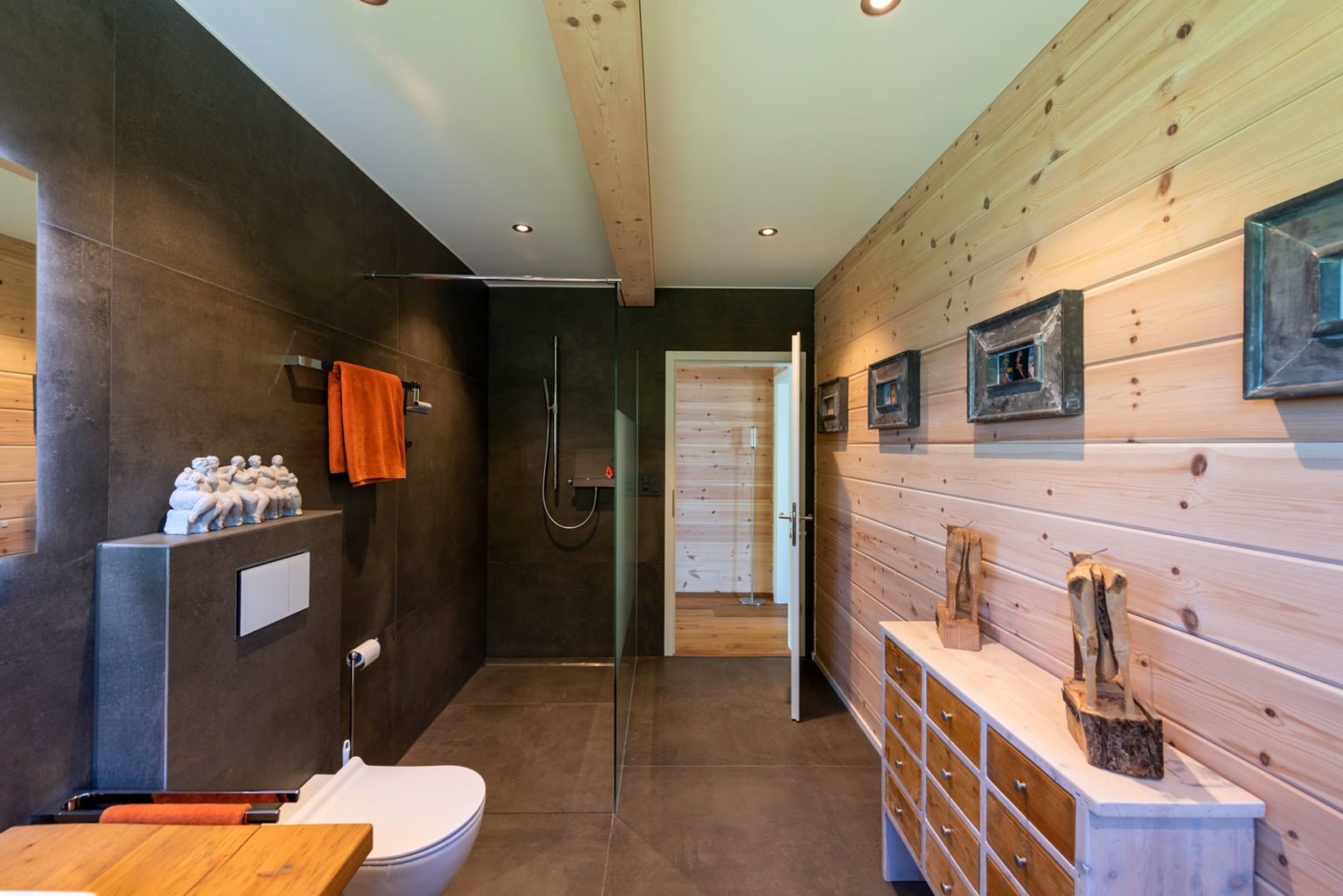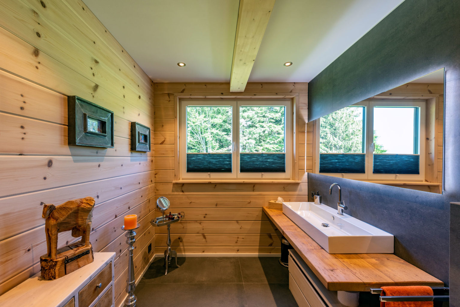 „Ich bin total unabhängig von schwankenden Energiekosten und habe keinerlei Nebenkosten, bin also „Selbstversorger“, freut sich der Hauseigner. Wie das sein kann? „Das gesamte Dach meines Hauses ist mit Photovoltaik ausgerüstet und produziert 28 kW Strom, das sind mindestens 18 kW mehr als ich für den Betrieb benötige. Mit dem Überschuss finanziere ich z. B. Ab/Wasser und sämtliche anfallende Gebühren.“ Außerdem nutzt er Geothermie, die mittels Erdsonde (Tiefenbohrung) für die Fußbodenheizung zur Verfügung steht. Eine 20.000 Liter fassende Regenwasserzisterne zur Gartenbewässerung und eine eigene Quelle besitzt das weitläufige Hanggrundstück auch noch. „Die massiven Kiefernwände halten die Wärme im Winter gut drinnen und im Sommer blocken sie die Hitze ab. Durch die Aufdachdämmung tritt ebenfalls keine Heizungsluft aus oder Sommerhitze ein, und selbstverständlich besitzen die vielen großflächigen Fenster Wärmeschutzglas.“, erklärt der Hausherr. Während die tiefstehende Sonne im Winter willkommen ist um Sonnenwärme ins Holzhaus zu bringen, schützen moderne Außenjalousien im Sommer vor Überhitzung und zu viel Sonneneinstrahlung. Zudem isolieren sie bei Bedarf zusätzlich und sind vor allem Sichtschutz. Praktischen Schutz bietet auch der dekorative, gläserne Windfang vor dem Hauseingang. „Da ich bewusst keine automatische Be- und Entlüftungsanlage installieren wollte, besitzt mein Haus keinen Minergie-Status, obwohl es ja nachweislich extrem energieeffizient und sogar klimafreundlich sowie nachhaltig ist.“, bemerkt er.
