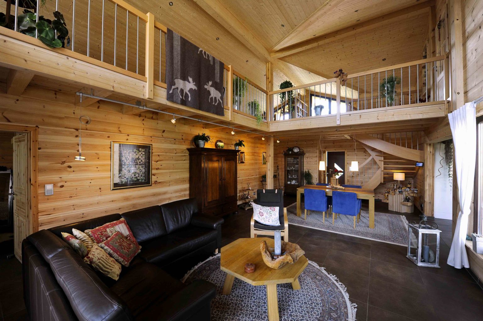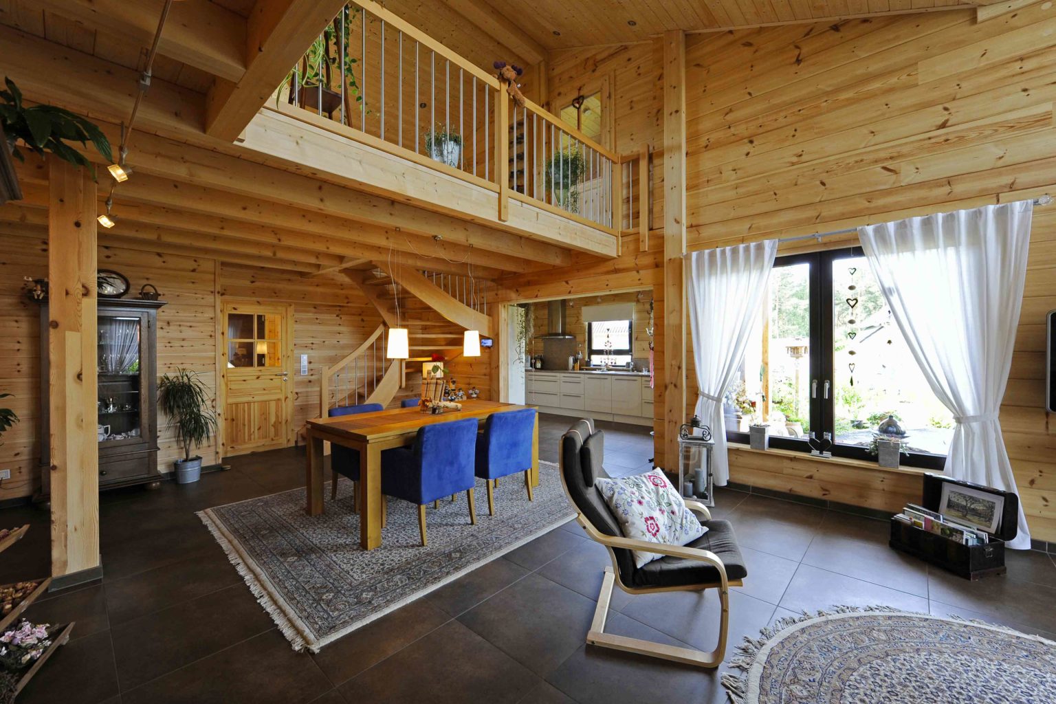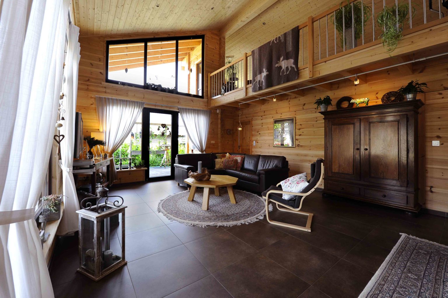 Harmonisch und dennoch kurzweilig hebt sich das dunkle Braun der Fensterrahmen und Haustüre von der massiven Naturwand ab, ganz ohne einen scharfen Kontrast zu bilden. Sachliche, klare Linien bestimmen den gut proportionierten, schnörkellosen Gesamteindruck des Holzhauses. Betritt man das massive Holzhaus, gelangt man nach wenigen Schritten durch den Windfang in den langgestreckten luftigen Wohnbereich. Die großzügigen Raummaße erstrecken sich weit hinauf bis unter das Dach. Die obere Etage eröffnet sich gut sichtbar als Galerie. Die großen, bodentiefen Fenster zum Garten erhellen den Raum ganz natürlich und werden von dem großen First-Fenster über der Sofaecke unterstützt. Auch aus der oberen Etage fällt viel Sonnenlicht hinunter. Ausschließlich massive Holzwände aus Kiefer umschließen das Ganze. Bei so viel Helligkeit und Luftigkeit im Holzhaus erdet der dunkelbraune Boden aus Feinsteinfliesen angenehm ausgleichend die Atmosphäre des Raumes. Auch in die zum Wohnraum offene Küche lacht die Sonne durch große Fenster und eine Fenstertüre herein. Ein Hauswirtschaftsraum schließt sich der Küche unauffällig an. Zwei Terrassen schmiegen sich in die äußeren Holzhaus Nischen, die in den warmen Monaten wie Zimmer bewohnt werden. Dank des ausreichenden Dachüberstandes lässt es sich dort auch bei Regen gemütlich sitzen. Ganz unauffällig schmiegt sich, unkonventionell dem Wohnraum angeschlossen, eine Kiefernholztüre an die Wand, welche zum Schlafzimmer führt. Von hier aus gelangt man in die Ankleide und das Badezimmer.