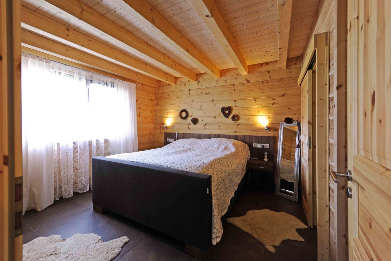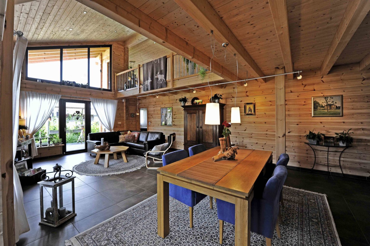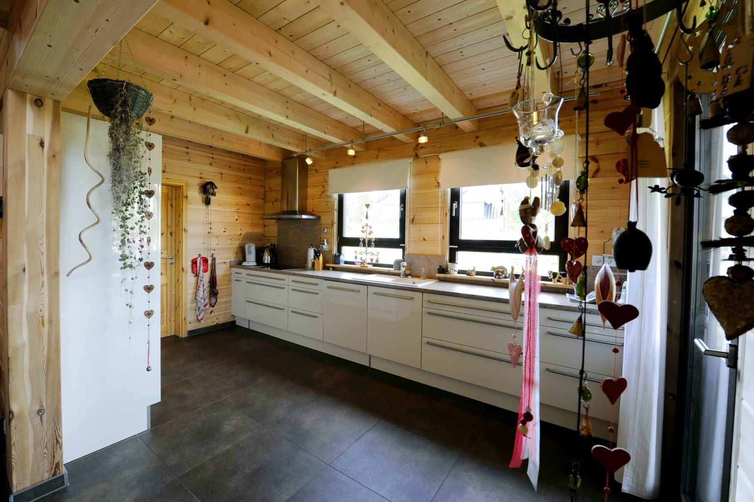 Harmonisch und dennoch kurzweilig hebt sich das dunkle Braun der Fensterrahmen und Haustüre von der massiven Naturwand ab, ganz ohne einen scharfen Kontrast zu bilden. Sachliche, klare Linien bestimmen den gut proportionierten, schnörkellosen Gesamteindruck des Holzhauses. Betritt man das massive Holzhaus, gelangt man nach wenigen Schritten durch den Windfang in den langgestreckten luftigen Wohnbereich. Die großzügigen Raummaße erstrecken sich weit hinauf bis unter das Dach. Die obere Etage eröffnet sich gut sichtbar als Galerie. Die großen, bodentiefen Fenster zum Garten erhellen den Raum ganz natürlich und werden von dem großen First-Fenster über der Sofaecke unterstützt. Auch aus der oberen Etage fällt viel Sonnenlicht hinunter. Ausschließlich massive Holzwände aus Kiefer umschließen das Ganze. Bei so viel Helligkeit und Luftigkeit im Holzhaus erdet der dunkelbraune Boden aus Feinsteinfliesen angenehm ausgleichend die Atmosphäre des Raumes. Auch in die zum Wohnraum offene Küche lacht die Sonne durch große Fenster und eine Fenstertüre herein. Ein Hauswirtschaftsraum schließt sich der Küche unauffällig an. Zwei Terrassen schmiegen sich in die äußeren Holzhaus Nischen, die in den warmen Monaten wie Zimmer bewohnt werden. Dank des ausreichenden Dachüberstandes lässt es sich dort auch bei Regen gemütlich sitzen. Ganz unauffällig schmiegt sich, unkonventionell dem Wohnraum angeschlossen, eine Kiefernholztüre an die Wand, welche zum Schlafzimmer führt. Von hier aus gelangt man in die Ankleide und das Badezimmer.