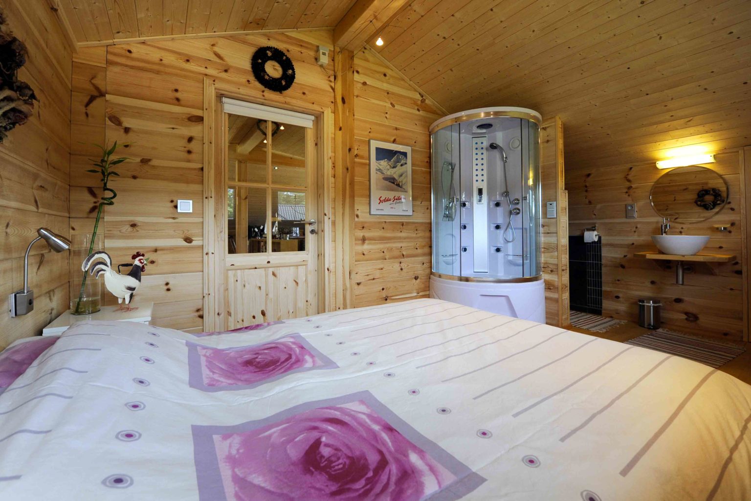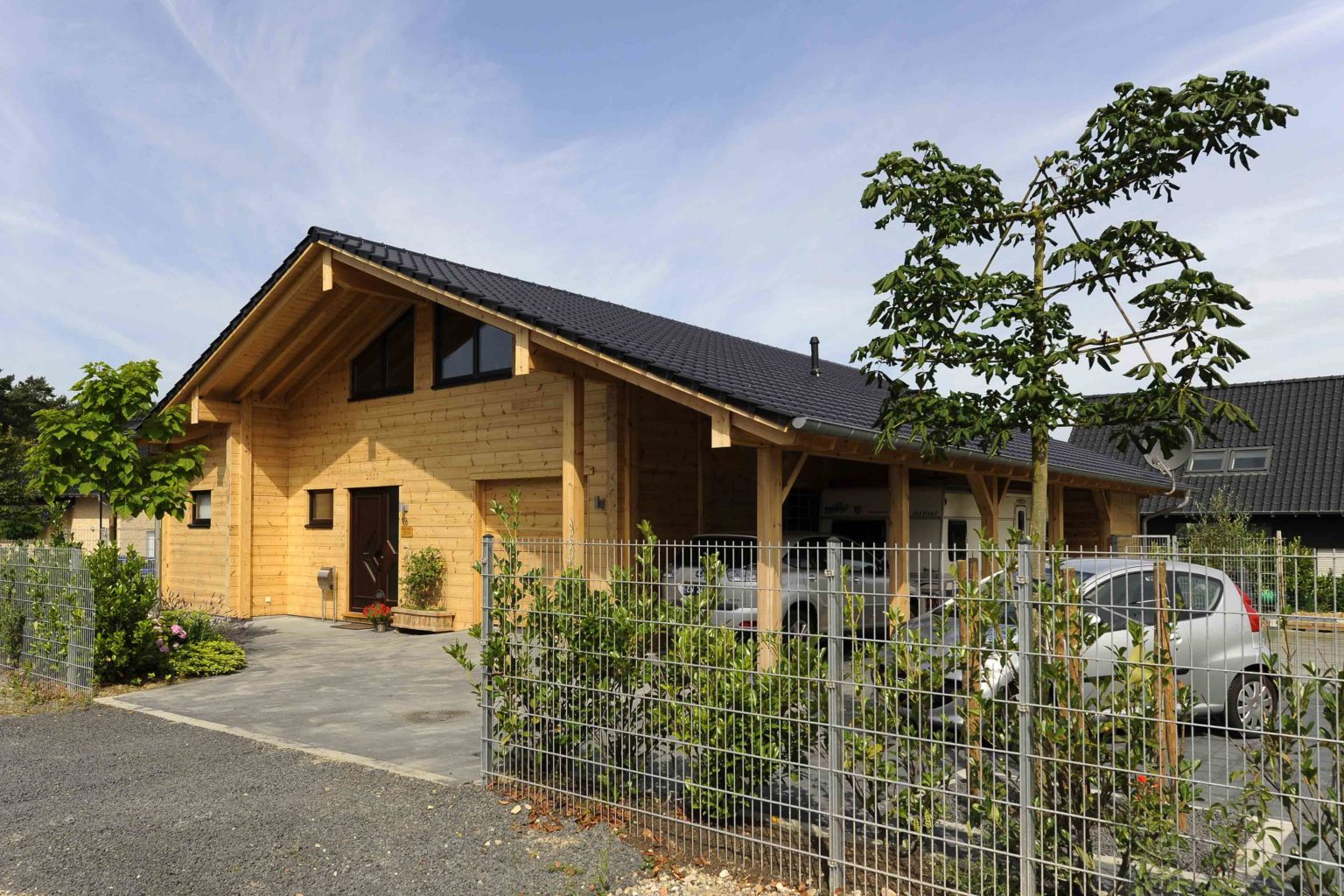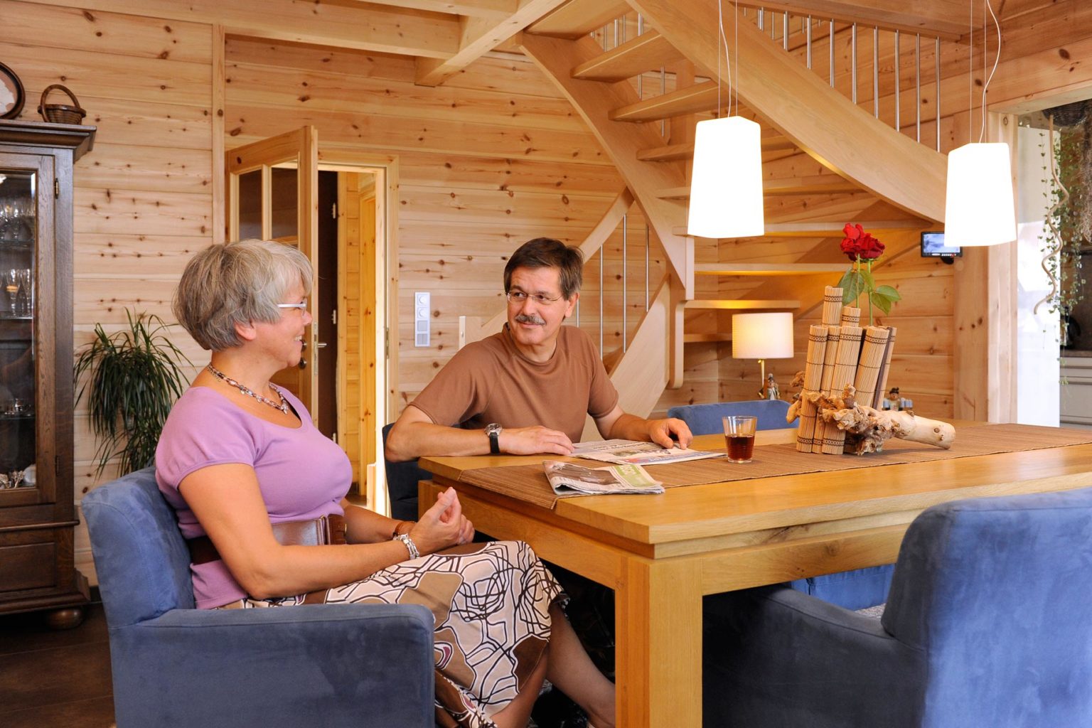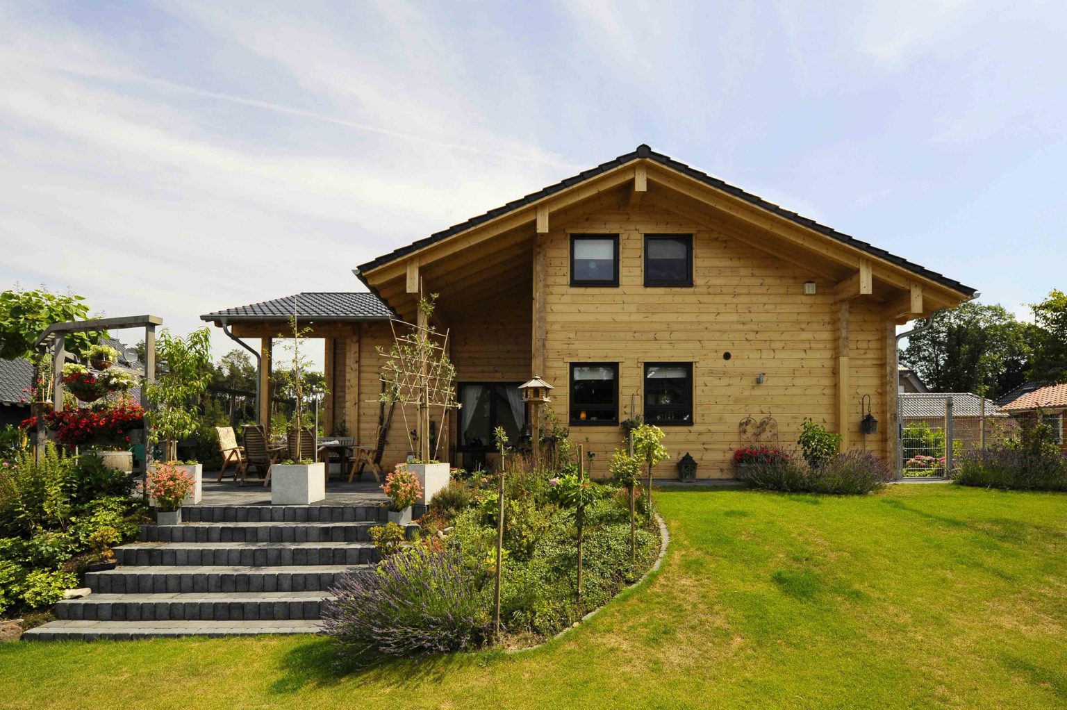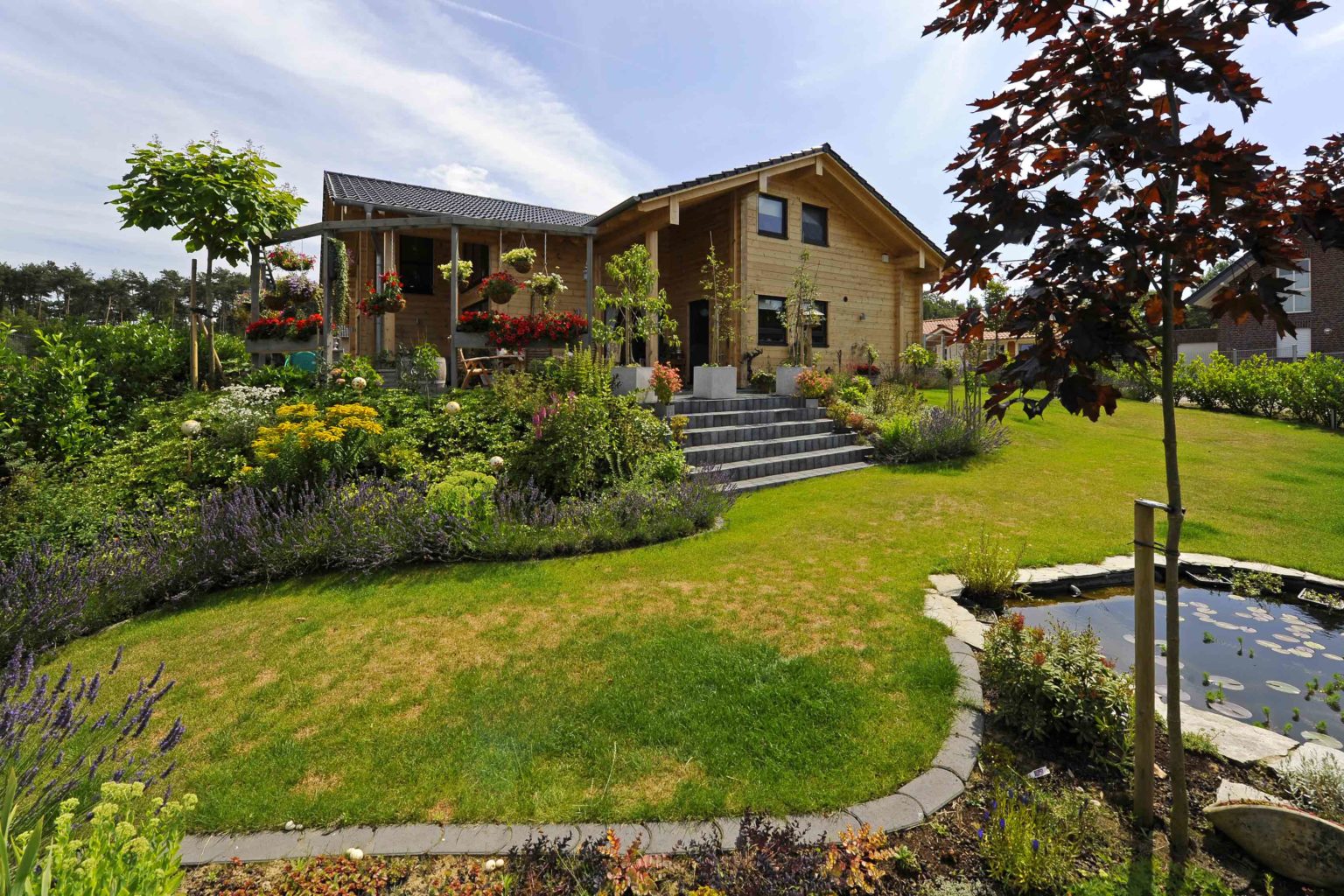 Im Garten setzten sich die gestalterischen Fähigkeiten der Hausherrin fort: Die üppige Blumenpracht zieht zahlreiche, fröhlich brummende Hummeln und vergnügt flatternde Schmetterlinge an. Sogar Rehe aus dem Nachbarwald nähern sich neugierig Holzhaus und Garten, aber auch Wildschweine. Zum Schutz vor letzteren wurde ein fester Zaun um das gesamte Grundstück gezogen. Fürs Rasenmähen ist ausnahmsweise der Hausherr zuständig. Praktisch denkend überlässt er diese Arbeit gerne „William“, dem Roboter-Rasenmäher. Und während dieser leise schnurrend seine Runden über die grünen Flächen zieht, sitzen die zufriedenen Holzhaus Eigentümer entspannt auf der Terrasse. Zog es die beiden früher regelmäßig wegen der schmucken Holzhäuser nach Südtirol und Österreich in den Urlaub, leben sie nun selbst in ihrem Traumhaus aus Massivholz und vermissen höchstens noch das Bergpanorama der Alpen.