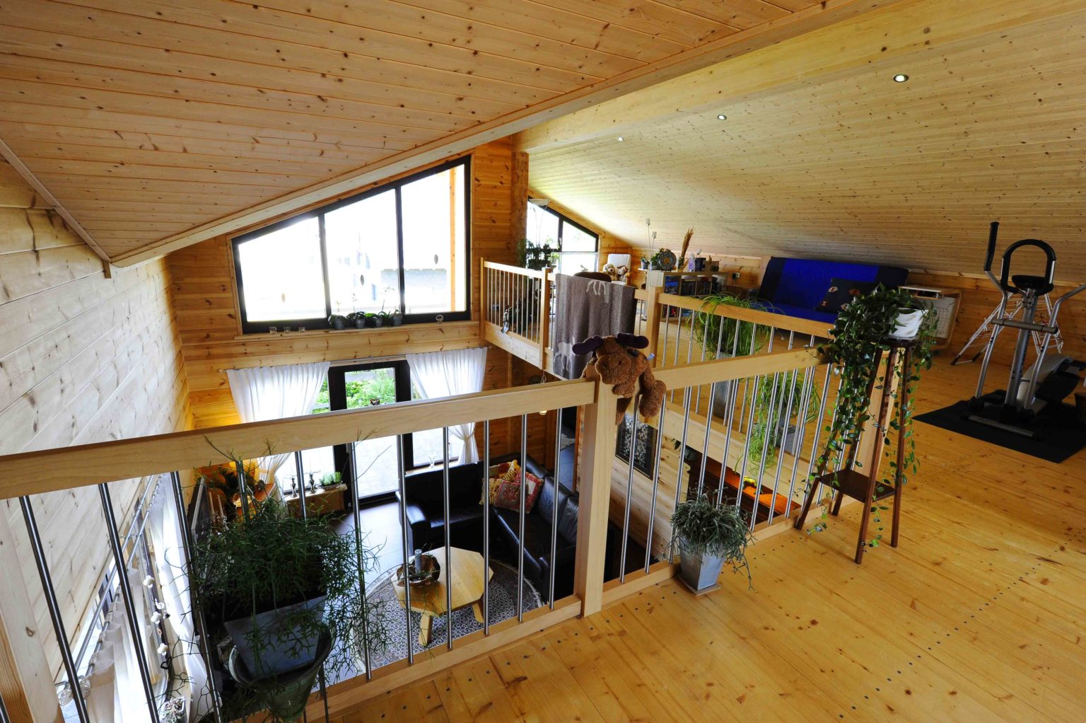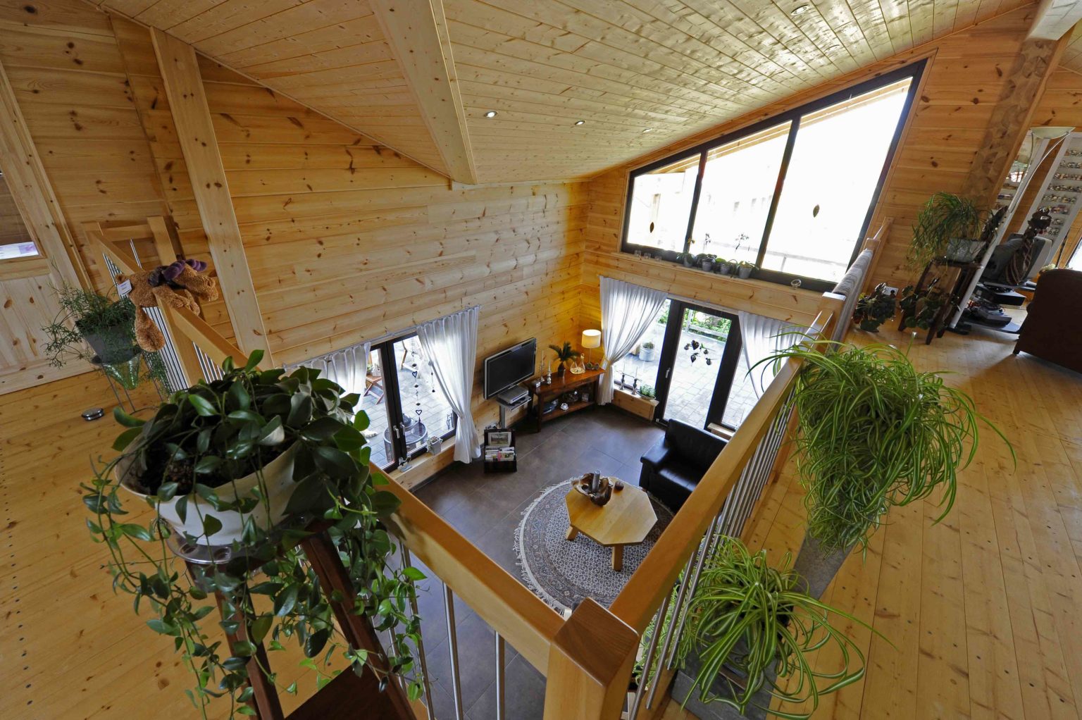 Über eine helle Buchenholztreppe gelangt man vom offenen Wohnbereich in das Obergeschoss des Holzhauses. Oben befindet sich ein großes Gästezimmer mit eigener Dusche, WC und Waschbecken. Der sehr hohe Kniestock lässt hier den Eindruck eines vollen Geschosses entstehen, trotz der Dachschrägen. Ansonsten ist die großflächige Galerie offen mit ineinander übergehendem Arbeitsbereich, Fitnessabteilung und Leseecke am verglasten First. Die Landschaft der Dachschrägen bietet Abwechslung und Gemütlichkeit gleichermaßen - von Enge keine Spur.