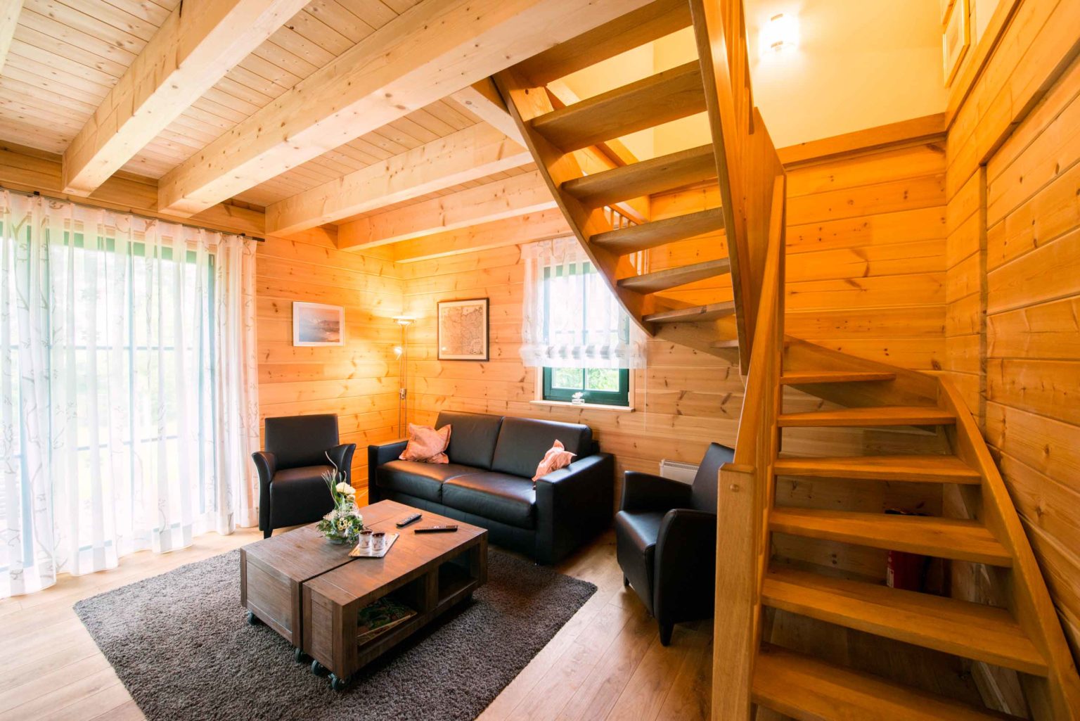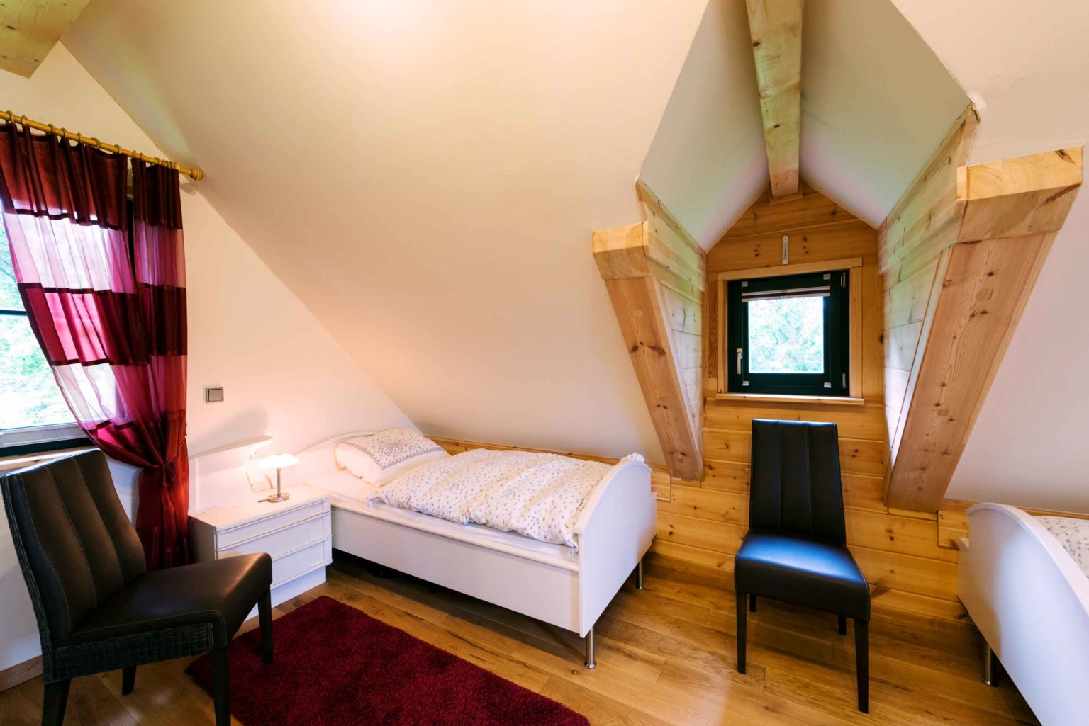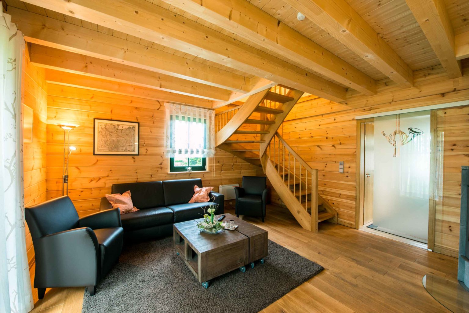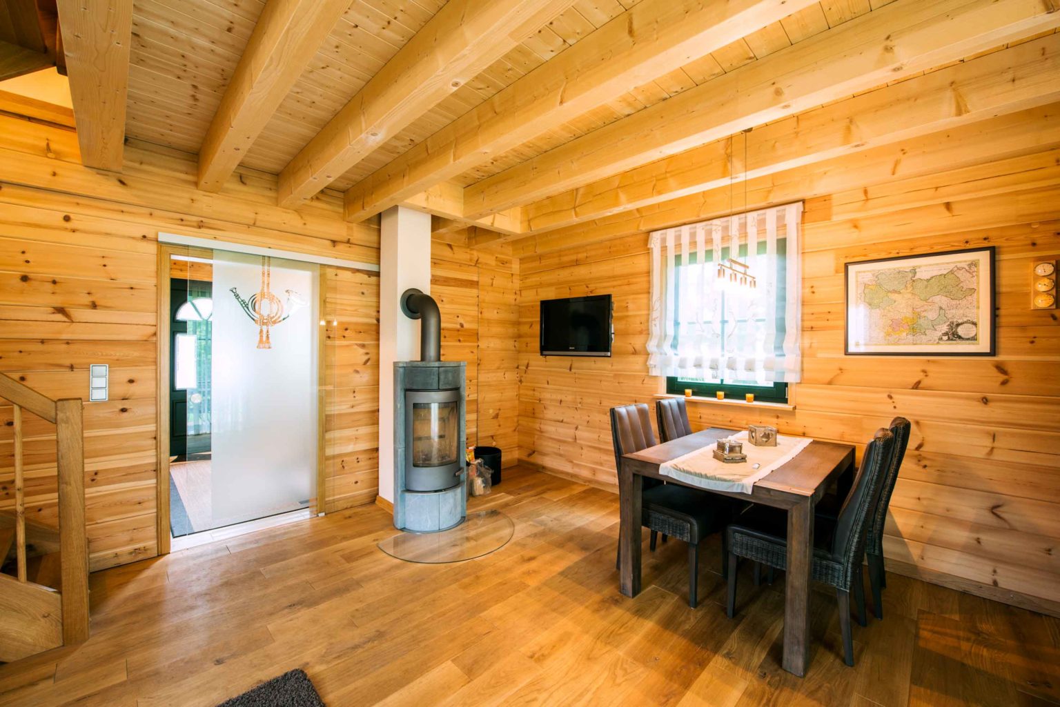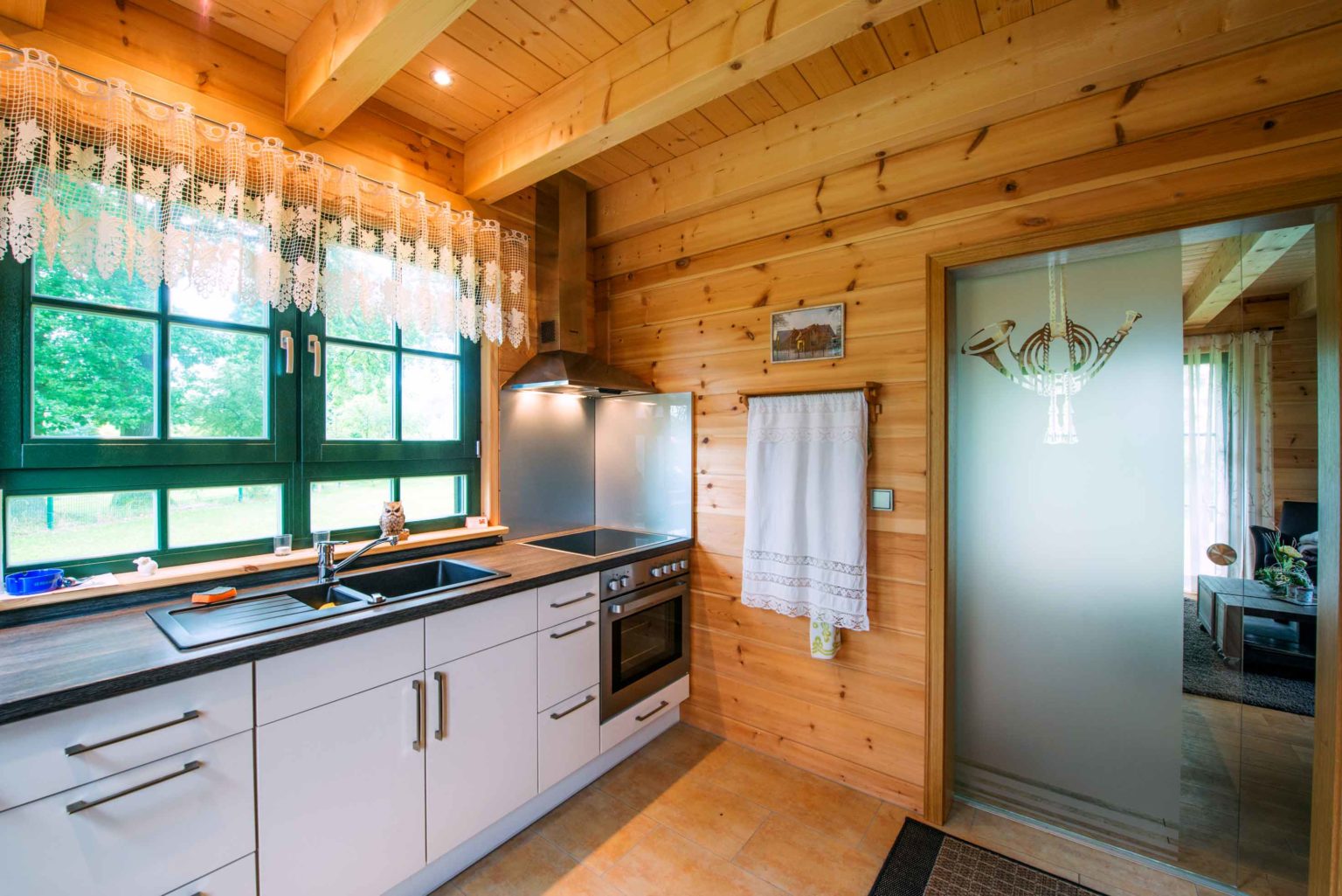 Die hellen Blockwände bewahrt außen ein Schutzanstrich vor Vergrauung und innen eine UV-Schutzlasur vor Nachdunkeln. Für die Wertbeständigkeit des Gebäudes wären keine Anstriche notwendig gewesen. Die roten Dachziegel sind in der Gegend üblich, dazu kombinierte der Hauseigentümer tannengrüne Holzfenster mit Sprossen und Schlagläden in derselben Farbe - damit bekommt Holzhaus „Griesener Jagdhaus“ einen schönen Bezug zu Wald und Jagd. Drinnen wurde komplett auf das Ausstellen von Jagdtrophäen und ausgestopften Tieren verzichtet, stattdessen weist ein in die gläserne Schiebetür zwischen Küche und Wohnbereich eingeschliffenes Jagdhorn elegant auf die Funktion des Hauses hin.