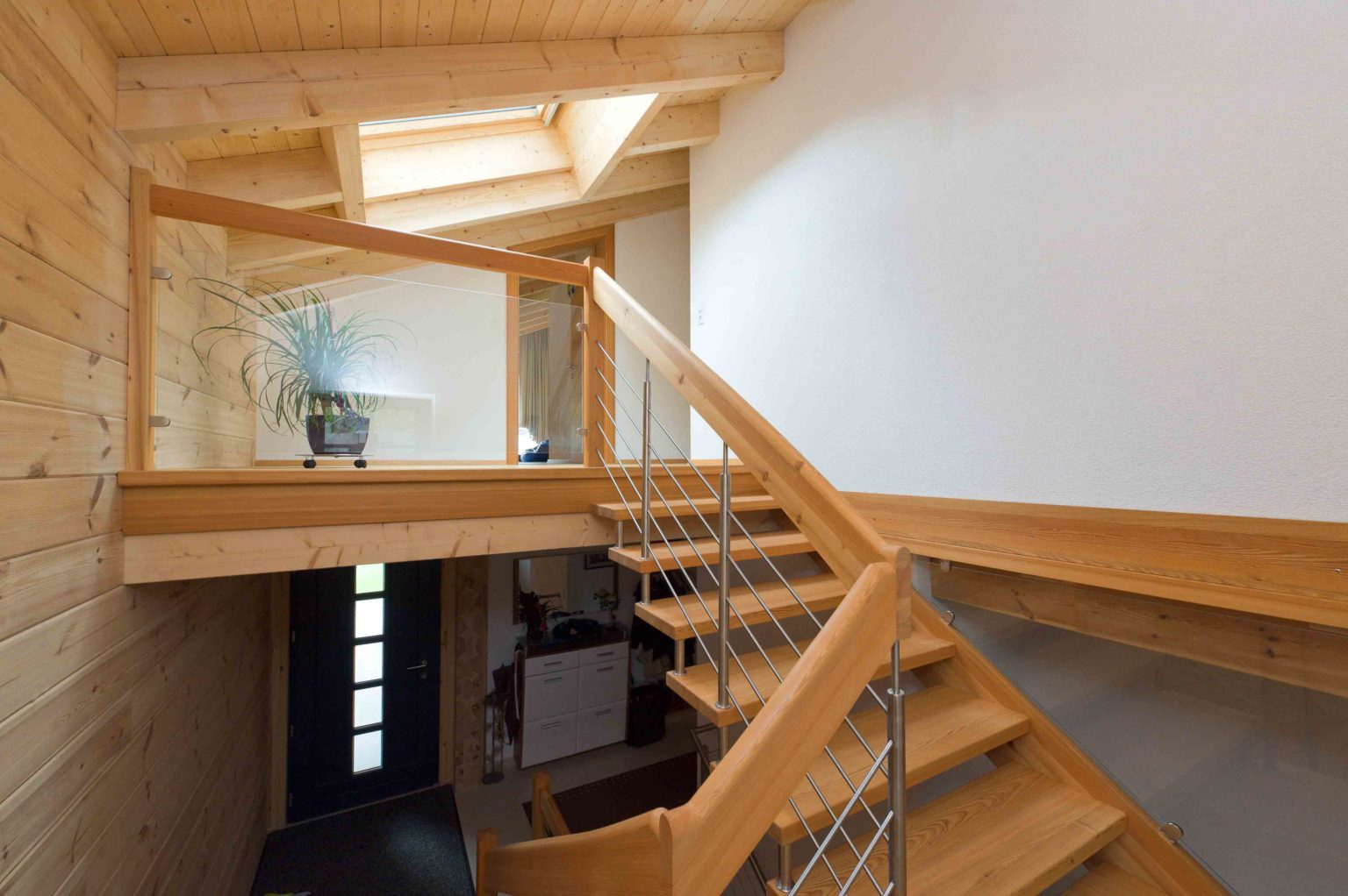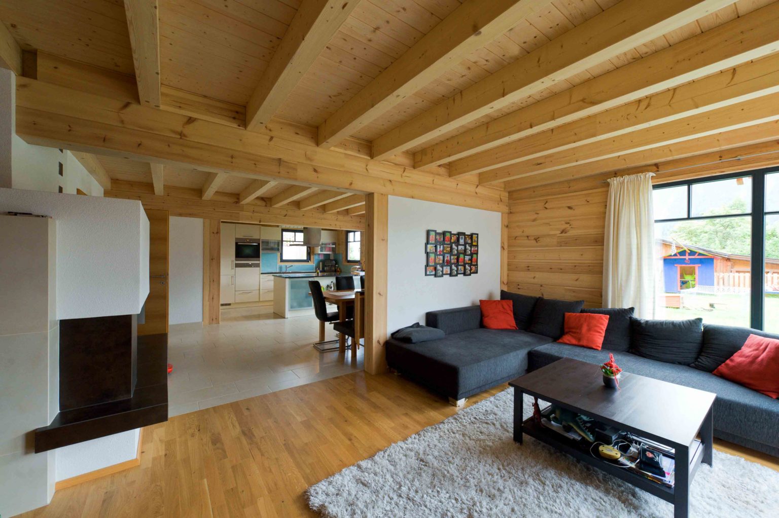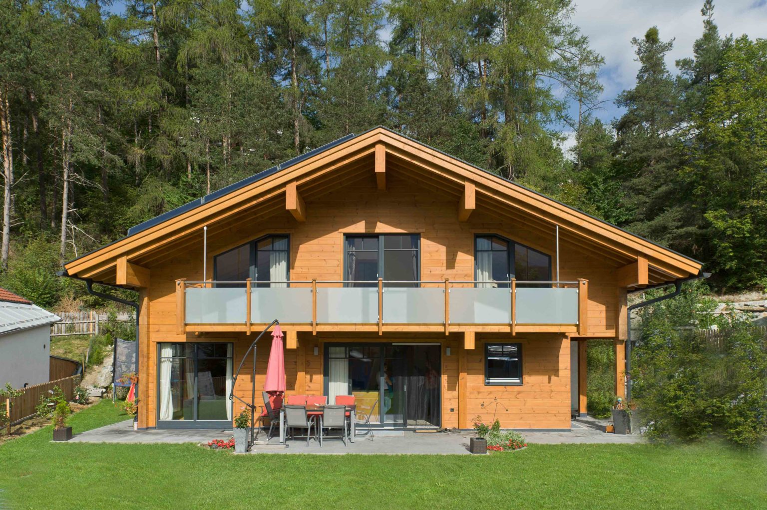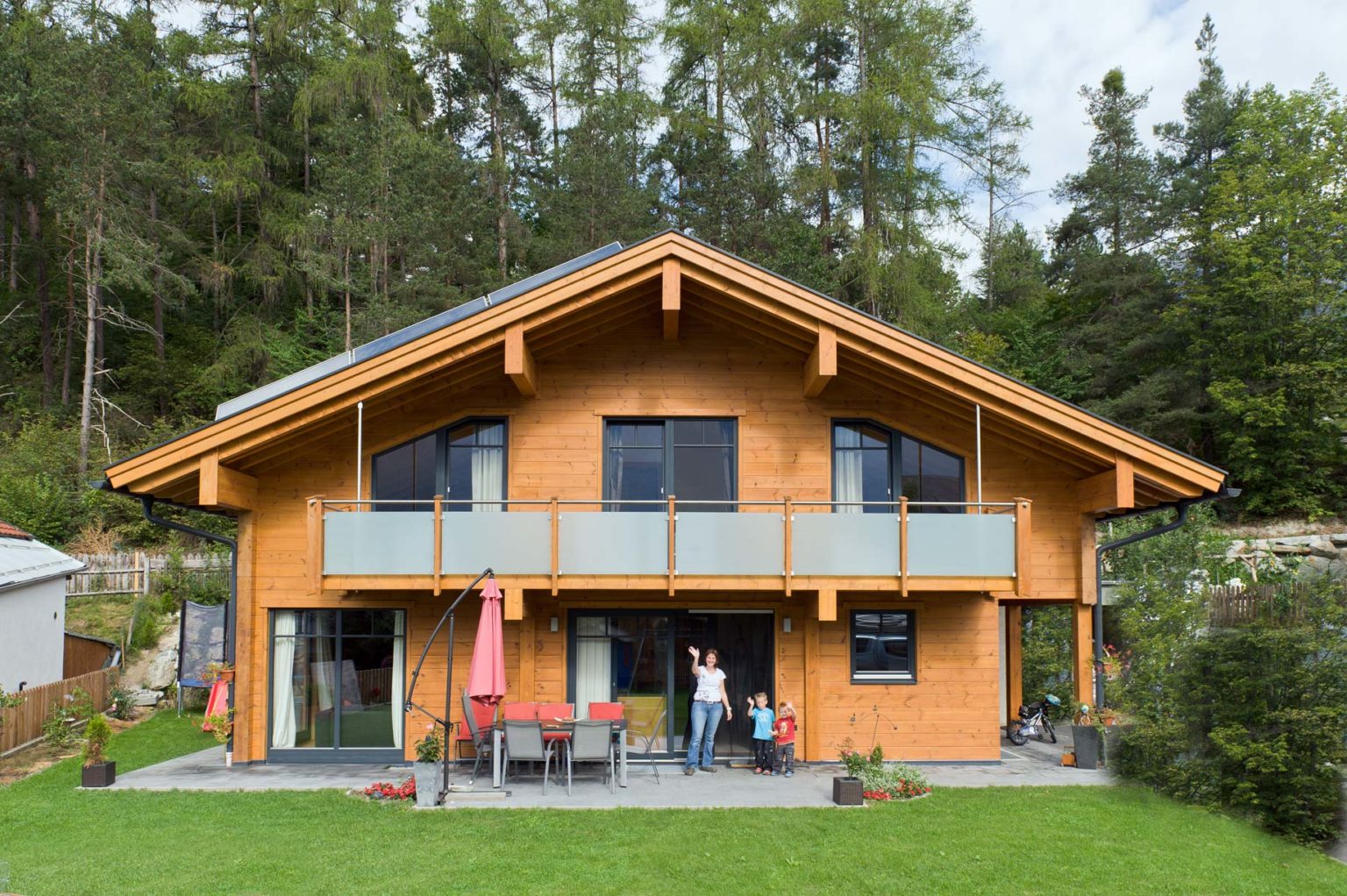 Von außen betrachtet, wirkt Holzhaus „Gurgltal“ nicht besonders groß, dabei verfügt es über gut neunzig Quadratmeter Wohnfläche im Erdgeschoss, und im Dachgeschoss sind es sogar siebenundneunzig. Eine großzügige Diele empfängt den Eintretenden: Blickfang ist hier die freischwebende, sehr breite und trotzdem leicht wirkende Treppe aus Holz, Glas und gespannten Drahtseilen. Neben dem modernen, offenen Wohn-Ess-Kochbereich, der über die Hälfte der Grundfläche einnimmt, gibt es ein Jagdzimmer mit hundert Jahre alter, original „Kärntner Bauernstube“, ein Gäste-WC und ein Arbeitszimmer. Der Küche ist – da frohlockt die Hausfrau – eine geräumige Speisekammer angeschlossen, und das Ganze kann trockenen Fußes von der Garage erreicht werden. (Der Eingangsbereich ist durch das überstehende Dachgeschoss geschützt.) Ins Dachgeschoss, mit angenehm hohem Kniestock, kann sich die Familie in zwei Kinderzimmer und ein Elternschlafzimmer zurückziehen, und noch Besucher im Gästezimmer unterbringen. Den Luxus von zwei Bädern – eins für die Großen und eins für den Nachwuchs – gönnen sich die Hauseigentümer. Alle Räume sind über eine mittig positionierte Diele erreichbar. Der über die gesamte Hausbreite verlaufende Balkon trägt nicht nur zur ausgewogenen Optik des Hauses bei: Er dient auch den Kindern als Spielplatz und Gästen als Aussichtsort. Außen wurde Holzhaus „Gurgltal“ in der Farbe „Kiefer“ und mit Wetterschutz gestrichen. Im Innern hat das Ehepaar den massiven Außenwänden leichte Ständerbauwände hinzugefügt und diese weiß oder farbig gestrichen. Nun wird das rundherum eintretende Tageslicht entweder von weißen Wandflächen reflektiert, oder es bringt die rote Wand im Wohnbereich und die helle, warme Farbe der Holzwände schön zum leuchten.