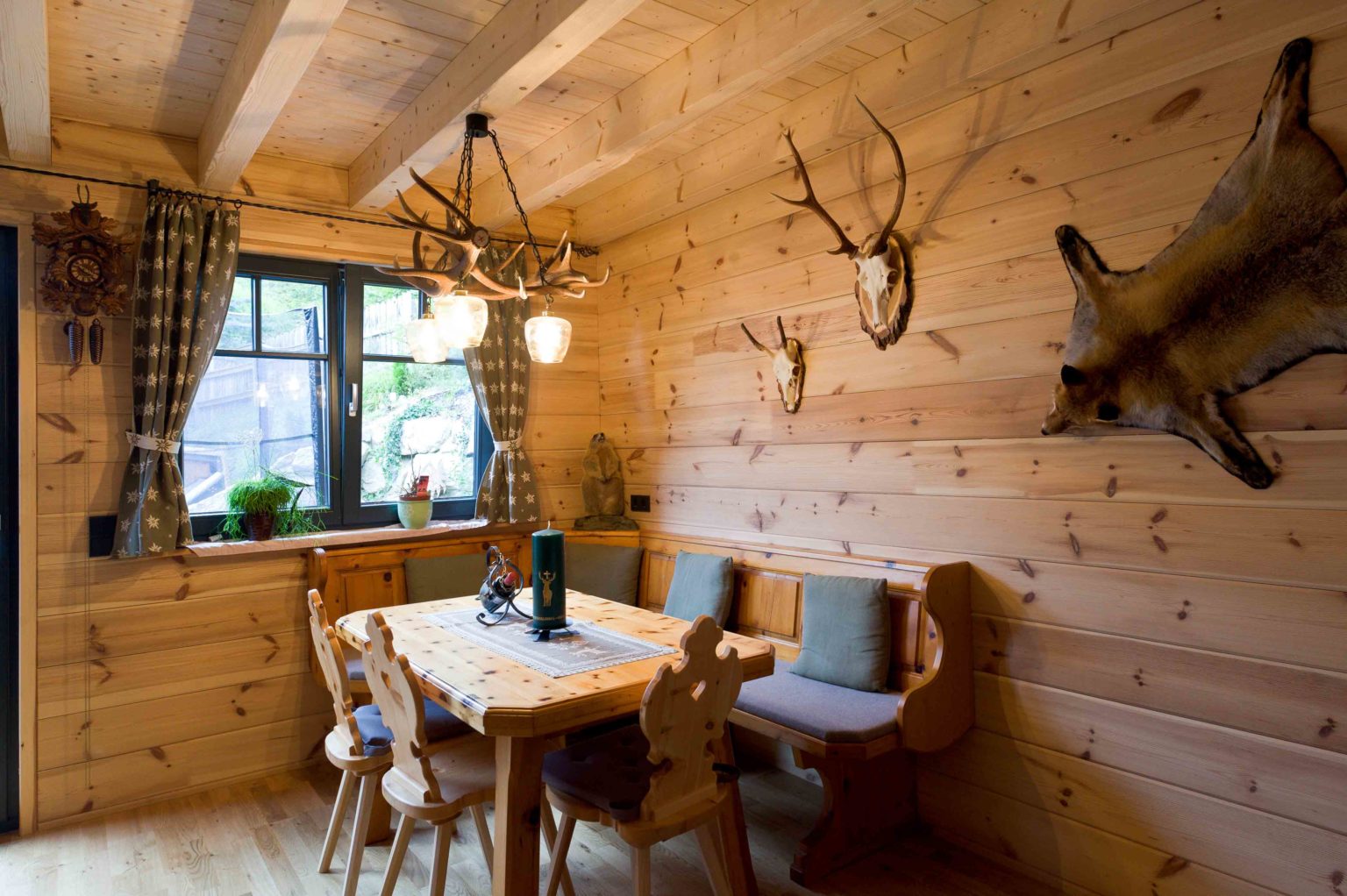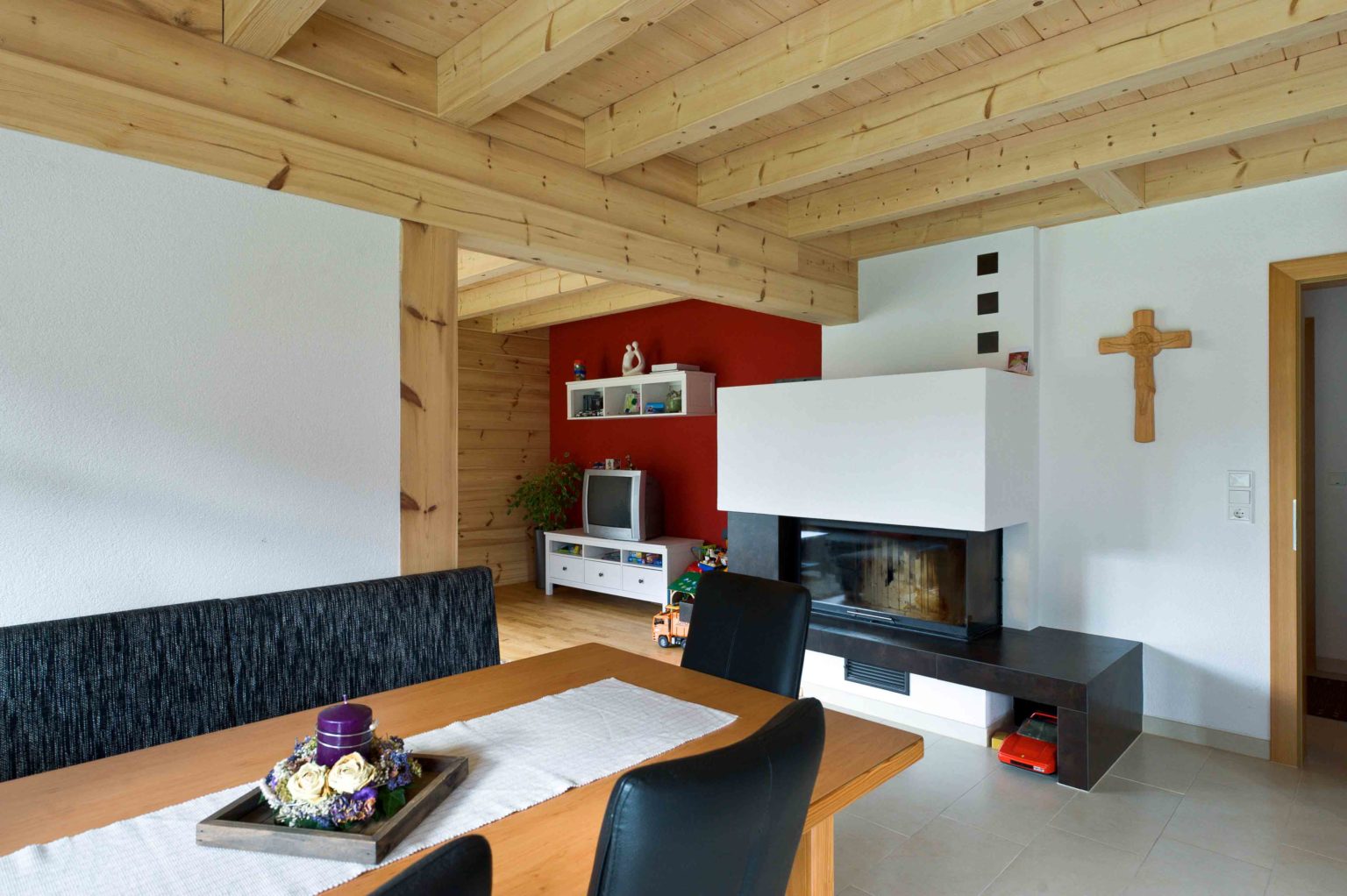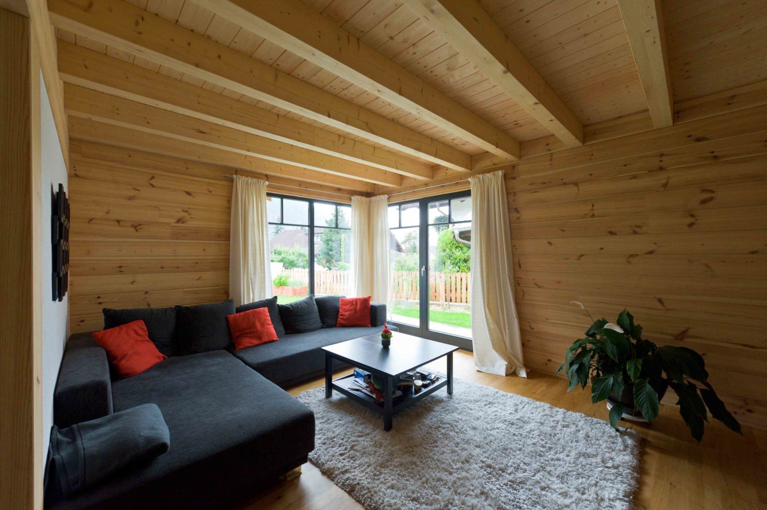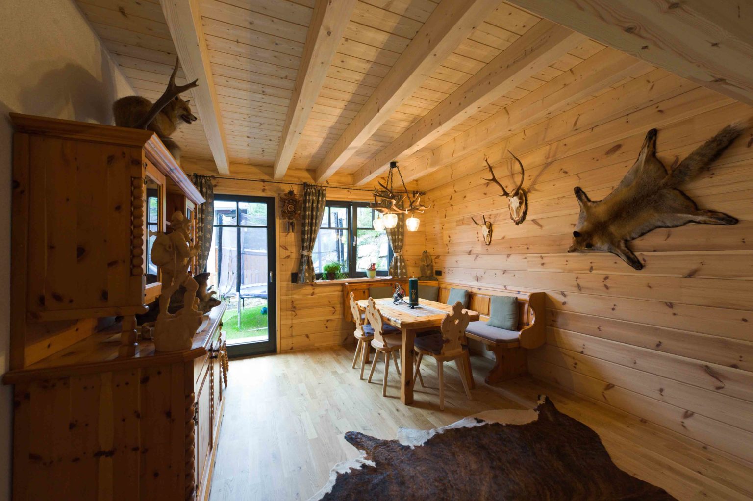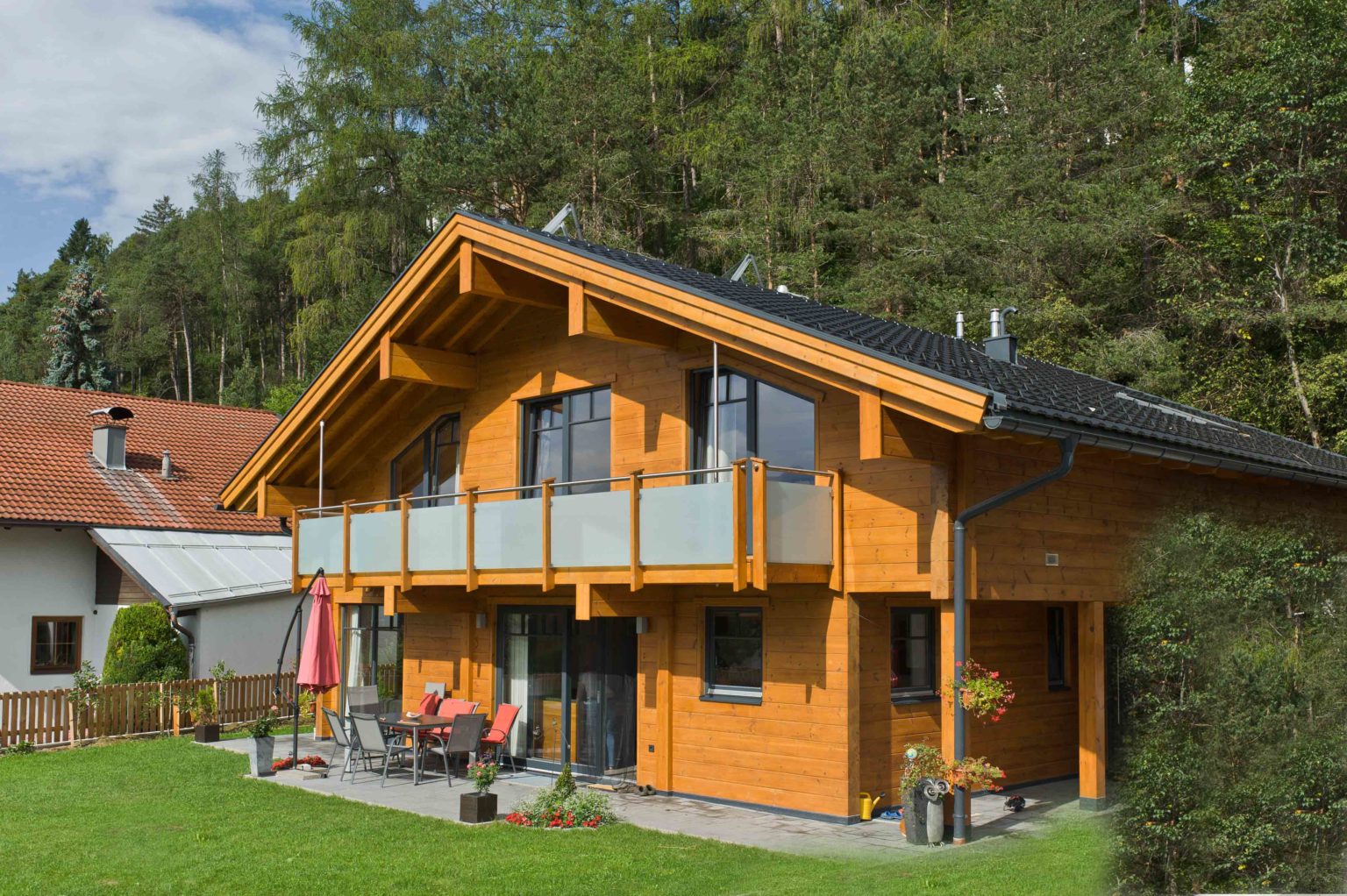 Von außen betrachtet, wirkt Holzhaus „Gurgltal“ nicht besonders groß, dabei verfügt es über gut neunzig Quadratmeter Wohnfläche im Erdgeschoss, und im Dachgeschoss sind es sogar siebenundneunzig. Eine großzügige Diele empfängt den Eintretenden: Blickfang ist hier die freischwebende, sehr breite und trotzdem leicht wirkende Treppe aus Holz, Glas und gespannten Drahtseilen. Neben dem modernen, offenen Wohn-Ess-Kochbereich, der über die Hälfte der Grundfläche einnimmt, gibt es ein Jagdzimmer mit hundert Jahre alter, original „Kärntner Bauernstube“, ein Gäste-WC und ein Arbeitszimmer. Der Küche ist – da frohlockt die Hausfrau – eine geräumige Speisekammer angeschlossen, und das Ganze kann trockenen Fußes von der Garage erreicht werden. (Der Eingangsbereich ist durch das überstehende Dachgeschoss geschützt.) Ins Dachgeschoss, mit angenehm hohem Kniestock, kann sich die Familie in zwei Kinderzimmer und ein Elternschlafzimmer zurückziehen, und noch Besucher im Gästezimmer unterbringen. Den Luxus von zwei Bädern – eins für die Großen und eins für den Nachwuchs – gönnen sich die Hauseigentümer. Alle Räume sind über eine mittig positionierte Diele erreichbar. Der über die gesamte Hausbreite verlaufende Balkon trägt nicht nur zur ausgewogenen Optik des Hauses bei: Er dient auch den Kindern als Spielplatz und Gästen als Aussichtsort. Außen wurde Holzhaus „Gurgltal“ in der Farbe „Kiefer“ und mit Wetterschutz gestrichen. Im Innern hat das Ehepaar den massiven Außenwänden leichte Ständerbauwände hinzugefügt und diese weiß oder farbig gestrichen. Nun wird das rundherum eintretende Tageslicht entweder von weißen Wandflächen reflektiert, oder es bringt die rote Wand im Wohnbereich und die helle, warme Farbe der Holzwände schön zum leuchten.