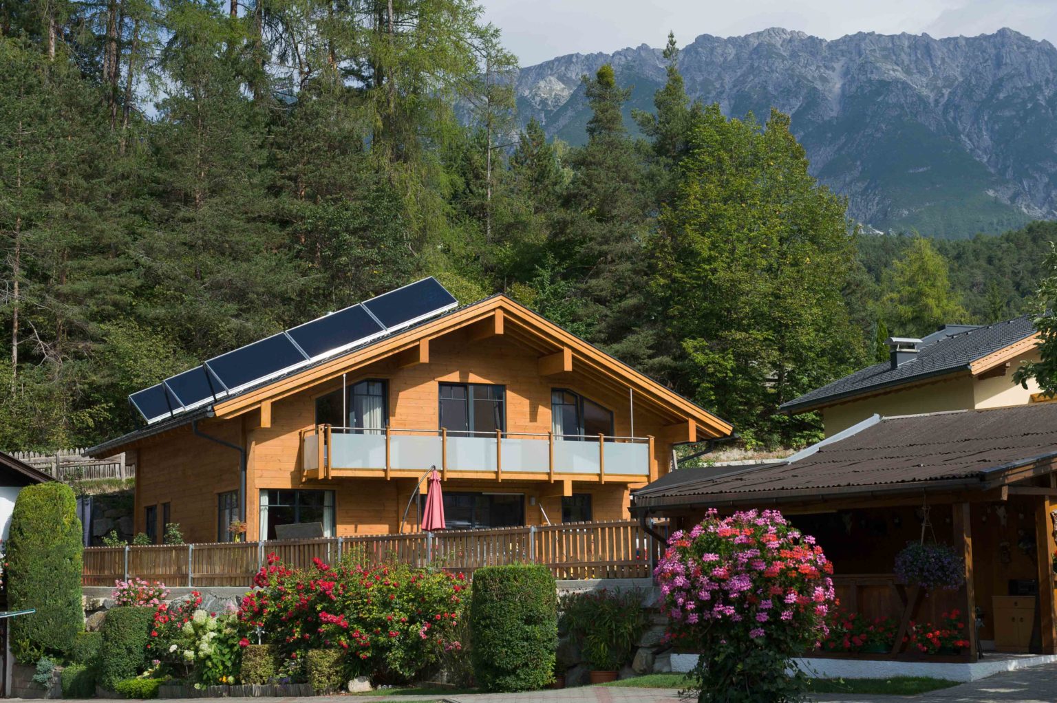 Zum Heizen entschieden sich die Besitzer von Holzhaus „Gurgltal“ für die Nutzung von regenerativen Energien, nämlich einer zwanzig Quadratmeter messenden Solaranlage zur Warmwassergewinnung sowie einer Pelletsheizung. Das durch die auf dem Hausdach befindliche Solaranlage erwärmte Wasser speist auch die Fußbodenheizung, den Rest übernimmt der Pelletsofen im Keller. Und für die gemütliche Strahlungswärme mit kuscheligem Ambiente ist der große Kachelofen im Wohnbereich zuständig. Aber das Haus kann noch mehr: Die etwa 54 Kubikmeter verbautes Kiefernholz speichern rund 48.600 Tonnen Kohlendioxyd als Kohlenstoff; die Pelletsheizung braucht circa 62 Jahre, um diese Menge wieder auszustoßen. Das heißt, dass die Familie erst nach mindestens zweiundsechzig Jahren Heizen anfängt, die Atmosphäre zu belasten. Das Holzhaus bietet somit eine „Gutschrift“ für den Klimaschutz. Der Deutsche Massivholz- und Holzhausverband (DMBV) zertifiziert solche Häuser mit dem Label „DMBVaktivhaus“. Mehr kann eine Privatperson nicht zum Klimaschutz beitragen.