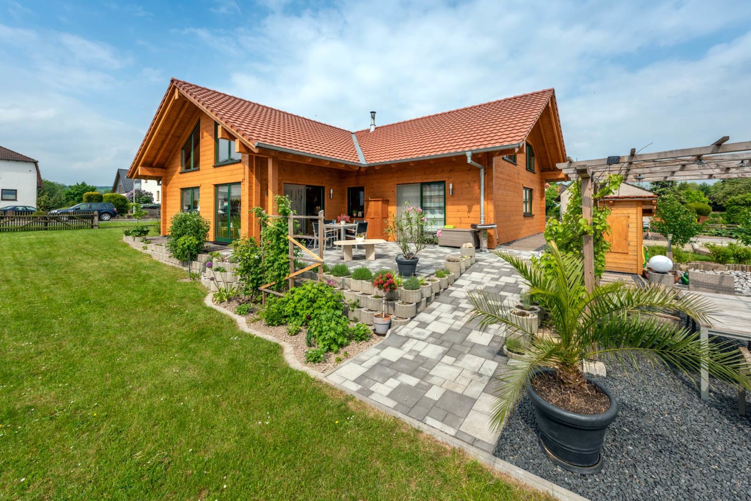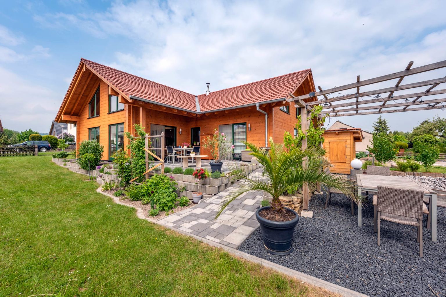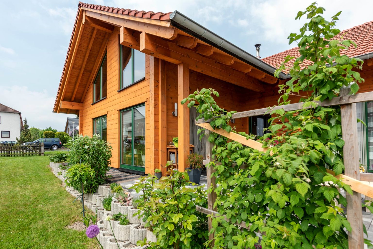 Holzhaus „Harzblick II“ besitzt einen winkelförmigen Grundriss und ist barrierefrei. Eingeschossig ist das Gebäude zwar nicht – im Dachgeschoss befindet sich eine Galerie, die ausschließlich als Abstellfläche genutzt wird – aber seine Bewohner leben ausschließlich im Erdgeschoss auf einer Ebene. Dazu gehört draußen auch eine stufenlose, große, gepflasterte Terrasse, die bei Bedarf auch mit Rollator oder Rollstuhl befahrbar wäre. „Mein Mann hat draußen alles selbst gemacht und hegt und pflegt unsere schöne Garten- und Terrassenanlage eigenhändig.“, schwärmt die Hauseigentümerin. Betreten wird das Holzhaus an der nördlichen Traufseite, wo man in eine Diele mit langem Flur gelangt. Von hier führt gleich rechts eine Treppe hinauf auf die Galerie und links befindet sich ein Gäste-WC. Geradeaus durch die Tür geht es direkt ins Herzstück des Hauses: den großflächigen, offenen Wohn-/Ess-/Kochbereich mit Rundumsicht in den Garten. Läuft man nach links durch den Flur anstatt in den Wohnbereich, kommt man in ein geräumiges Duschbad, in ein Arbeitszimmer und zum Schlafzimmer mit einer Fenstertüre zur Terrasse.