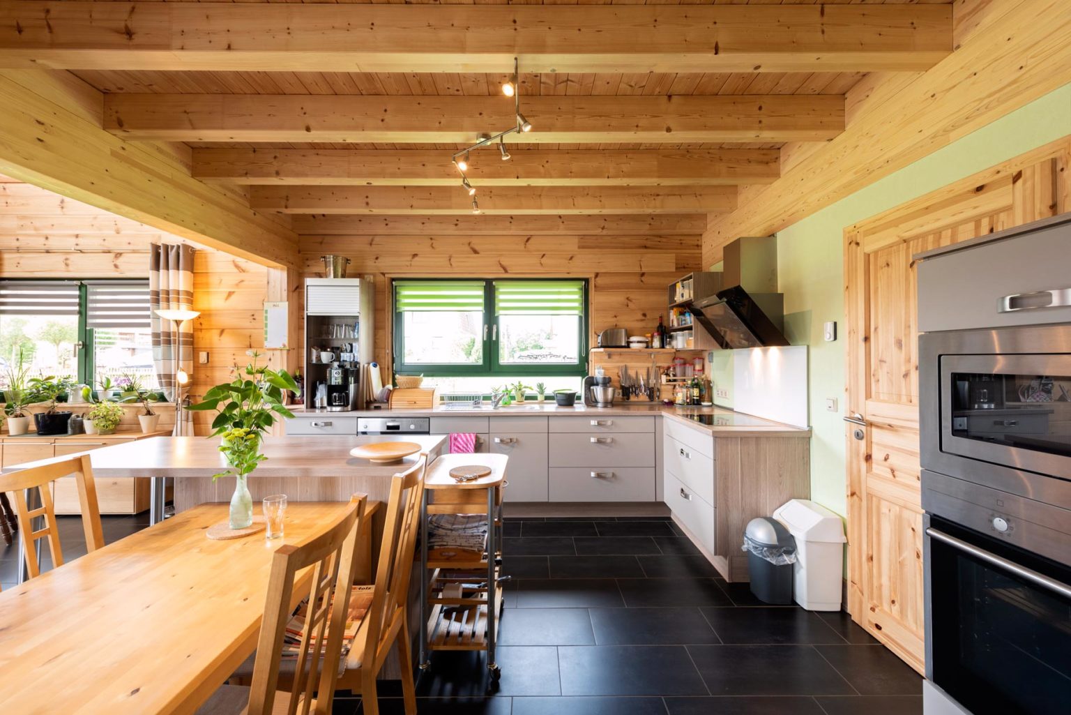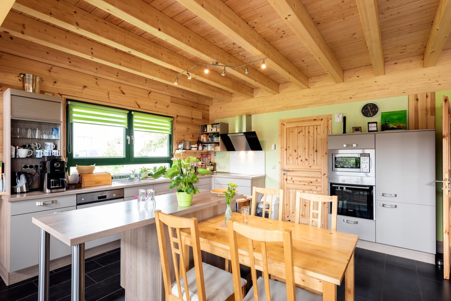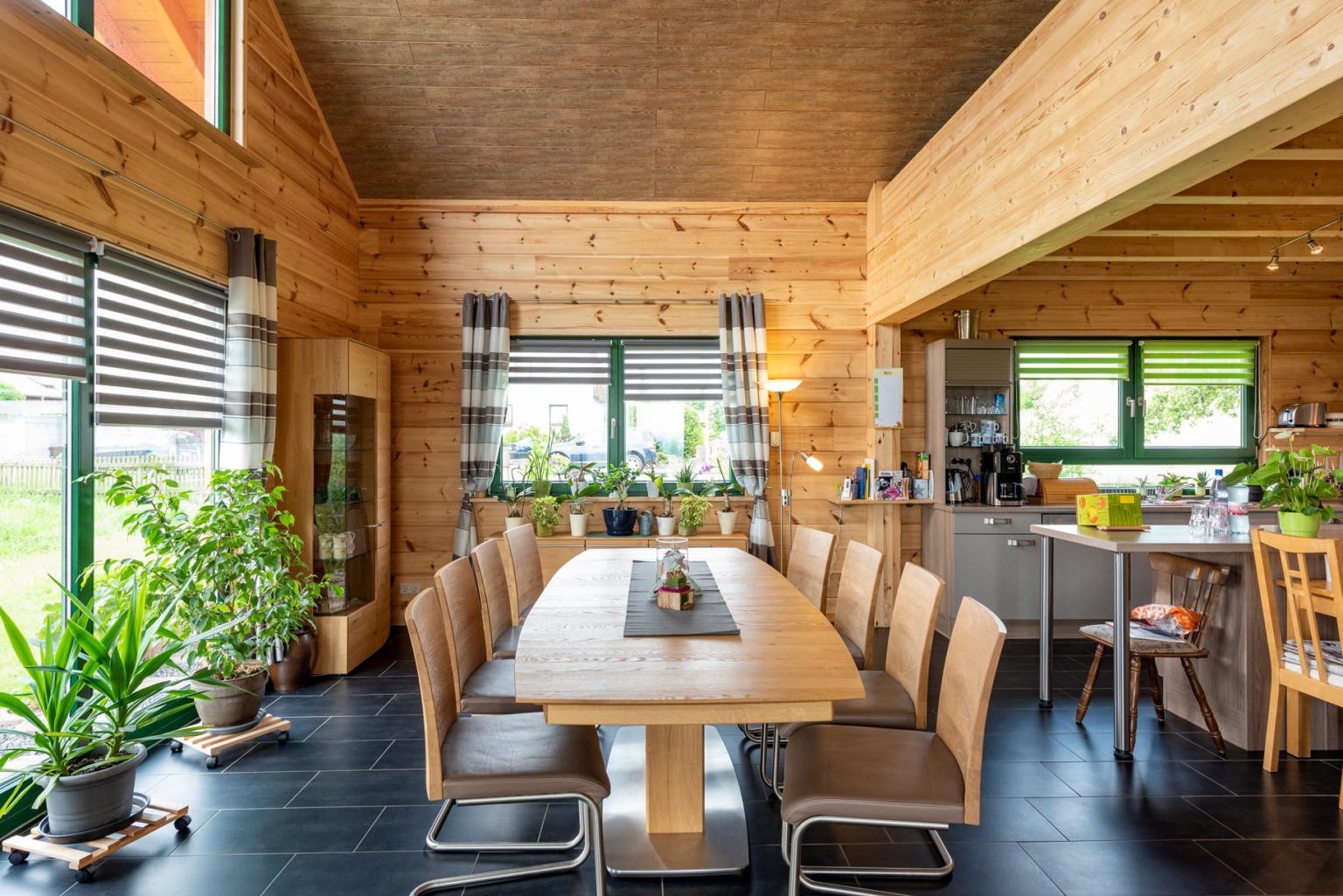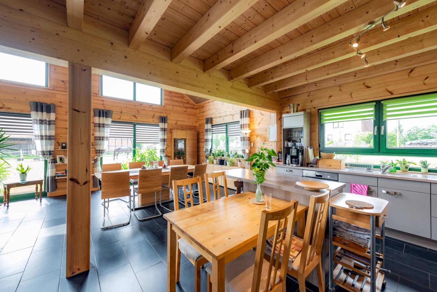 Eindrucksvolle Sichtbalkendecken aus massivem Polarkiefernholz spannen sich in üblicher Raumhöhe über etwa ein Fünftel der Wohnfläche und schenken den Räumen Holzhaus-Charakter und Gemütlichkeit. Im Wohnzimmerteil des offenen Wohnbereichs erstreckt sich dagegen ein gewaltiger Luftraum bis hinauf zur sichtbaren Firstpfette. Entsprechend großzügig und frei ist das Wohngefühl hier, auch wegen der breiten, bodentiefen Fenster, die reichlich Tageslicht hereinlassen und viel Sicht nach draußen zulassen. Behaglich ist es auch in diesem Hausteil trotzdem – dafür sorgen die massiven Blockwände aus naturheller Polarkiefer. „Den Dachstuhl haben wir lieber verschalt und etwas dunkler lasiert, die Holzwände hingegen mit UV-Schutz und einem abwaschbaren Anstrich versehen. So bleibt das Holz hell und wir können es nach Belieben abwischen.“, erklärt der Hauseigentümer. Für den Außenanstrich wählte das Ehepaar einen warmen Braunton, kombinierte dunkelgrüne Fenster dazu und entschied sich für ein rotes Ziegeldach. Die Trennwände im Hausinnern sind aus leichtem Ständerbau und kommen ganz ohne Holz aus. „Ausschließlich Holz wollten wir nicht im Haus, deshalb haben wir die Trennwände tapeziert und in hellen Farben gestrichen. Das sorgt für viel Abwechslung“, sagt die Dame des Hauses.