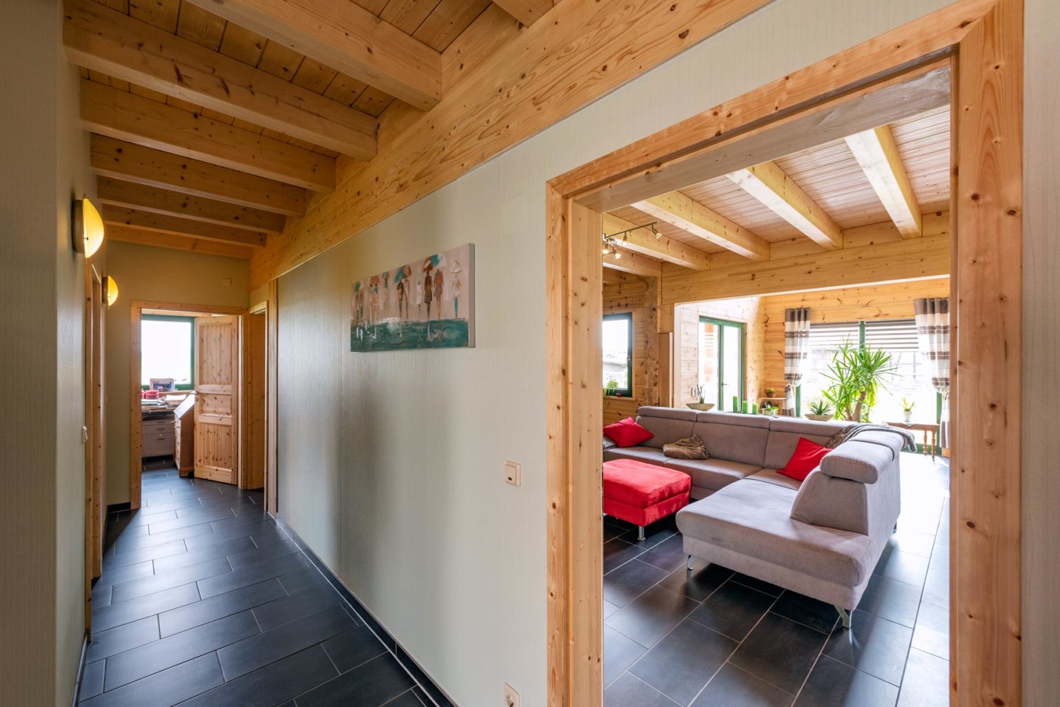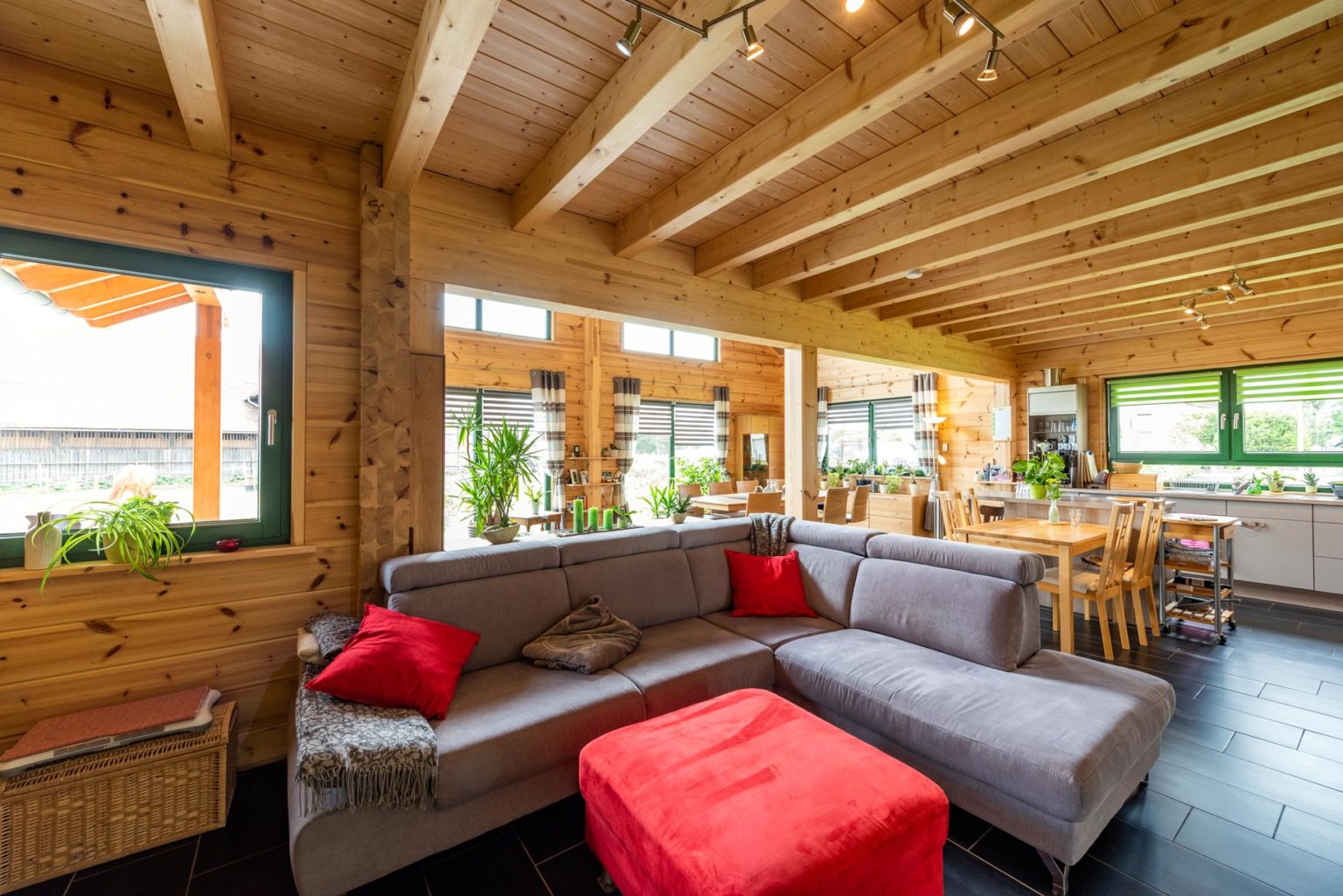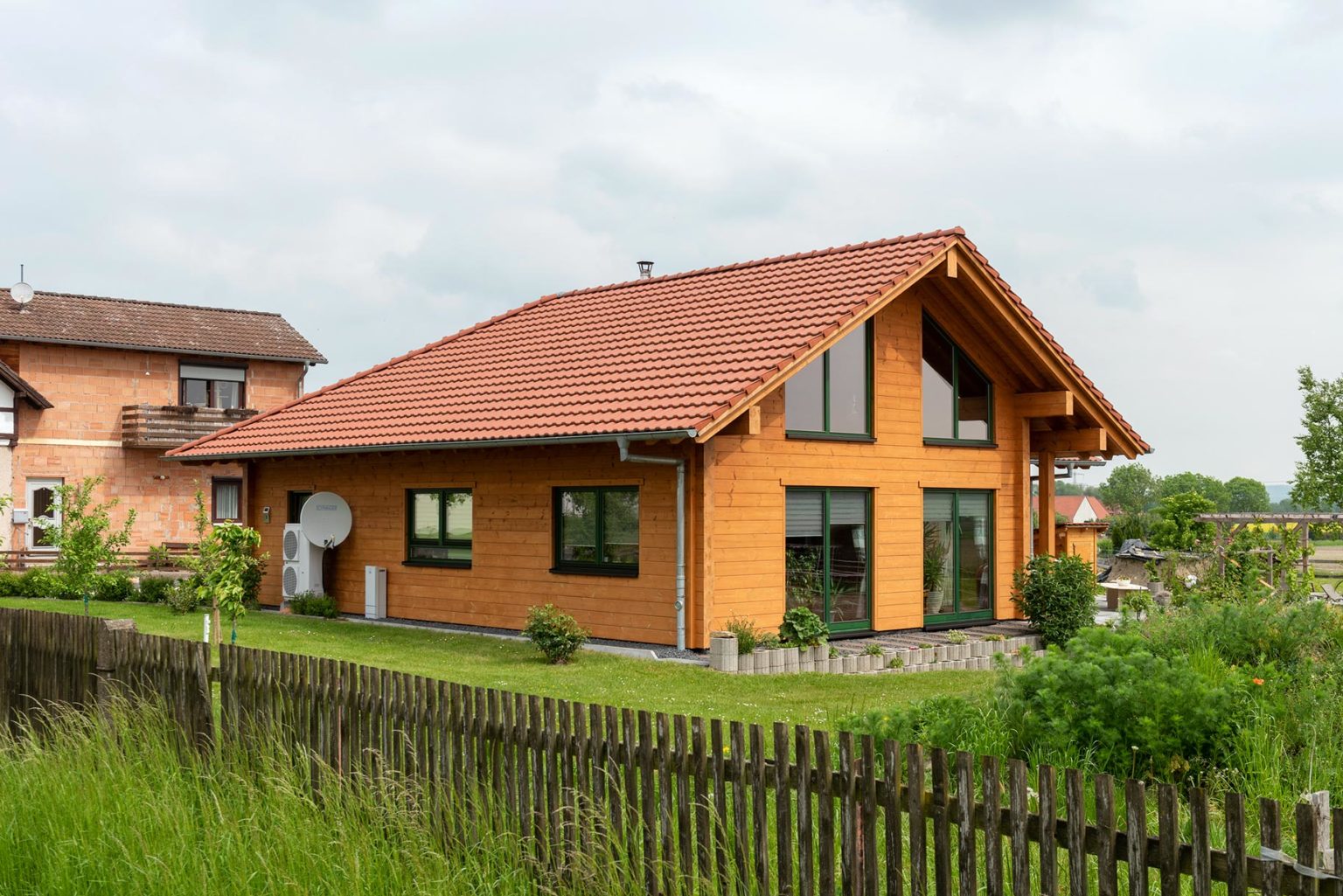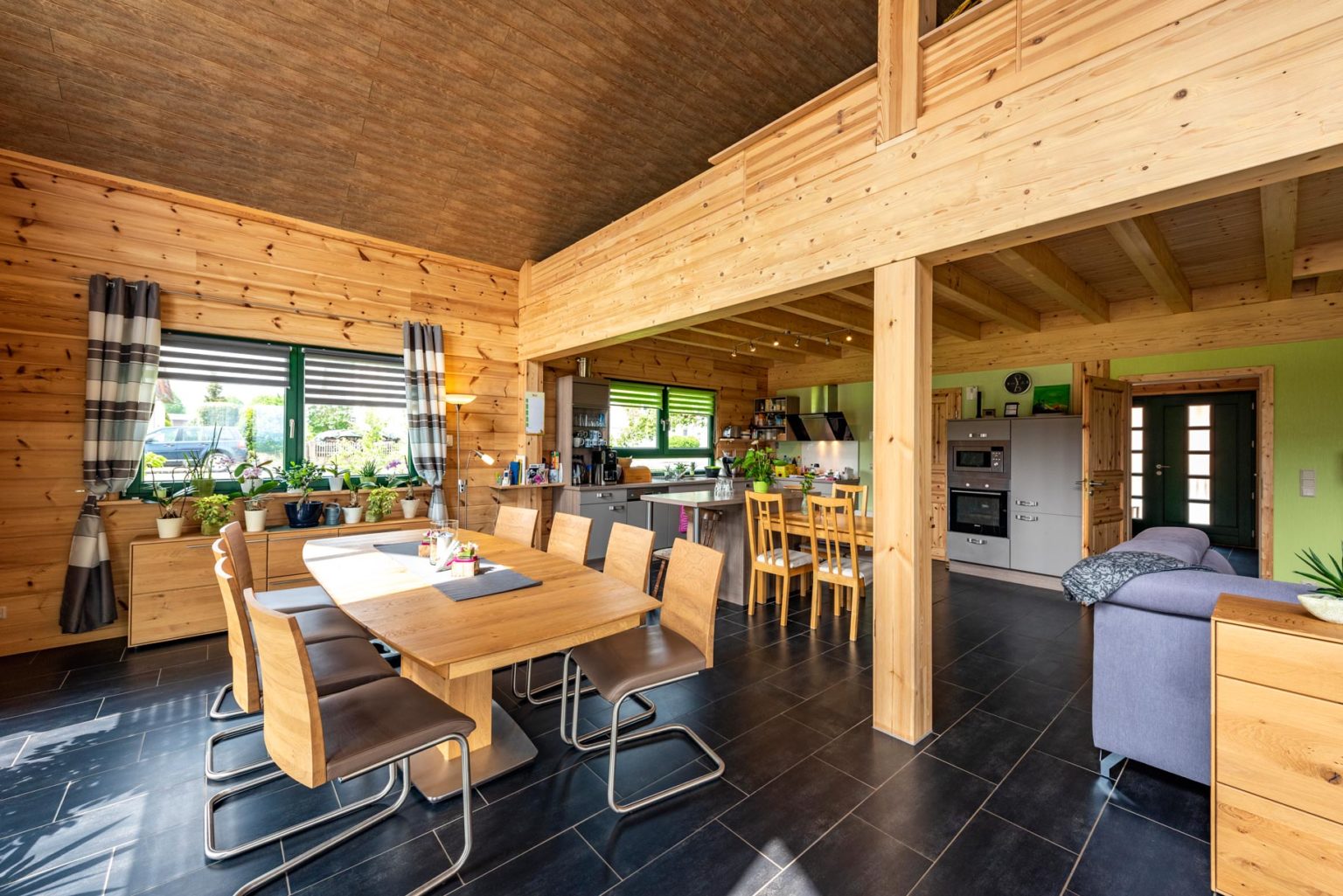 Eindrucksvolle Sichtbalkendecken aus massivem Polarkiefernholz spannen sich in üblicher Raumhöhe über etwa ein Fünftel der Wohnfläche und schenken den Räumen Holzhaus-Charakter und Gemütlichkeit. Im Wohnzimmerteil des offenen Wohnbereichs erstreckt sich dagegen ein gewaltiger Luftraum bis hinauf zur sichtbaren Firstpfette. Entsprechend großzügig und frei ist das Wohngefühl hier, auch wegen der breiten, bodentiefen Fenster, die reichlich Tageslicht hereinlassen und viel Sicht nach draußen zulassen. Behaglich ist es auch in diesem Hausteil trotzdem – dafür sorgen die massiven Blockwände aus naturheller Polarkiefer. „Den Dachstuhl haben wir lieber verschalt und etwas dunkler lasiert, die Holzwände hingegen mit UV-Schutz und einem abwaschbaren Anstrich versehen. So bleibt das Holz hell und wir können es nach Belieben abwischen.“, erklärt der Hauseigentümer. Für den Außenanstrich wählte das Ehepaar einen warmen Braunton, kombinierte dunkelgrüne Fenster dazu und entschied sich für ein rotes Ziegeldach. Die Trennwände im Hausinnern sind aus leichtem Ständerbau und kommen ganz ohne Holz aus. „Ausschließlich Holz wollten wir nicht im Haus, deshalb haben wir die Trennwände tapeziert und in hellen Farben gestrichen. Das sorgt für viel Abwechslung“, sagt die Dame des Hauses.