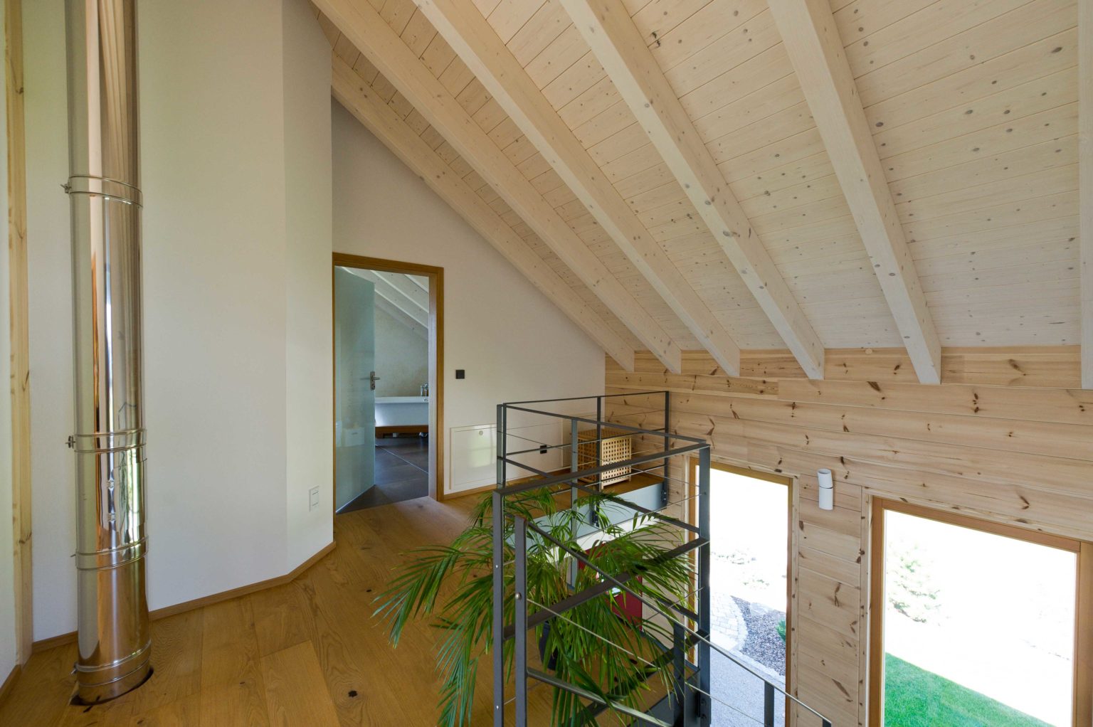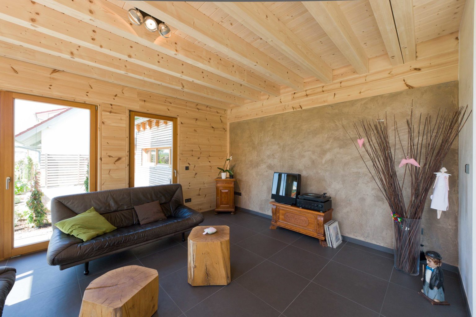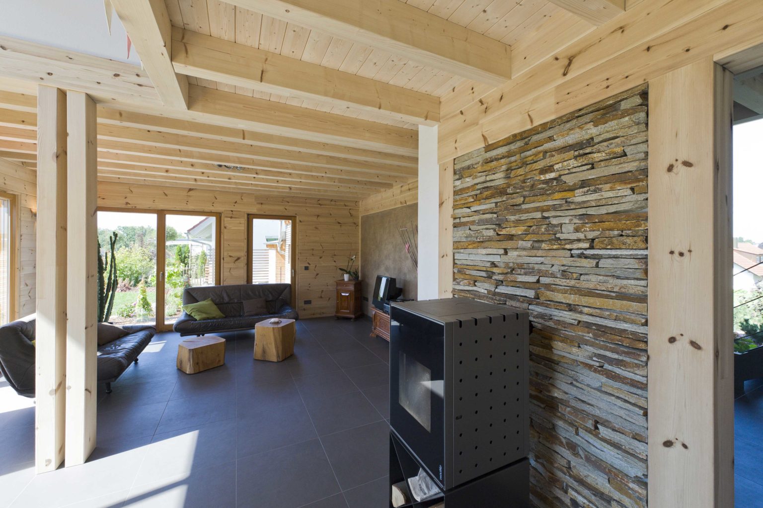 Ihr wärmeeffizientes, nachhaltig gebautes „Green Building“ beheizen die Berndts mit Hilfe einer Luft-Wärmepumpe und eines ganz modern und schlicht aussehenden Kaminofens; dieser zaubert immer ganz schnell urgemütliche Strahlungswärme ins Haus und der meditative Blick durch die Glasscheibe auf lodernde Flammen verhilft zu innerer Ruhe. Die so gut wie setzungsfreien Wände ihres Holzhauses sind absolut winddicht und halten die Wärme im Winter sehr gut drinnen, während es im Hochsommer nie zu Überhitzung im Innenbereich kommt. Das Holz scheint wie eine natürliche Klimaanlage zu wirken. Damit die natürliche Kiefernfarbe der Innenwände dauerhaft hell bleibt, wurden die Holzwände im gesamten Innenbereich mit einem UV-Schutzmittel behandelt und die Decken im Obergeschoss erhielten noch einen zusätzlichen Anstrich mit ganz wenigen, weißen Pigmenten – das hellt zusätzlich auf. Der Außenanstrich erfolgte indes in Holz farbener Lasur, damit kein Vergrauen des Holzes einsetzt. Die ganze Familie fühlt sich rundum wohl in ihrem individuellen Holzhaus. Die Hausherrin strahlt zum Abschied:
