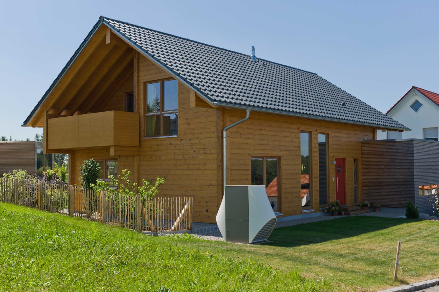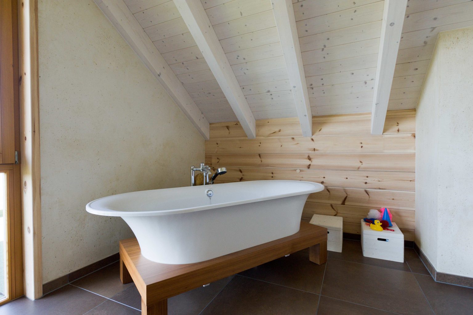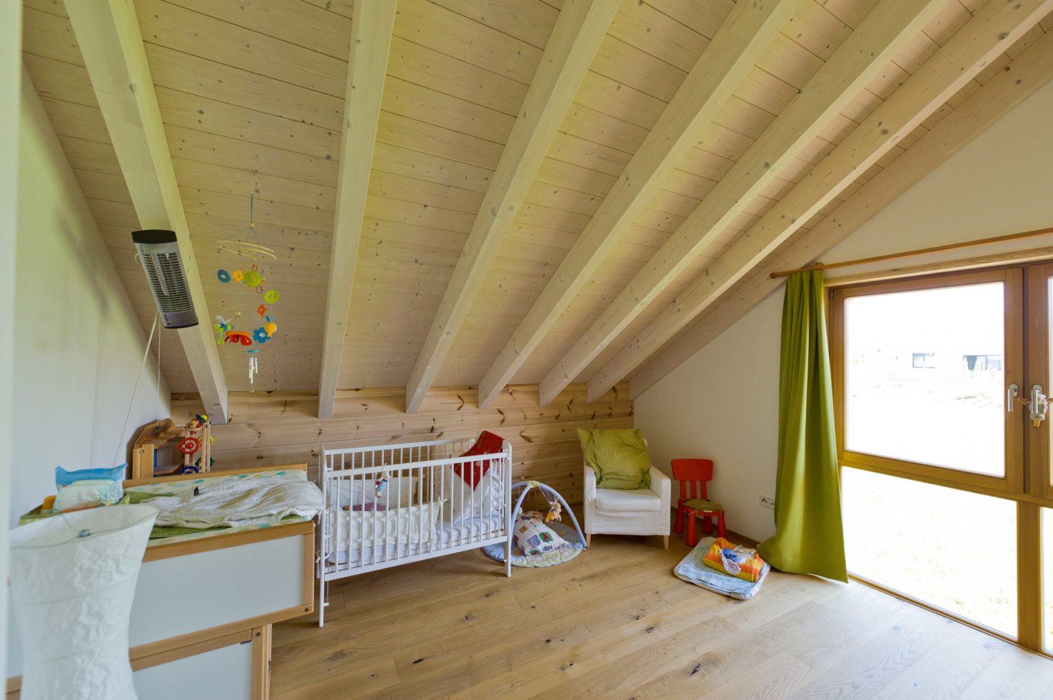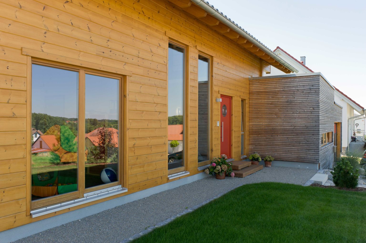 Ihr wärmeeffizientes, nachhaltig gebautes „Green Building“ beheizen die Berndts mit Hilfe einer Luft-Wärmepumpe und eines ganz modern und schlicht aussehenden Kaminofens; dieser zaubert immer ganz schnell urgemütliche Strahlungswärme ins Haus und der meditative Blick durch die Glasscheibe auf lodernde Flammen verhilft zu innerer Ruhe. Die so gut wie setzungsfreien Wände ihres Holzhauses sind absolut winddicht und halten die Wärme im Winter sehr gut drinnen, während es im Hochsommer nie zu Überhitzung im Innenbereich kommt. Das Holz scheint wie eine natürliche Klimaanlage zu wirken. Damit die natürliche Kiefernfarbe der Innenwände dauerhaft hell bleibt, wurden die Holzwände im gesamten Innenbereich mit einem UV-Schutzmittel behandelt und die Decken im Obergeschoss erhielten noch einen zusätzlichen Anstrich mit ganz wenigen, weißen Pigmenten – das hellt zusätzlich auf. Der Außenanstrich erfolgte indes in Holz farbener Lasur, damit kein Vergrauen des Holzes einsetzt. Die ganze Familie fühlt sich rundum wohl in ihrem individuellen Holzhaus. Die Hausherrin strahlt zum Abschied: