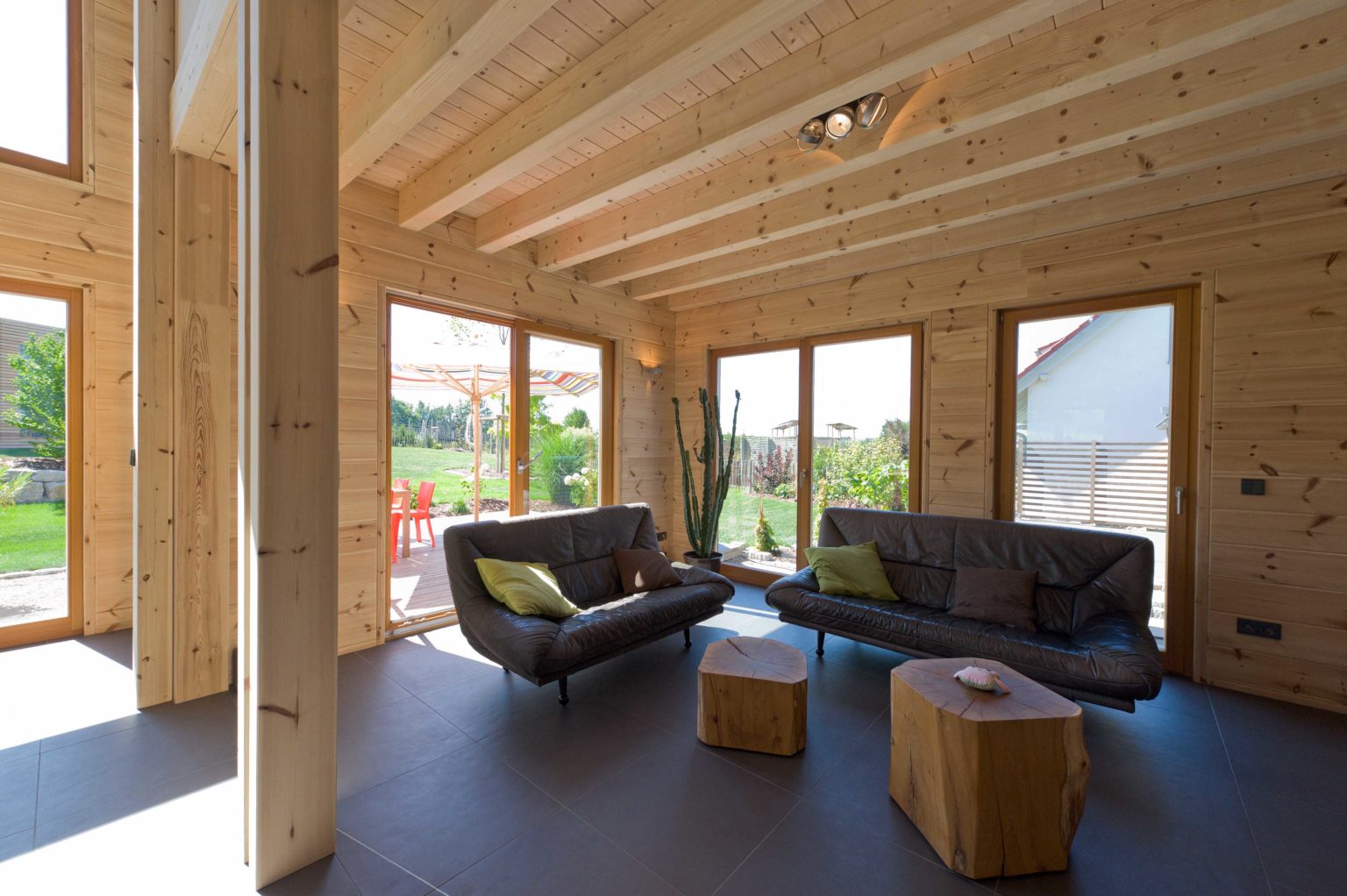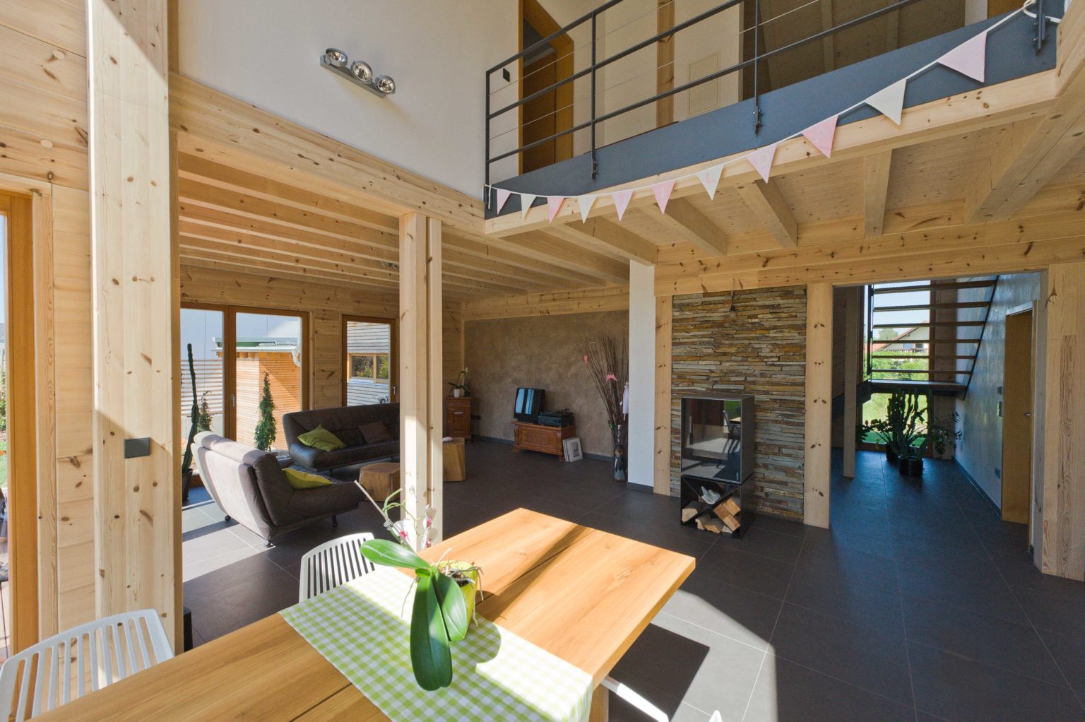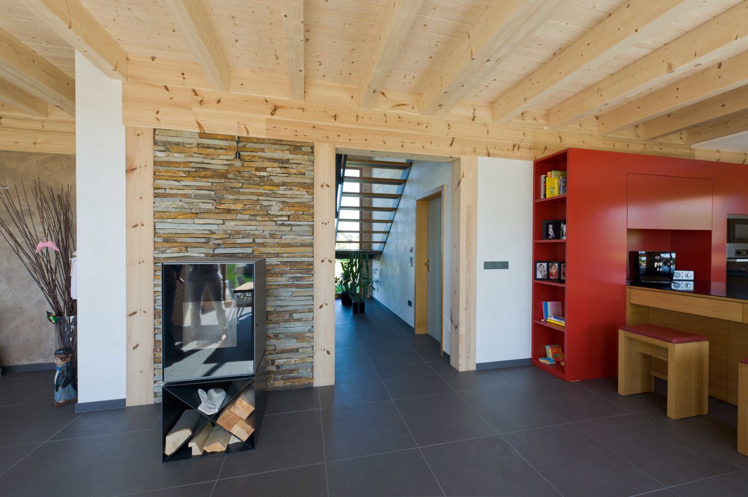 Mit Hilfe und unter Anleitung eines Richtmeisters der Holzhausfirma, der vier Tage vor Ort war, montierte Bruno Berndt die gelieferten Fertigwände aus dreifach laminierten, nordischen Kiefernbohlen selbst. Auch beim Einbau der Fenster arbeitete er mit dem Richtmeister zusammen. Das Dach ließ die Familie von einer ortsnahen Fachfirma decken und die Aufdachdämmung erledigte wiederum der Richtmeister. Den restlichen Innenausbau hat der handwerklich versierte Hausherr dann aber hauptsächlich in Eigenleistung erbracht. „Während dieser Ausbauphase haben wir die nicht tragenden Innenwände doch etwas verschoben. Auf den Plänen konnten wir uns das einfach nicht ganz so gut vorstellen, wie es dann tatsächlich in der Realität aussieht.“, gibt er zu. Jetzt sind es eher mehr Trennwände geworden als ursprünglich vorgesehen. Auch die Stützen im Wohnbereich sind erst nachträglich dazu gekommen – sie haben eine rein optische, den Raum gliedernde Funktion und keine stützende.